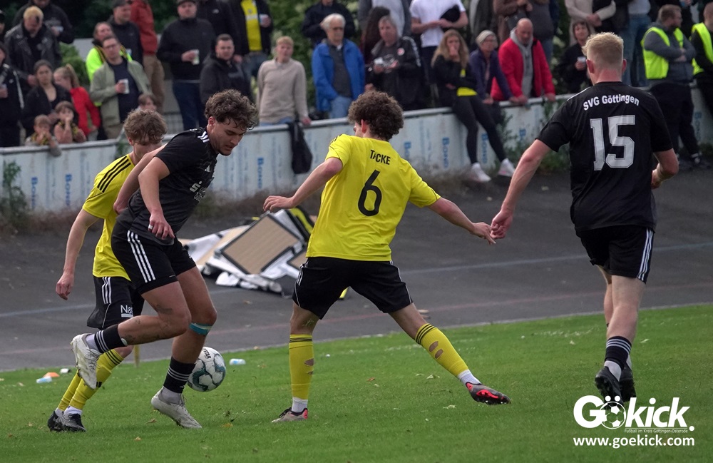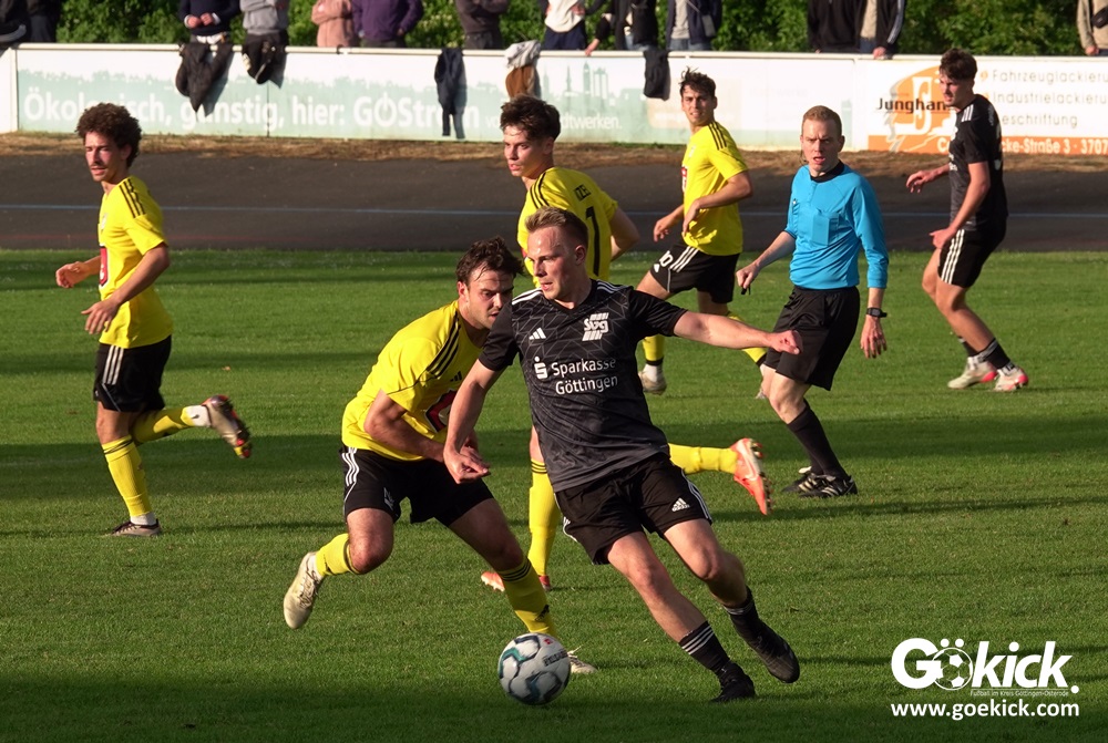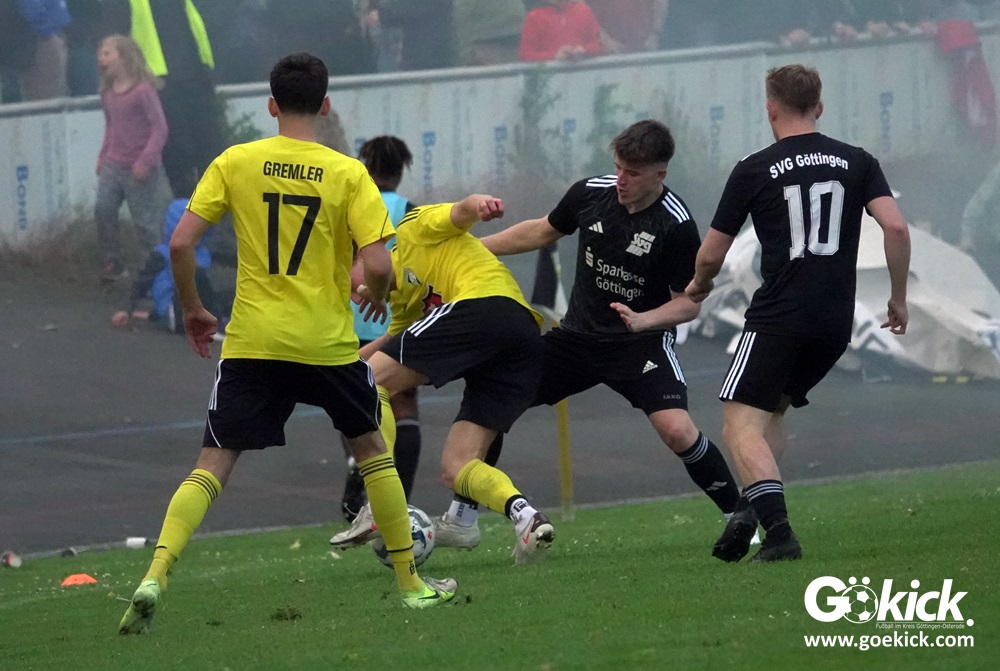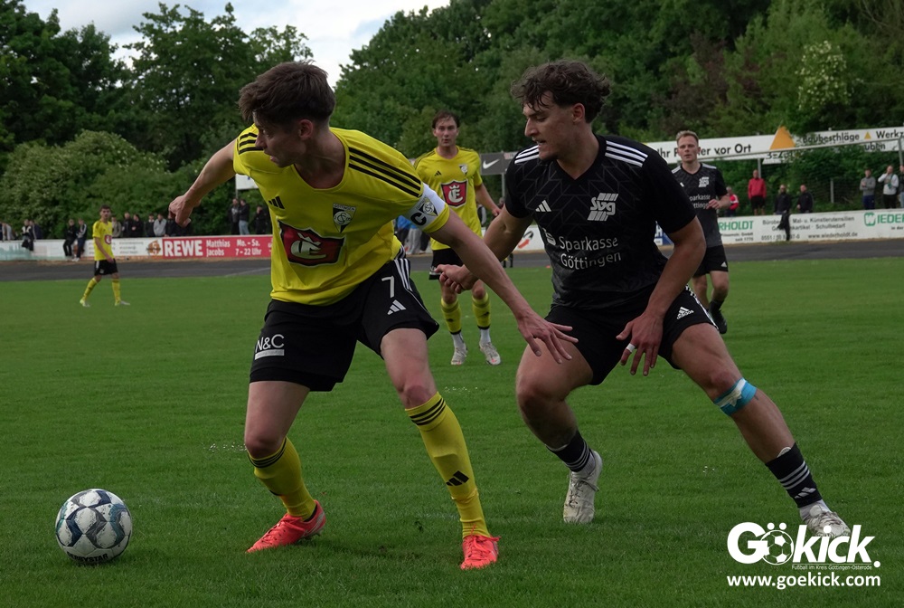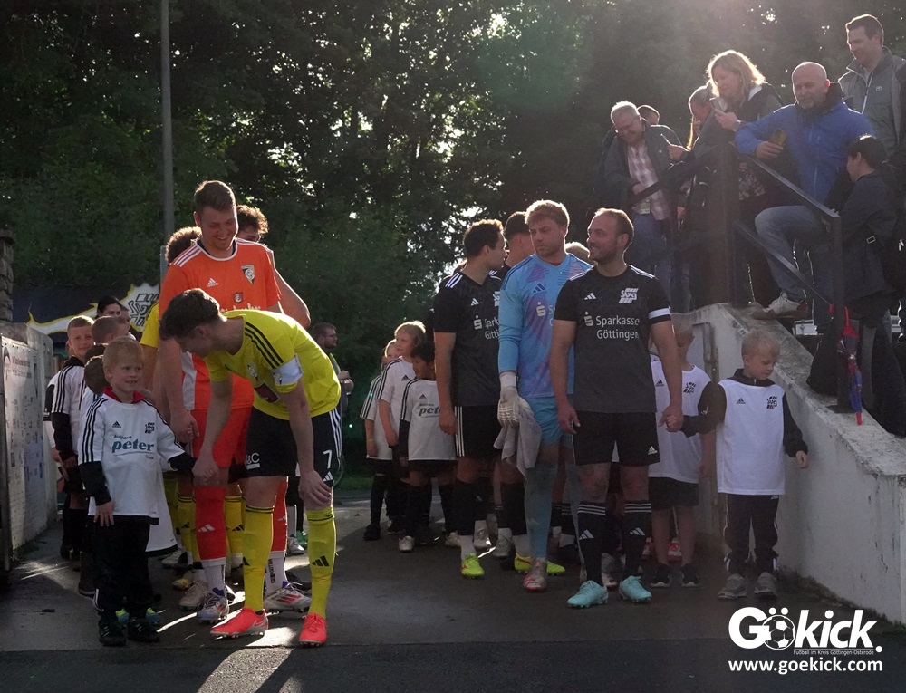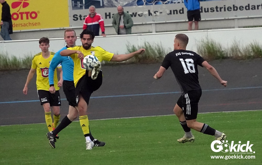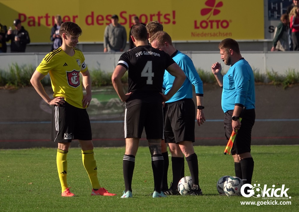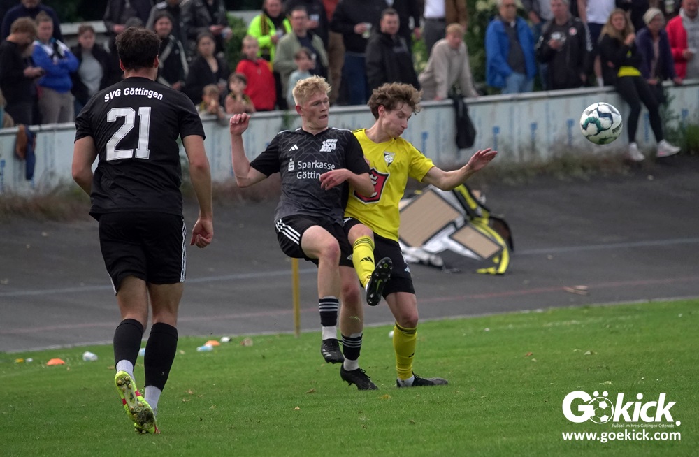 Pünktlich zum Anpfiff der Partie endete der Regen, der Göttingen am gesamten Tag im festen Griff hatte. Die SVG startete furios. Nach dem ersten Eckball von Janis Kniepen in der zweiten Minute köpfte Steffen Doll das Spielgerät mustergültig zum 1:0 in die Maschen des Gästetores. Doch fortan übernahm das Maschpark-Team die Regie über die Partie. SVG-Torwart Marvin Brelage war bis zur 39. Minute der Mann, der gemeinsam mit dem Aluminium des SVG-Tores mit seinen Paraden die SVG-Führung verteidigte. Dann war auch er machtlos, als 05-Kapitän Jannis Wenzel nach Vorlage von Jannes Paul Gremler den Ball zum längst überfälligen Ausgleich aus zwei Metern über die Linie drückte.