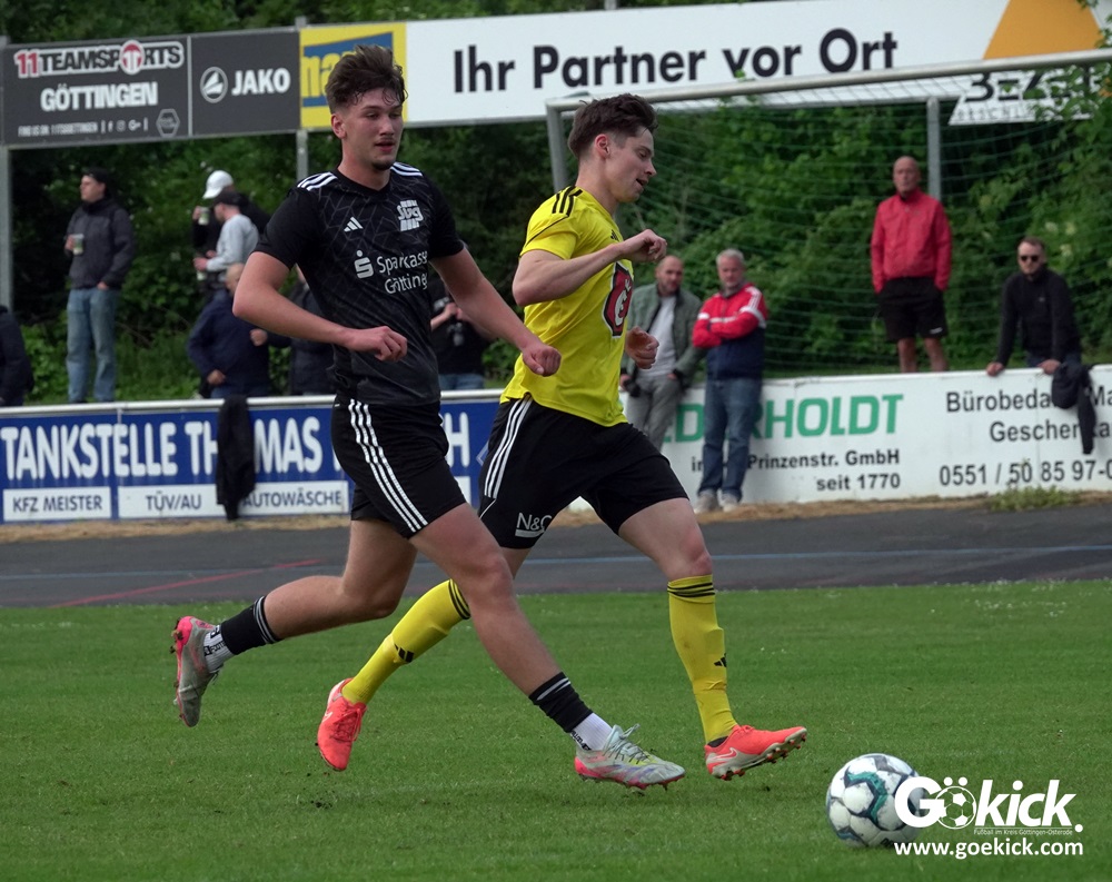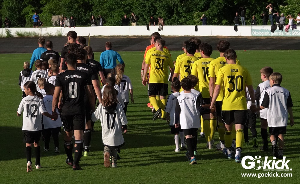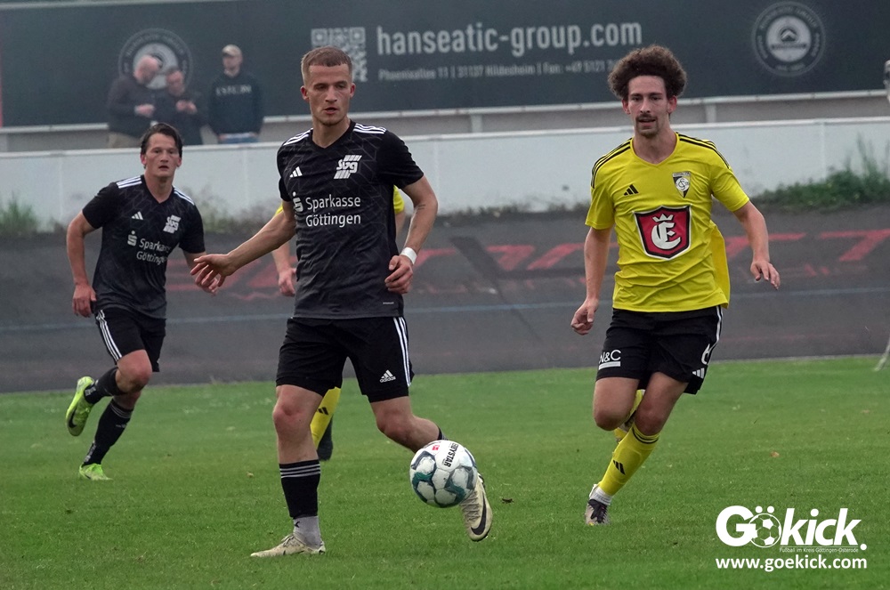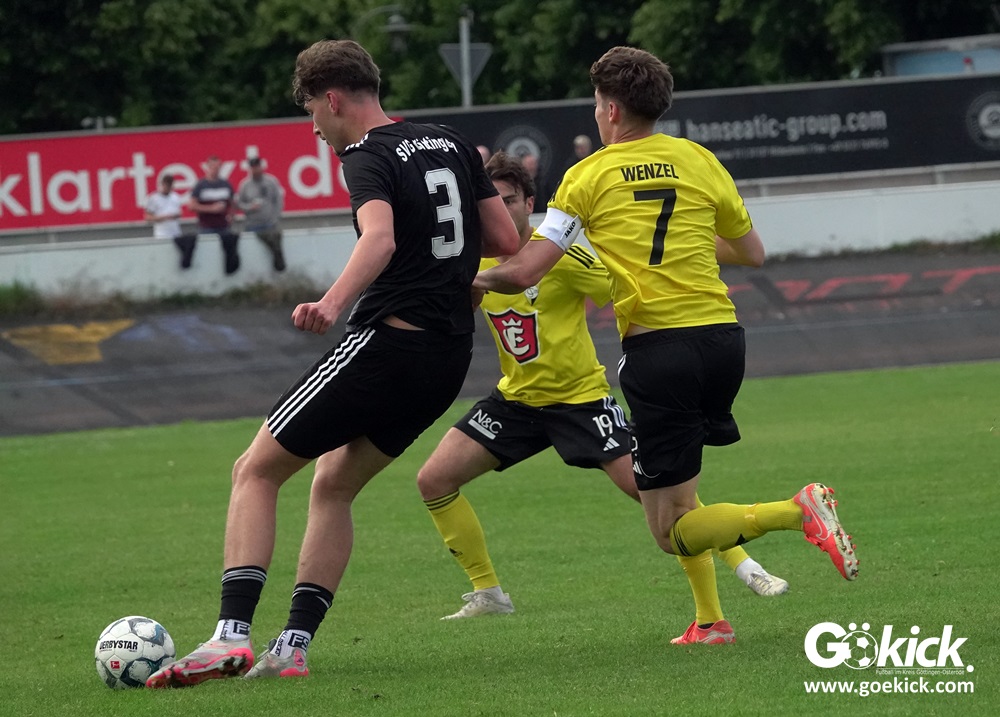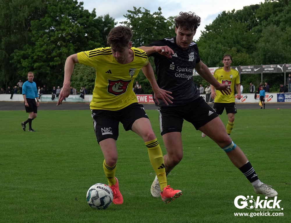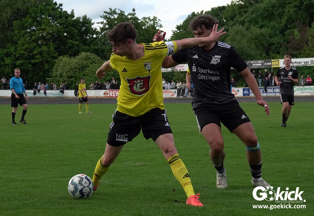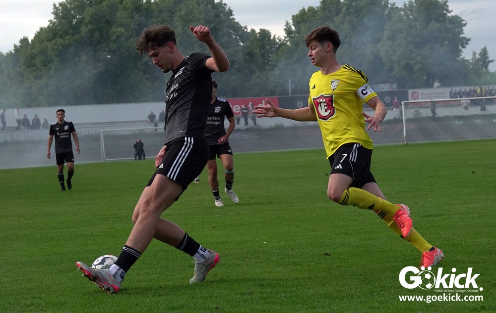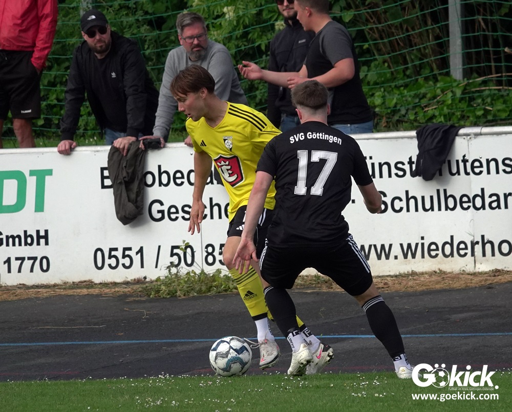 Pünktlich zum Anpfiff der Partie endete der Regen, der Göttingen am gesamten Tag im festen Griff hatte. Die SVG startete furios. Nach dem ersten Eckball von Janis Kniepen in der zweiten Minute köpfte Steffen Doll das Spielgerät mustergültig zum 1:0 in die Maschen des Gästetores. Doch fortan übernahm das Maschpark-Team die Regie über die Partie. SVG-Torwart Marvin Brelage war bis zur 39. Minute der Mann, der gemeinsam mit dem Aluminium des SVG-Tores mit seinen Paraden die SVG-Führung verteidigte. Dann war auch er machtlos, als 05-Kapitän Jannis Wenzel nach Vorlage von Jannes Paul Gremler den Ball zum längst überfälligen Ausgleich aus zwei Metern über die Linie drückte.