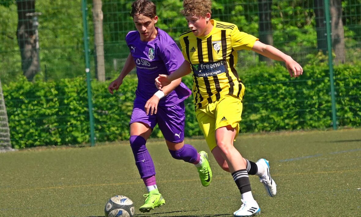 Im Göttinger Derby in der B-Jugend-Bezirksliga standen sich am vergangenen Samstag die U16-Teams des JFV 37 Göttingen und des 1. SC Göttingen 05 auf dem Kunstrasenplatz des Göttinger Jahnsportparks gegenüber. Nach interessanten 80 Minuten gewann der Gast vom Maschpark mit 3:2 (2:0). Auch das Hinspiel hatte 05 gewonnen – im Oktober glatt 5:0. Das lila Team bleibt mit 21 Punkten Vierter der Spielklasse. Die schwarz-gelbe Mannschaft bleibt mit zehn Punkten mehr auf dem Konto Tabellen-Zweiter mit vier Punkten Rückstand zum Spitzenreiter TuSpo Petershütte, der aber ein Spiel weniger ausgetragen hat. Beim direkten Duell der beiden führenden Teams am 24. Mai dürfte es womöglich noch spannend werden.