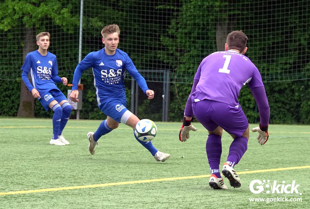 Die Mannschaften begannen sofort mit offenem Visier nach vorn zu spielen. Der ersatzgeschwächte Gastgeber war spielbestimmend, jedoch anfällig für Konter der Gäste. Lennart Jonathan Perczynski erzielte bereits nach vier Minuten die Führung für den RSV. Doch nur zwei Minuten später glich der Gast durch Dominik Jäger aus. Mit einem traumhaften Freistoß aus 23 Metern gelang Milo Apel in der 17. Spielminute die Führung für die Gäste (Video) vorbei an der Mauer der Hausherren. Und in der 37. Spielminute erhöhte Milo Apel mit seinem zweiten Tagestreffer per Kopf auf 3:1 nach Maßflanke von Jonas Müller. Bis zum Halbzeitpfiff des gewohnt souverän leitenden Schiedsrichters Rainer Nickel gab es zwar keine weiteren Treffer, allerdings noch ein Ereignis, das großen Einfluss auf das folgende Spielgeschehen haben sollte: In der 43. Spielminute musste Gäste-Verteidiger Marcel Avon nach wiederholtem Foulspiel den Platz mit Gelb-Roter Karte verlassen. Mit der 3:1-Fühung für die Gäste wurden die Seiten gewechselt.