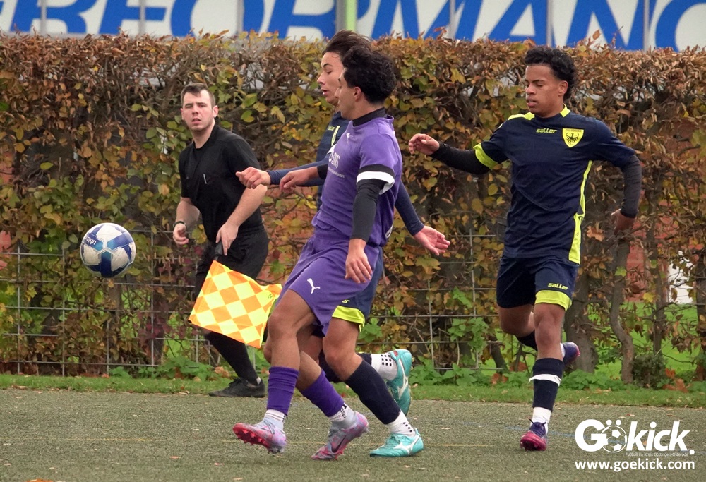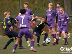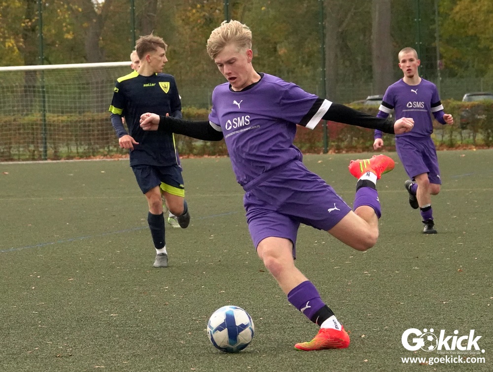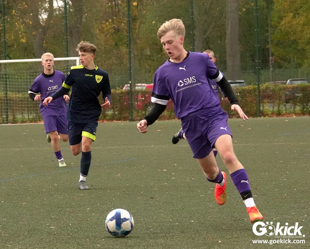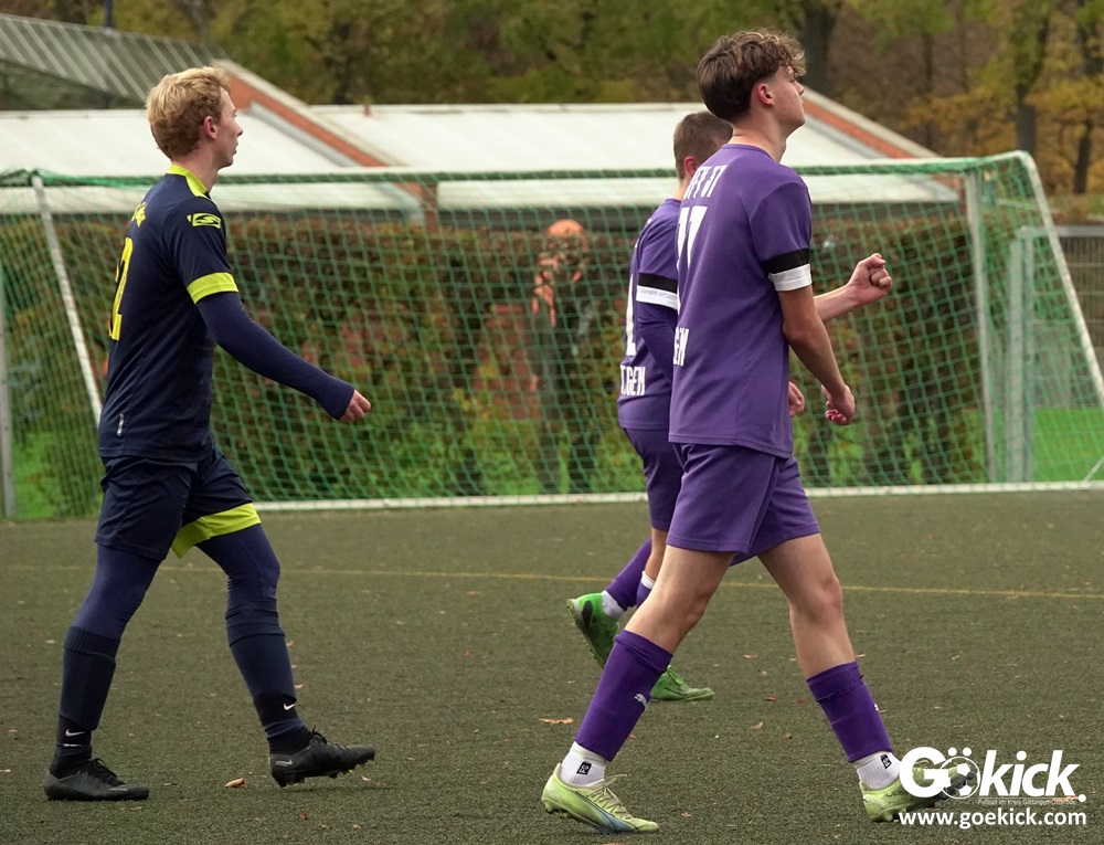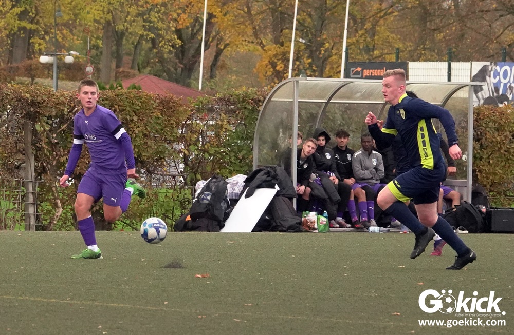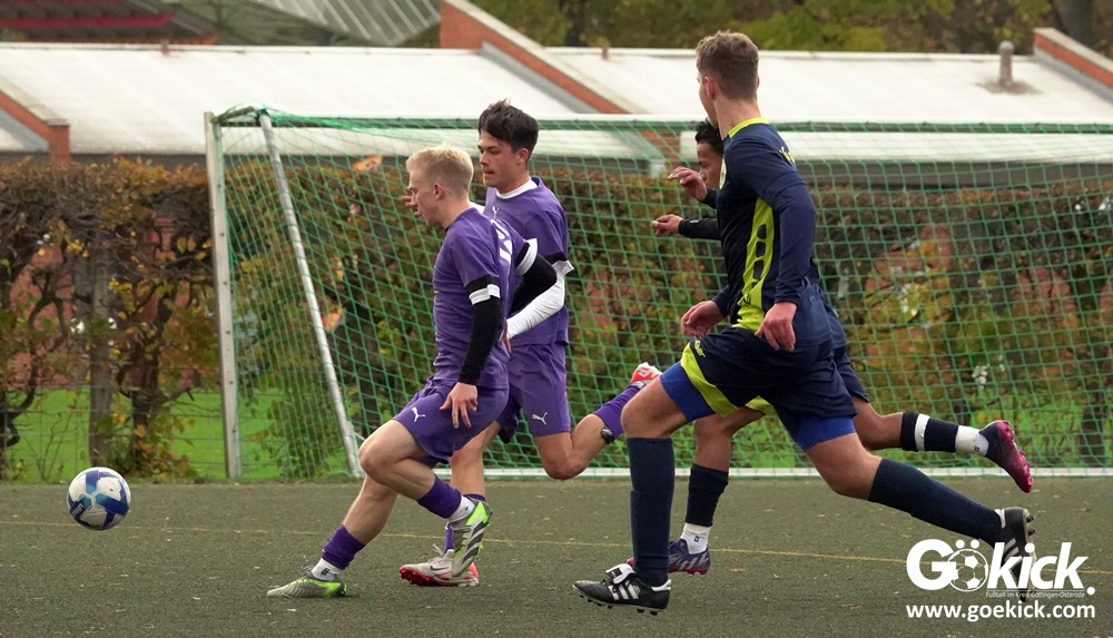 Perrin Willmann traf bereits nach acht Minuten zum 1:0 für die Gastgeber. Nur drei Minuten später erhöhte Carl Frieder Behrendt auf 2:0. Das 3:0 war Tom Brille nach 26 Minuten vorbehalten. Der nach 34 Minuten eingewechselte Tyler-Jay Lux bedankte sich bei seinen Trainern nach 41 Minuten mit dem 4:0. Nur eine Minute später sorgte Erik Mädler für das 5:0 für das lila Team. Und noch vor der Pause traf Tyler-Jay Lux mit seinem zweiten Treffer zum 6:0-Halbzeitstand.