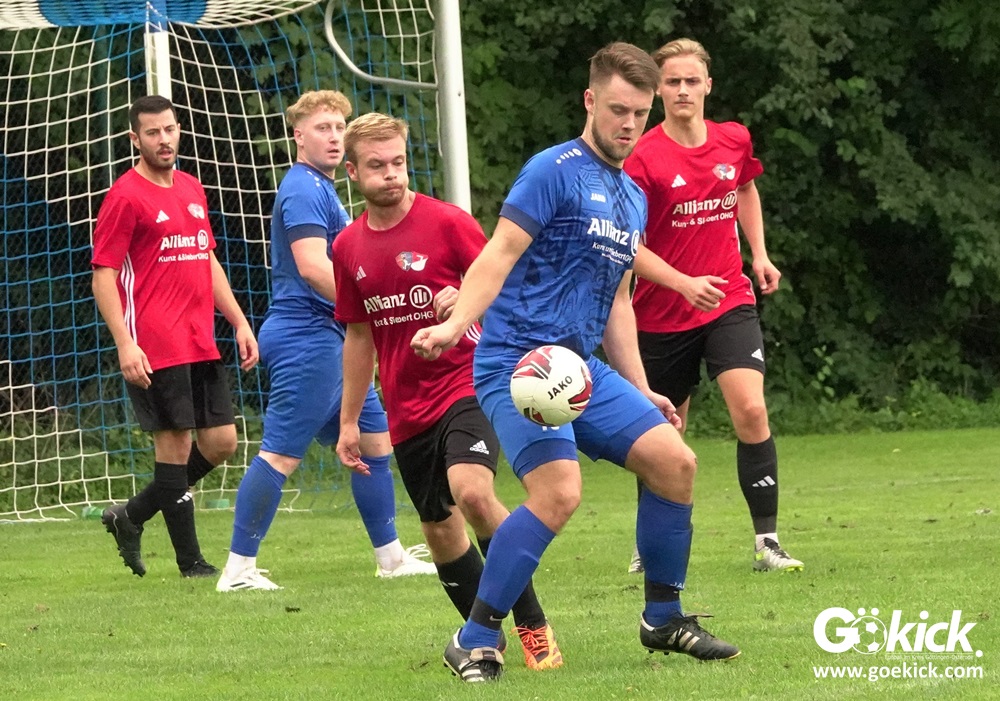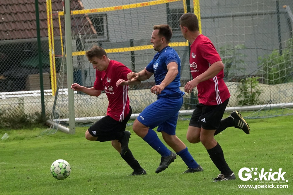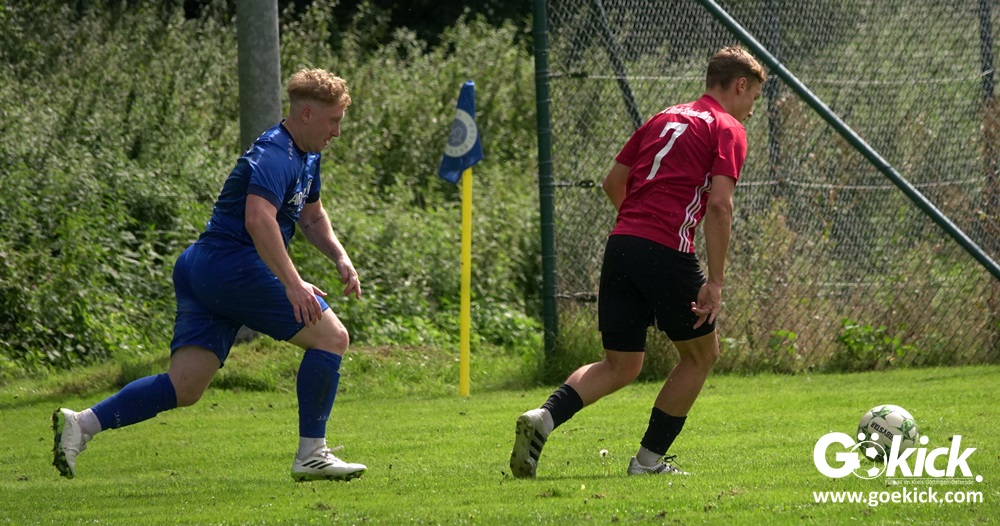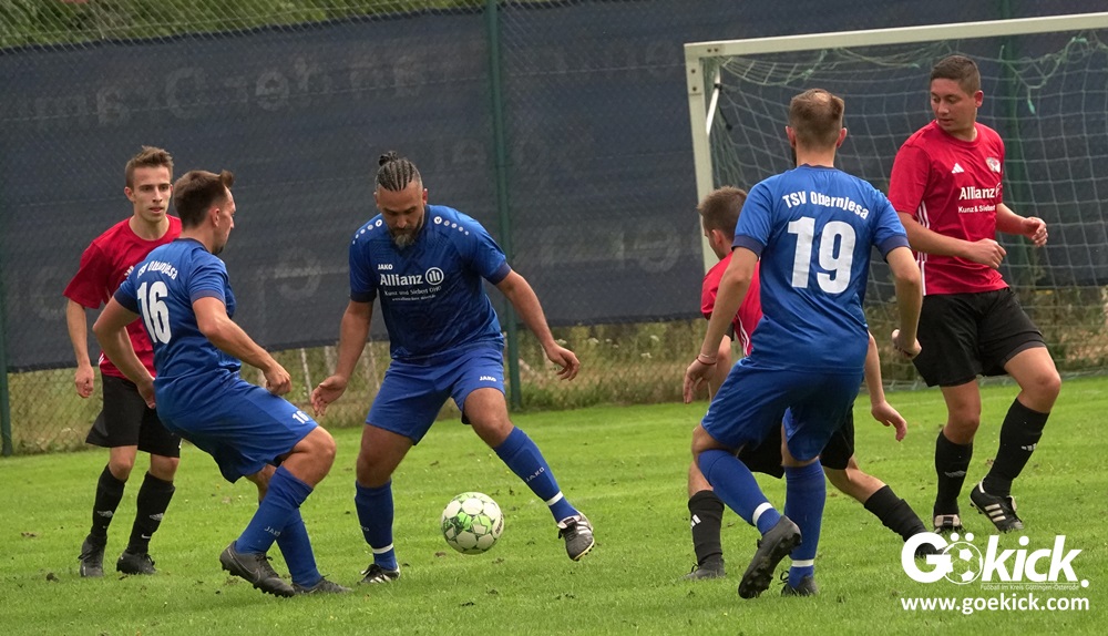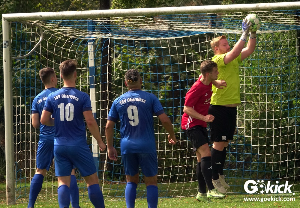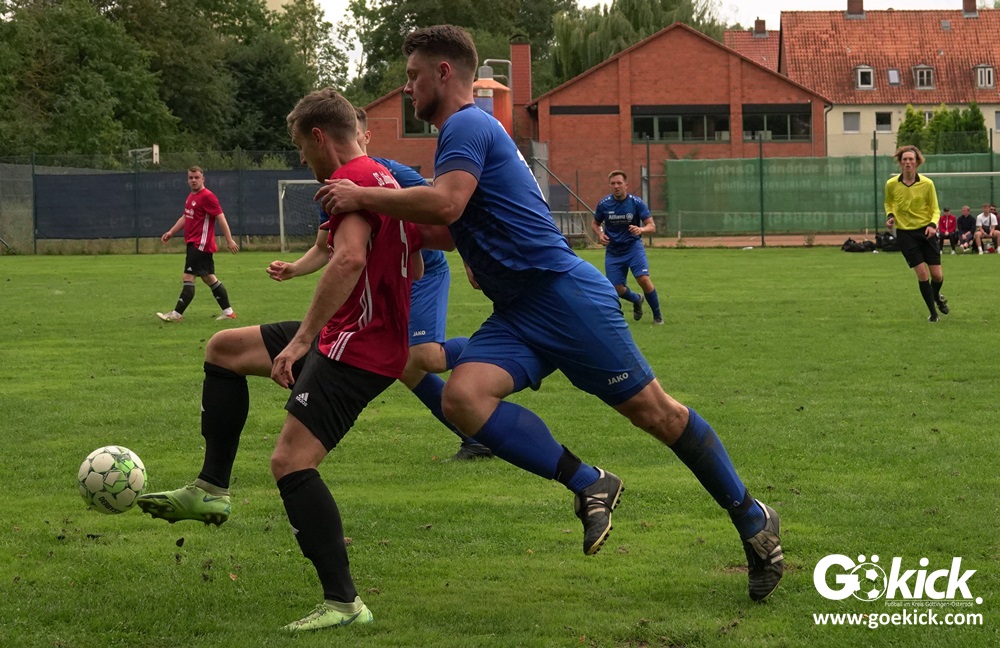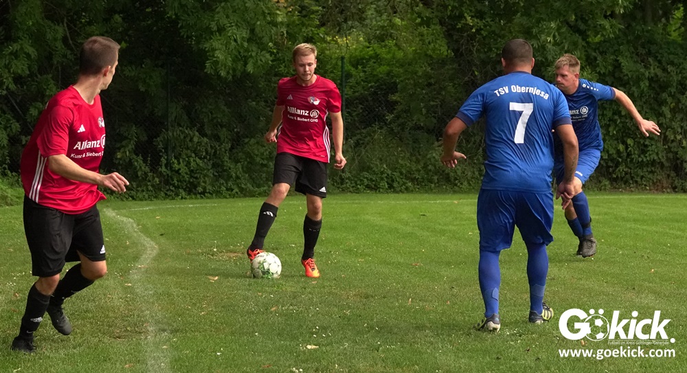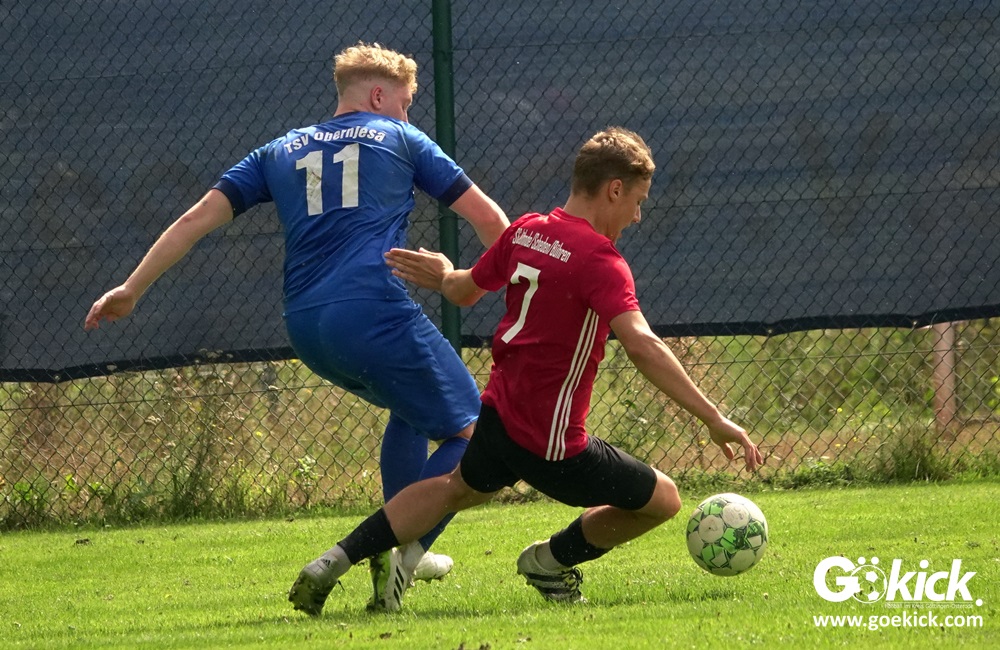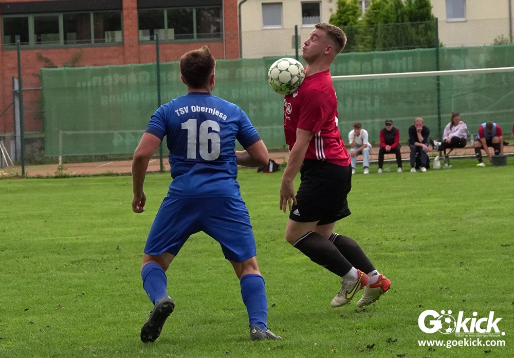 Der Gastgeber brachte nach 11 Minuten seinen Torjäger, den ehemaligen Oberliga-Spieler Jonas Grüneklee, in Stellung, der Niklas Lachmann im Tor der Gäste zur 1:0-Führung tunnelte. Anschließend vergab der Aufsteiger mehrere gute Möglichkeiten, die Führung auszubauen, Grüneklee setzte einen Ball an die Querlatte des Gäste-Tores. Mit zunehmender Spielzeit befreite sich der Gast allmählich und sorgte für Beschäftigung von Florian Koch im Tor der Hausherren. In der 43. Spielminute zeigte Schiedsrichter Felix Renneberg nach einem Foul im Obernjesa-Strafraum auf den Elfmeterpunkt. Der eingewechselte Sascha Fuchs traf sicher zum Ausgleich.