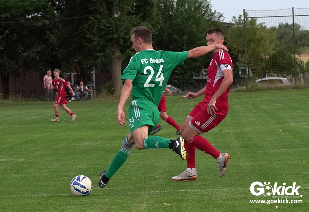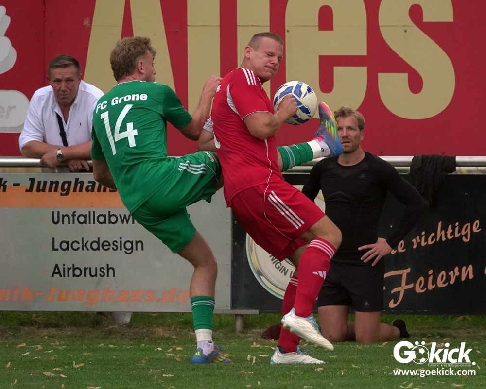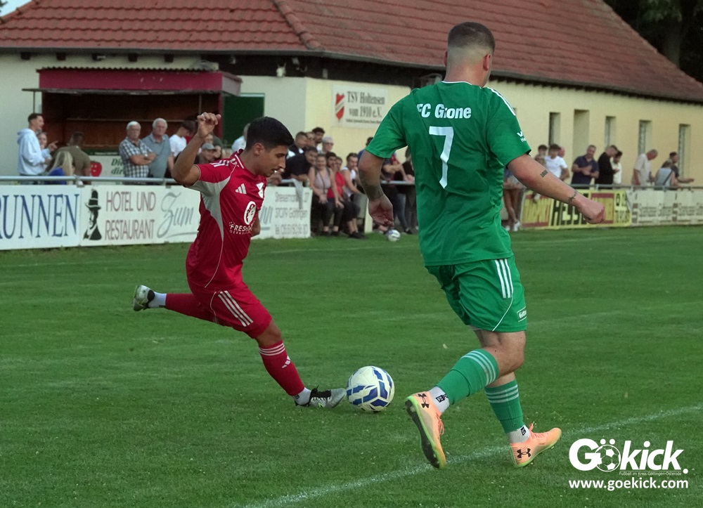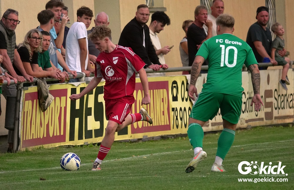 In einer ausgeglichenen ersten Halbzeit begegneten sich beide Teams auf Augenhöhe. Sowohl Holtensen als auch Grone erspielten sich zwei klare Möglichkeiten, scheiterten jedoch jeweils am gegnerischen Torhüter oder an der eigenen Präzision. Vor allem in der Schlussviertelstunde vor der Pause übernahmen die Gäste zunehmend das Kommando, angetrieben vom agilen Nico Chrustel auf der rechten Außenbahn. Tore blieben jedoch aus.