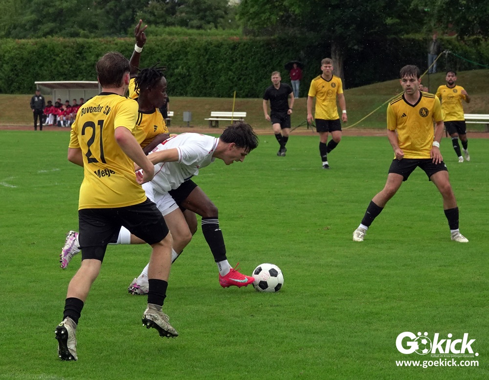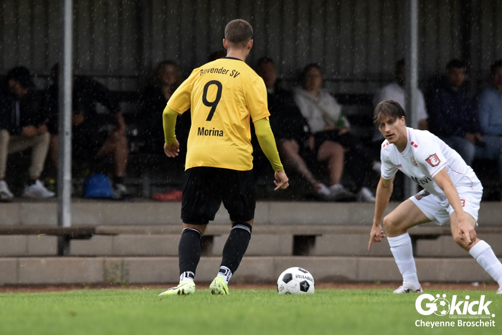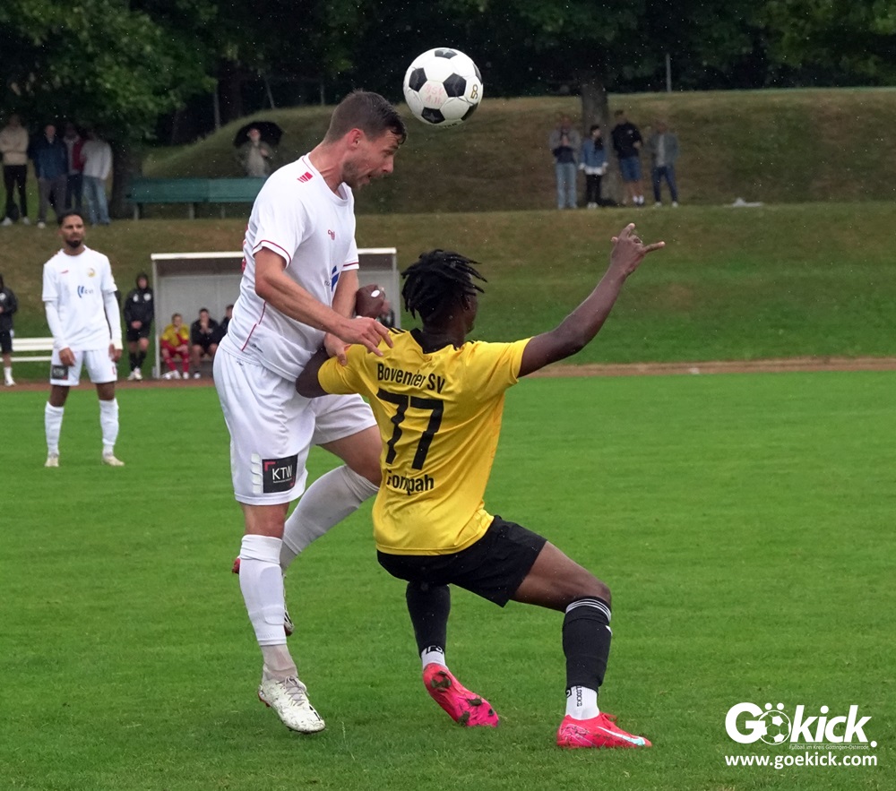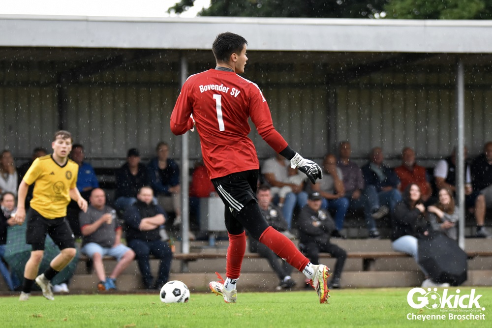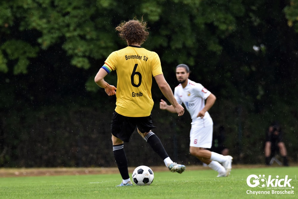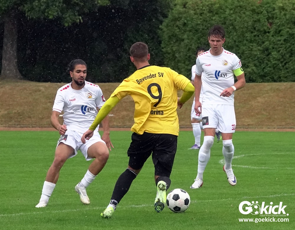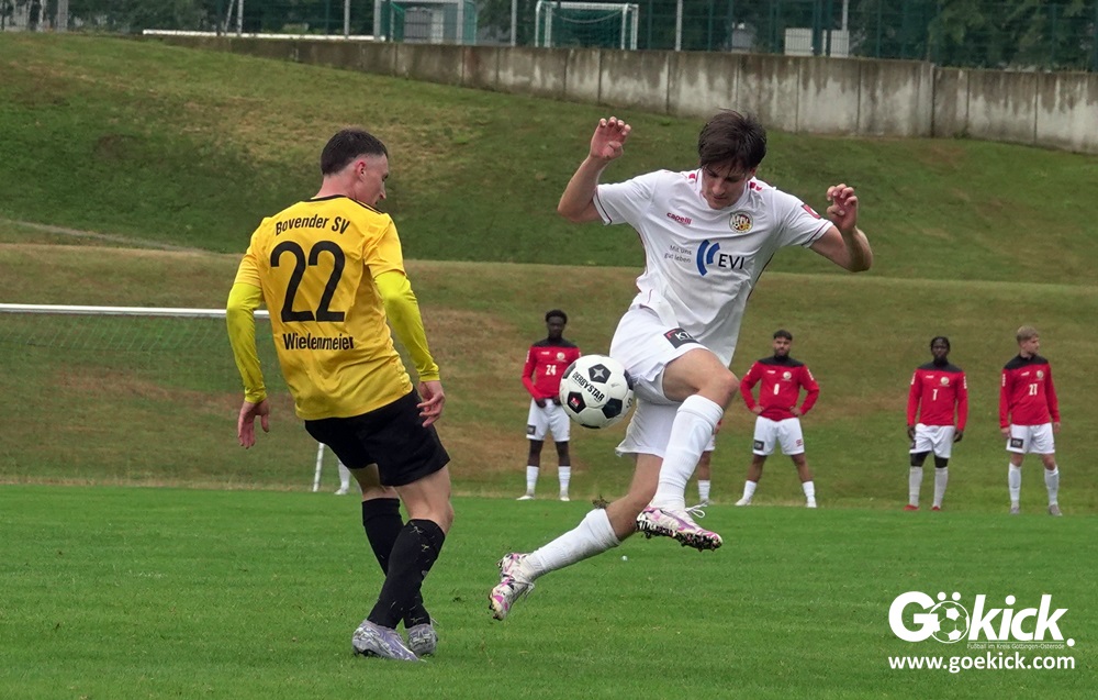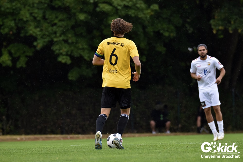 Der Oberligist war technisch überlegen und schlug ein hohes Tempo an. Entsprechend musste der Gastgeber oft hinterher laufen. Doch die Defensive stand lange Zeit sicher. In der 20. Spielminute jedoch brach der Gast über seine linke Angriffsseite durch und Mick Peter Gudra, beim FC Schalke 04 ausgebildet und im Besitz von Zweitliga-Erfahrung, vollendete im Zentrum, fünf Meter vor Bovendens neuem Schlussmann Theodor Bachmann sicher. Doch für mehr reichte es nicht für die Gäste in der verregneten ersten Halbzeit. Beim Spielstand von 0:1 wurden die Seiten gewechselt.