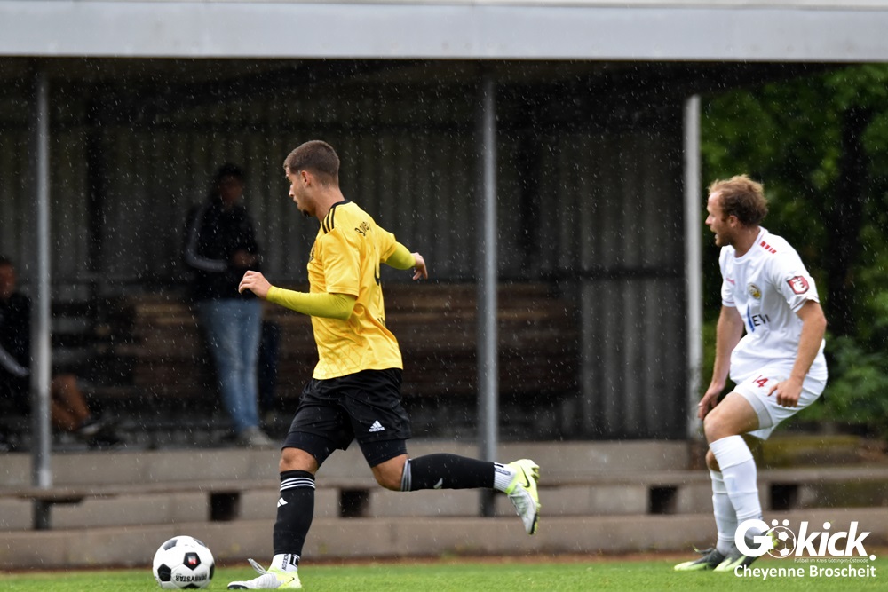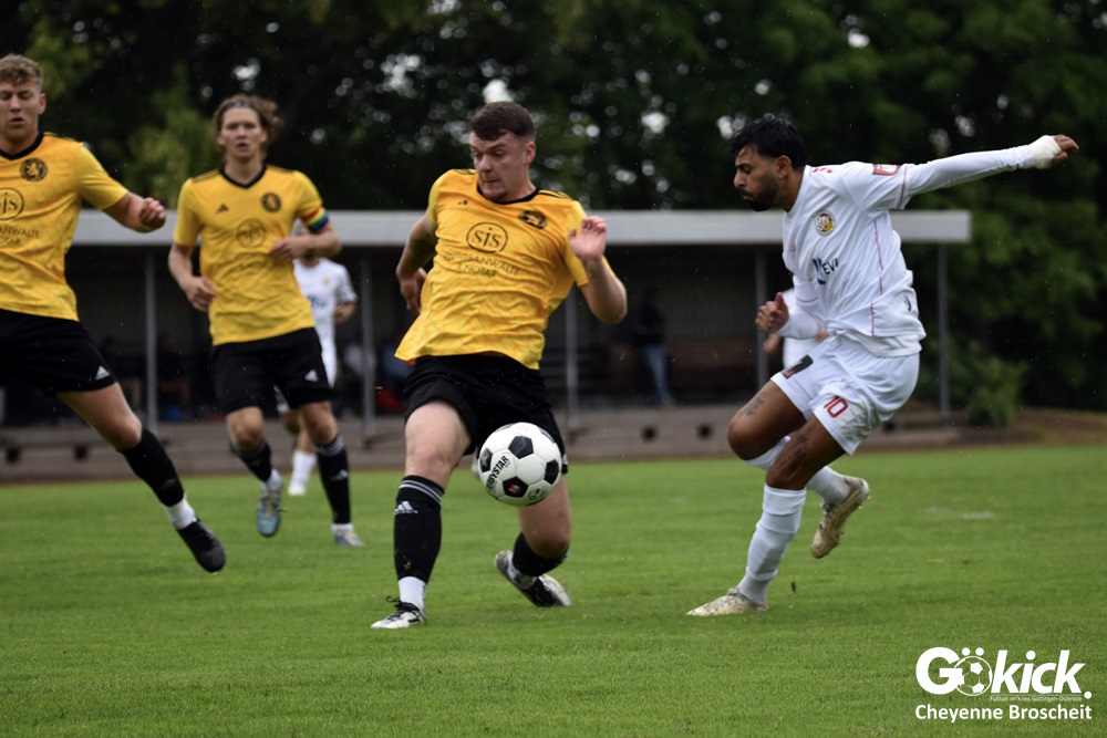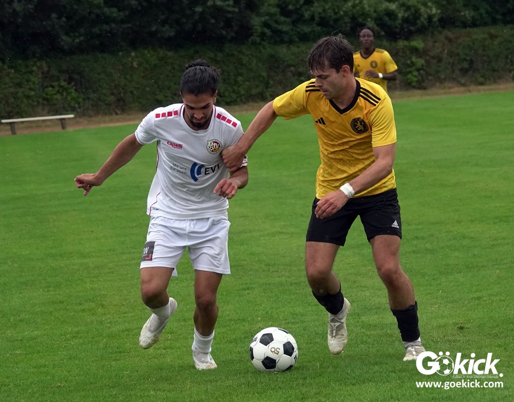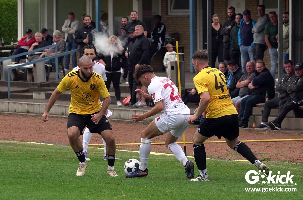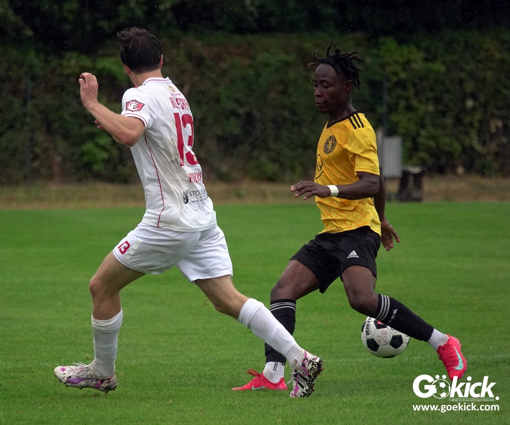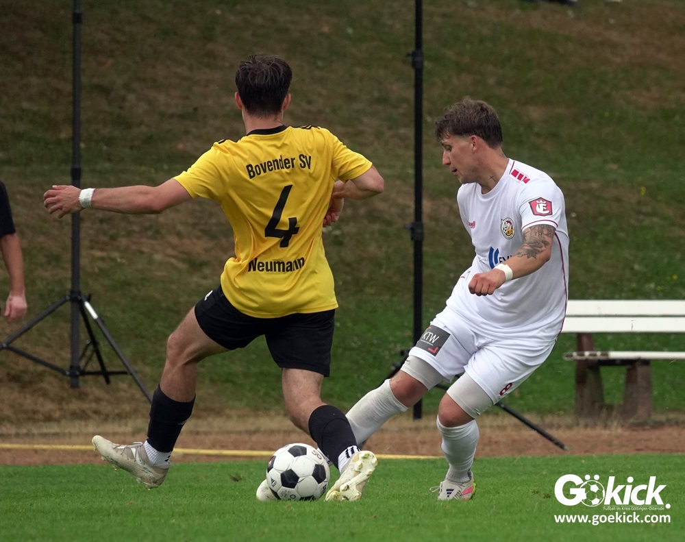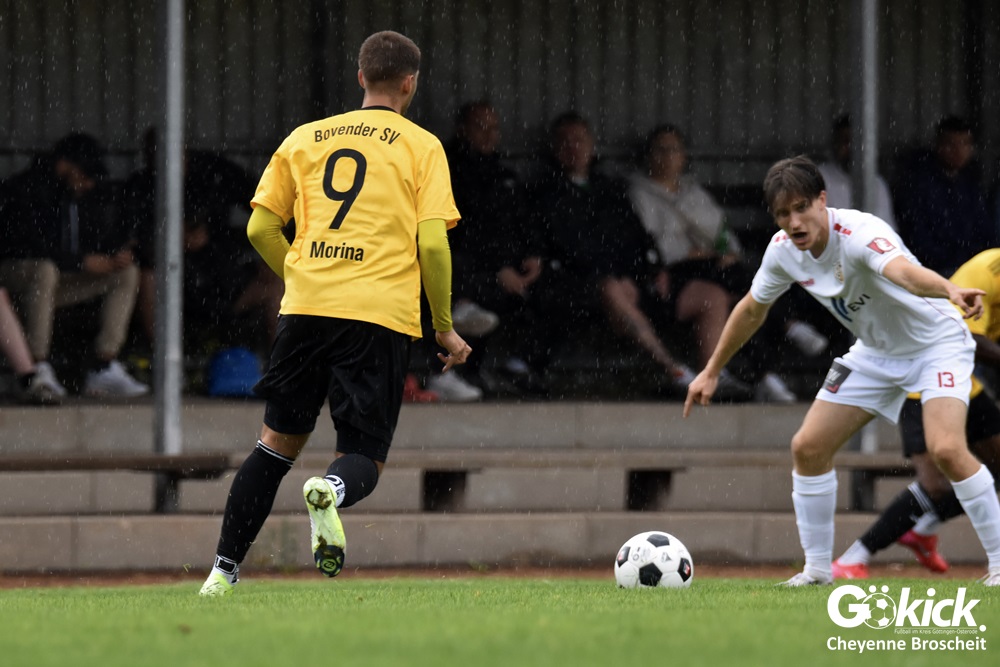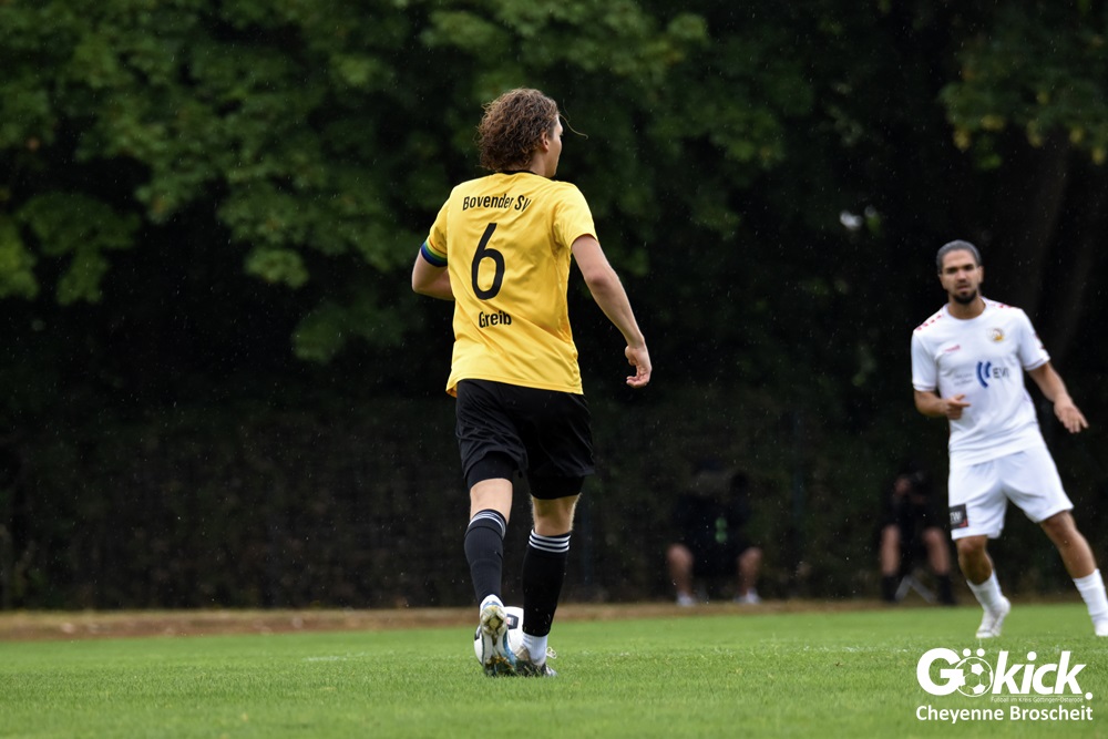 Der Oberligist war technisch überlegen und schlug ein hohes Tempo an. Entsprechend musste der Gastgeber oft hinterher laufen. Doch die Defensive stand lange Zeit sicher. In der 20. Spielminute jedoch brach der Gast über seine linke Angriffsseite durch und Mick Peter Gudra, beim FC Schalke 04 ausgebildet und im Besitz von Zweitliga-Erfahrung, vollendete im Zentrum, fünf Meter vor Bovendens neuem Schlussmann Theodor Bachmann sicher. Doch für mehr reichte es nicht für die Gäste in der verregneten ersten Halbzeit. Beim Spielstand von 0:1 wurden die Seiten gewechselt.