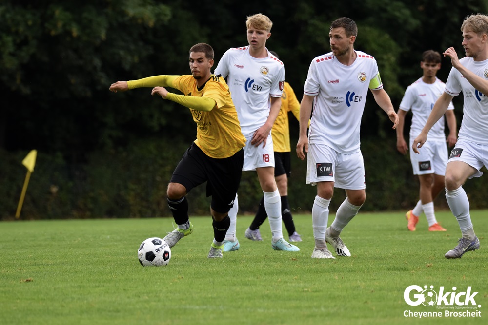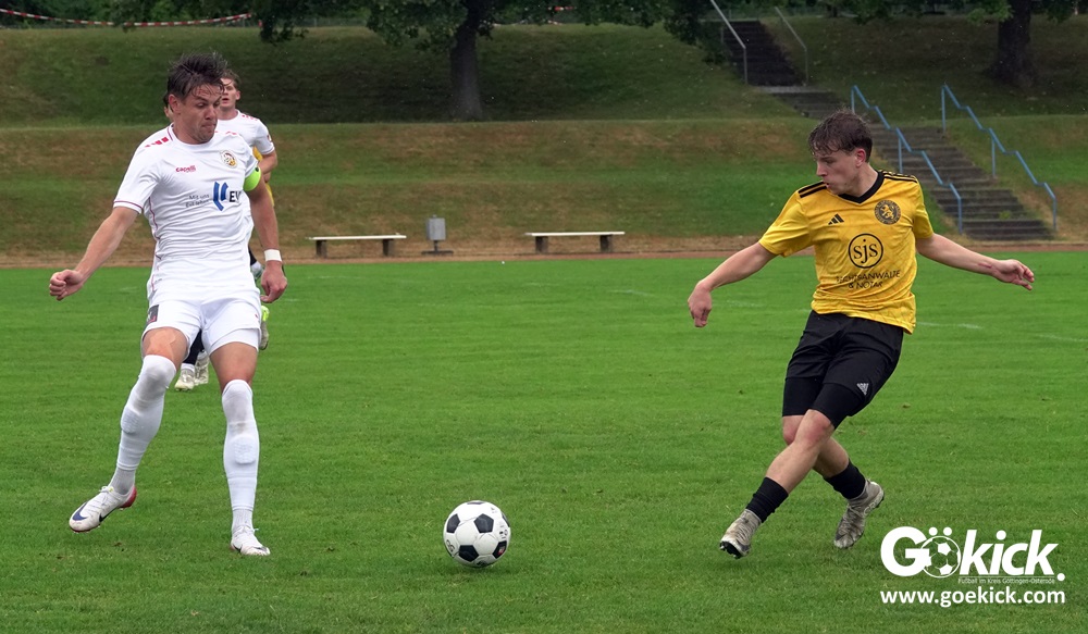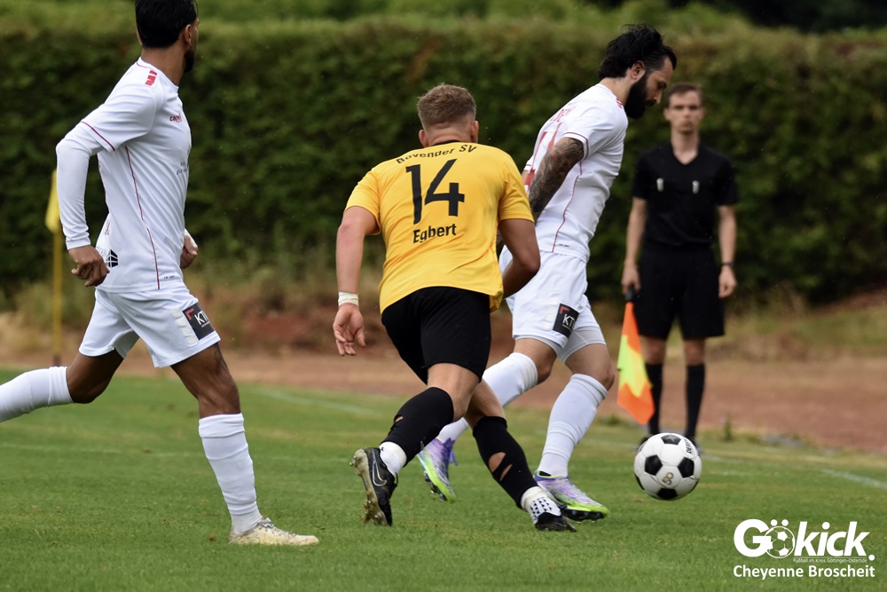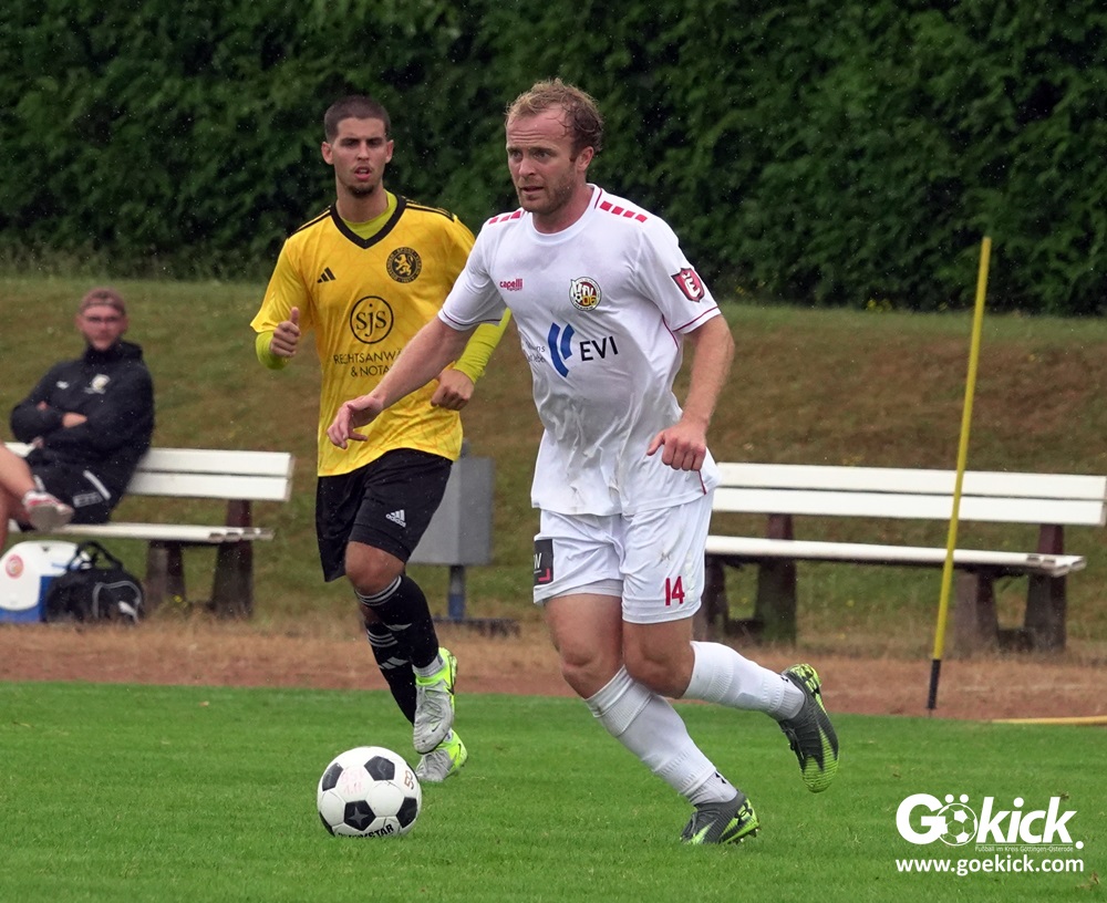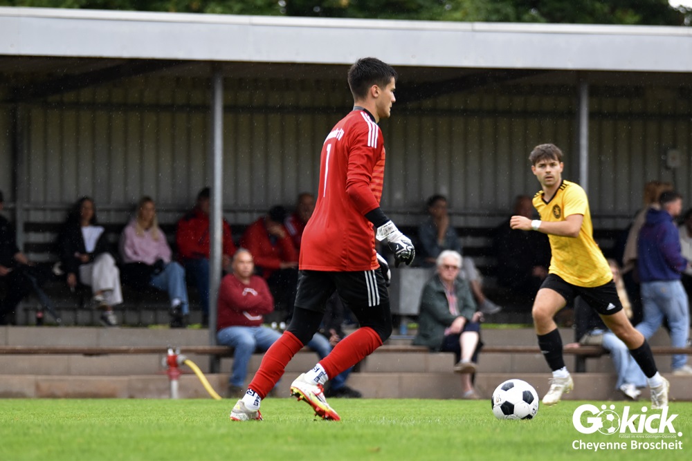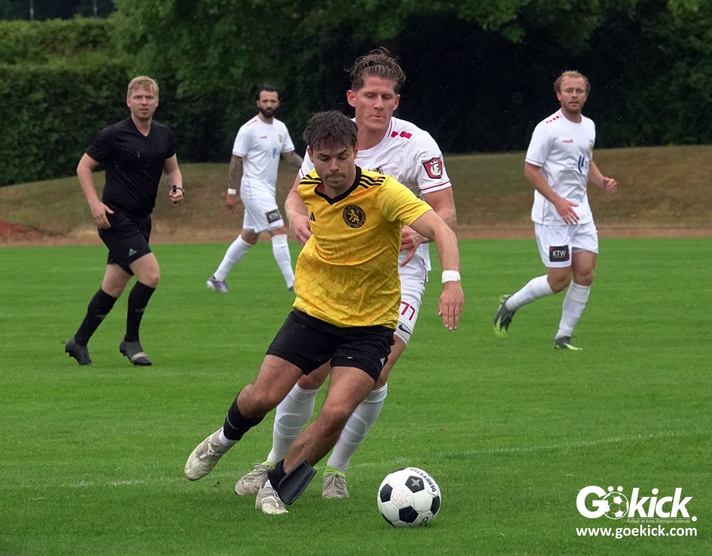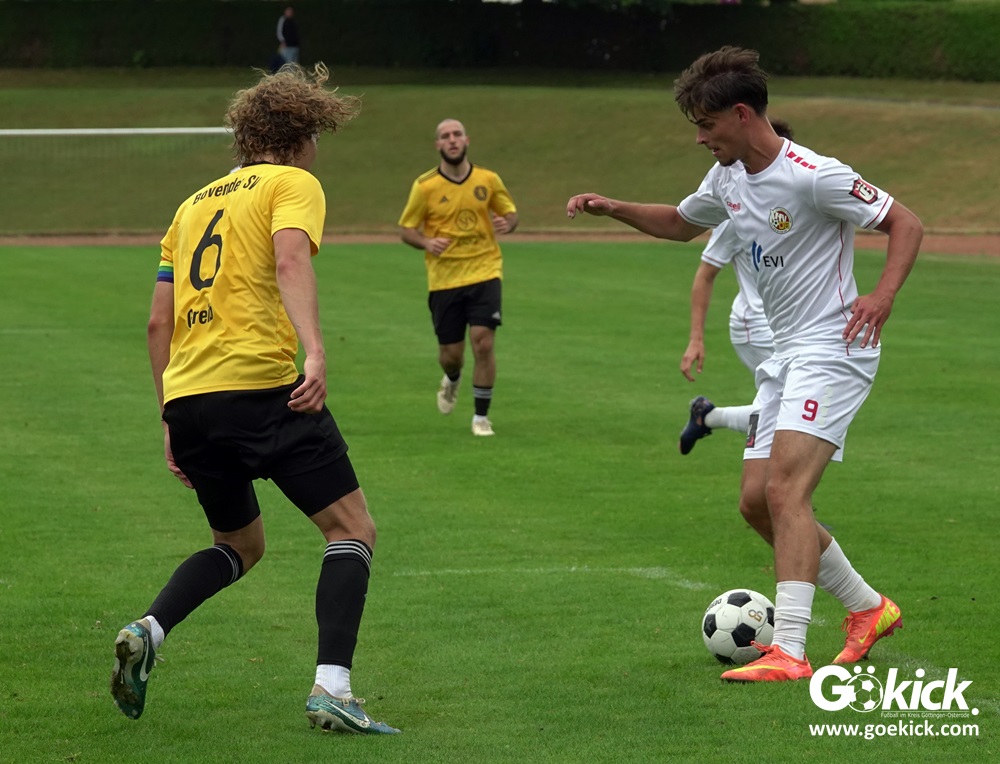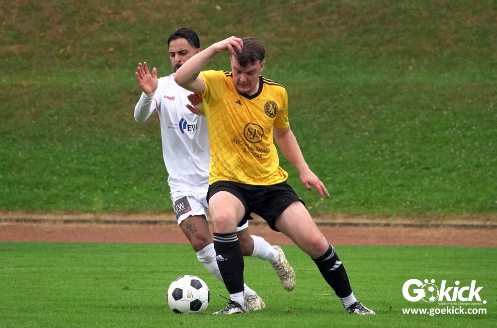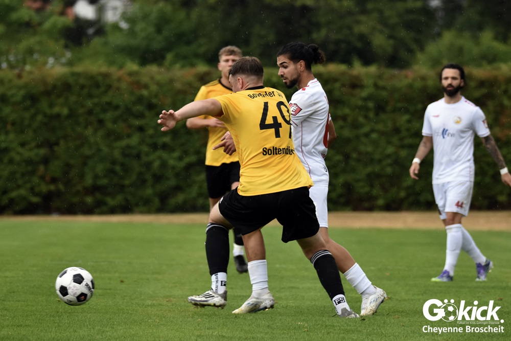 Der Oberligist war technisch überlegen und schlug ein hohes Tempo an. Entsprechend musste der Gastgeber oft hinterher laufen. Doch die Defensive stand lange Zeit sicher. In der 20. Spielminute jedoch brach der Gast über seine linke Angriffsseite durch und Mick Peter Gudra, beim FC Schalke 04 ausgebildet und im Besitz von Zweitliga-Erfahrung, vollendete im Zentrum, fünf Meter vor Bovendens neuem Schlussmann Theodor Bachmann sicher. Doch für mehr reichte es nicht für die Gäste in der verregneten ersten Halbzeit. Beim Spielstand von 0:1 wurden die Seiten gewechselt.