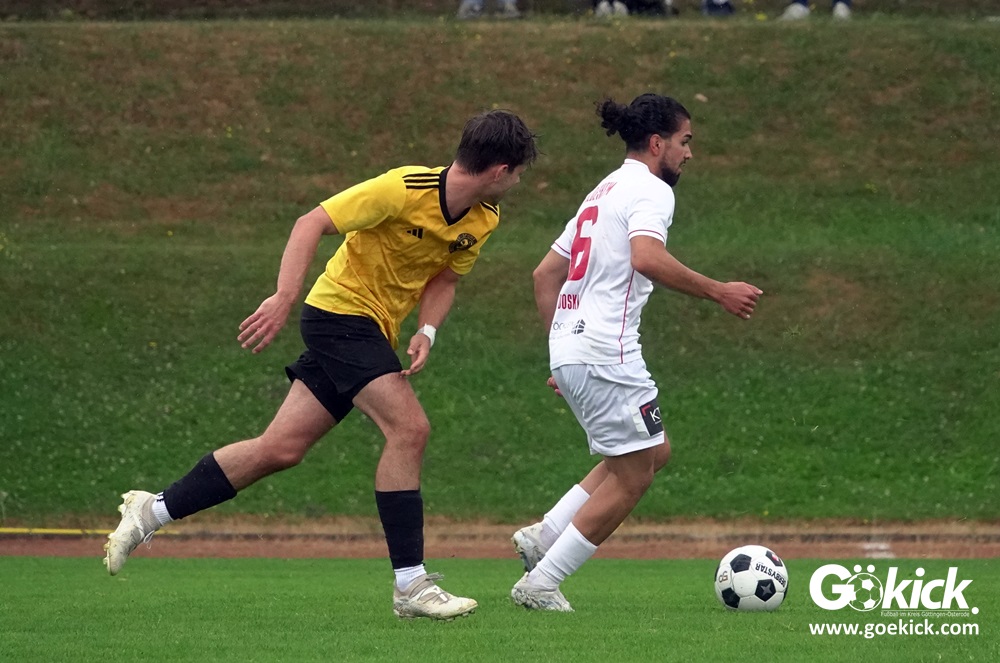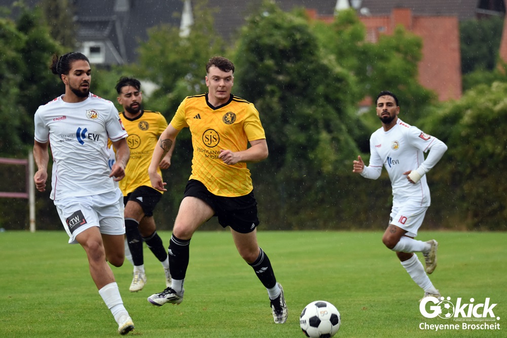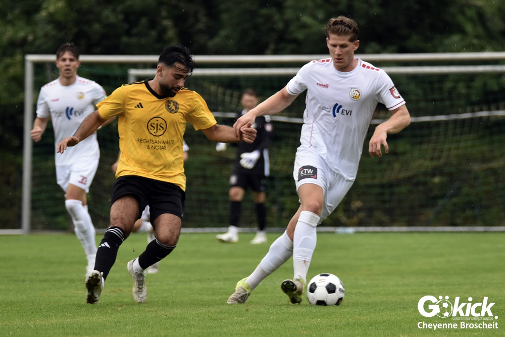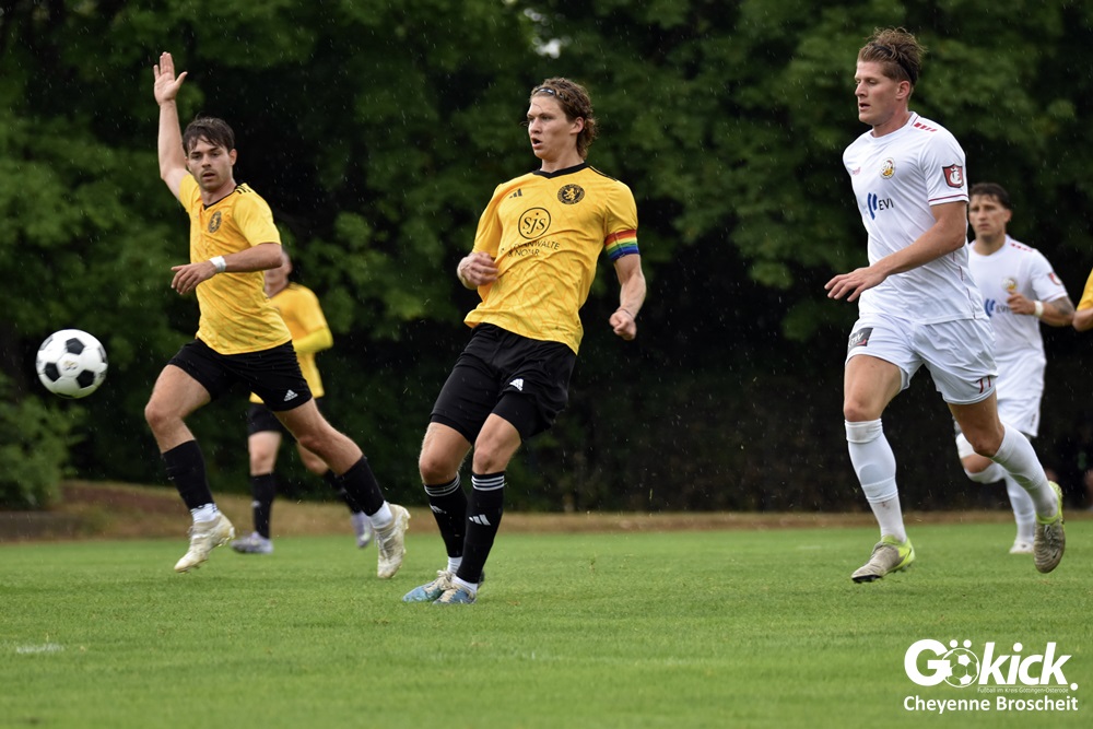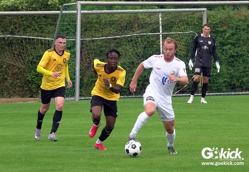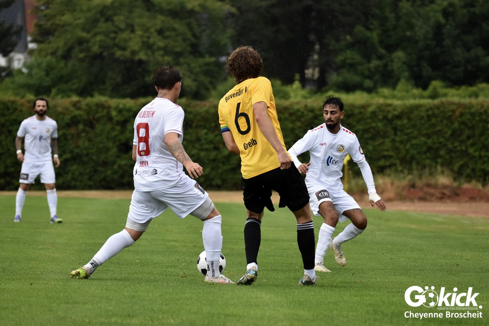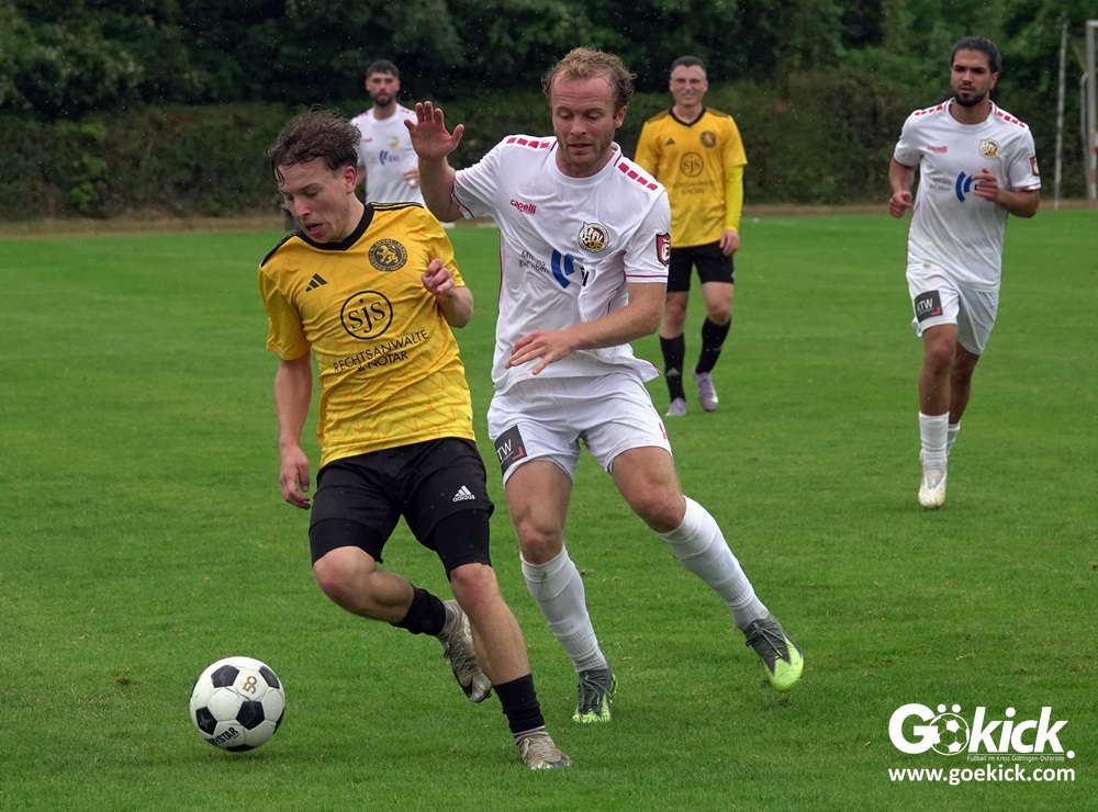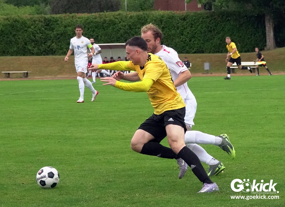 Der Oberligist war technisch überlegen und schlug ein hohes Tempo an. Entsprechend musste der Gastgeber oft hinterher laufen. Doch die Defensive stand lange Zeit sicher. In der 20. Spielminute jedoch brach der Gast über seine linke Angriffsseite durch und Mick Peter Gudra, beim FC Schalke 04 ausgebildet und im Besitz von Zweitliga-Erfahrung, vollendete im Zentrum, fünf Meter vor Bovendens neuem Schlussmann Theodor Bachmann sicher. Doch für mehr reichte es nicht für die Gäste in der verregneten ersten Halbzeit. Beim Spielstand von 0:1 wurden die Seiten gewechselt.