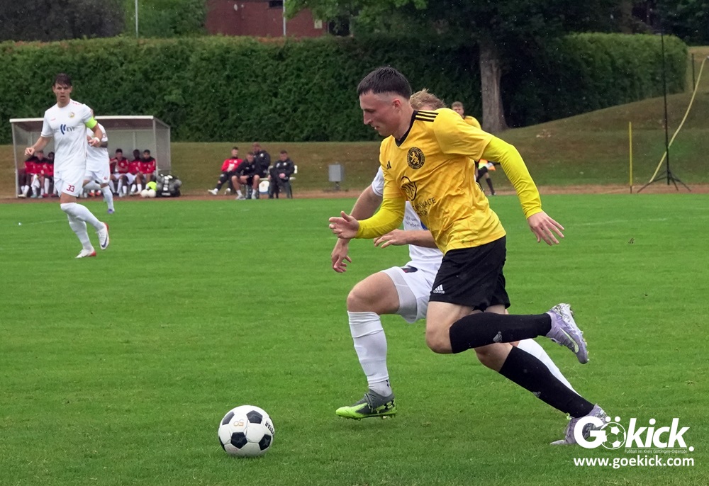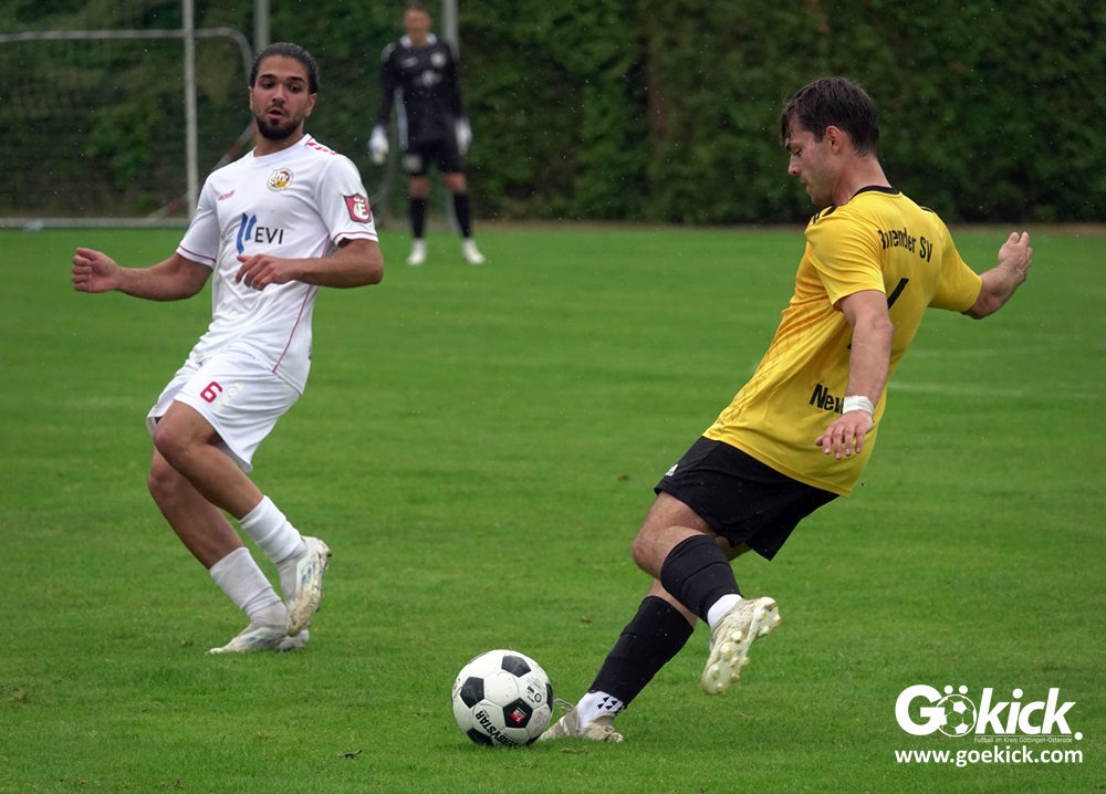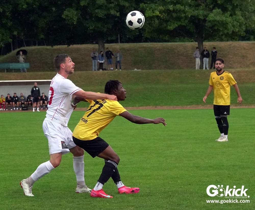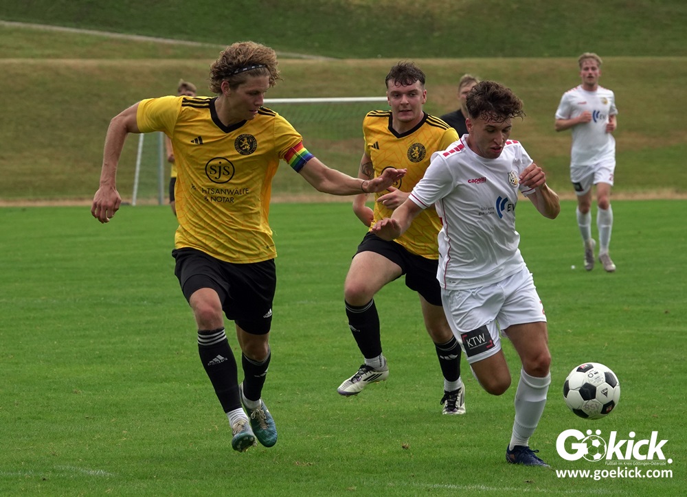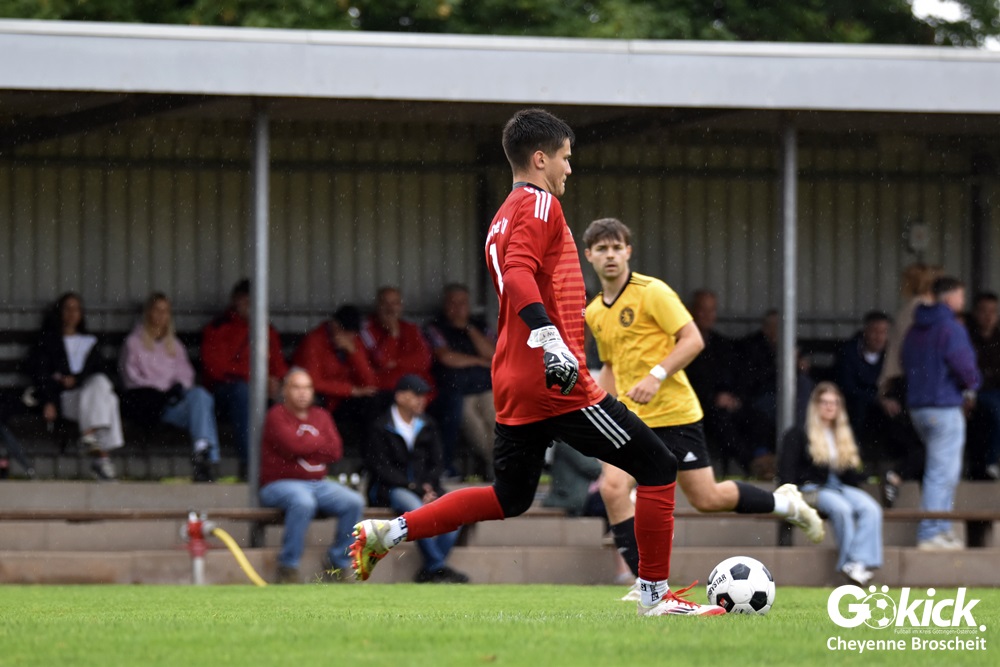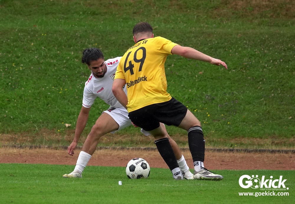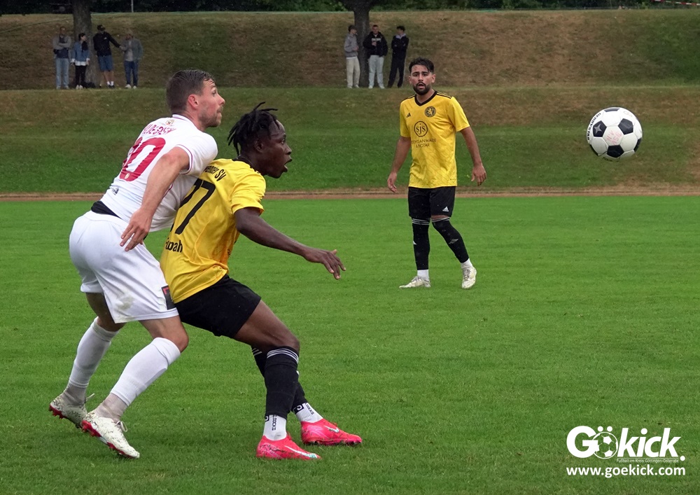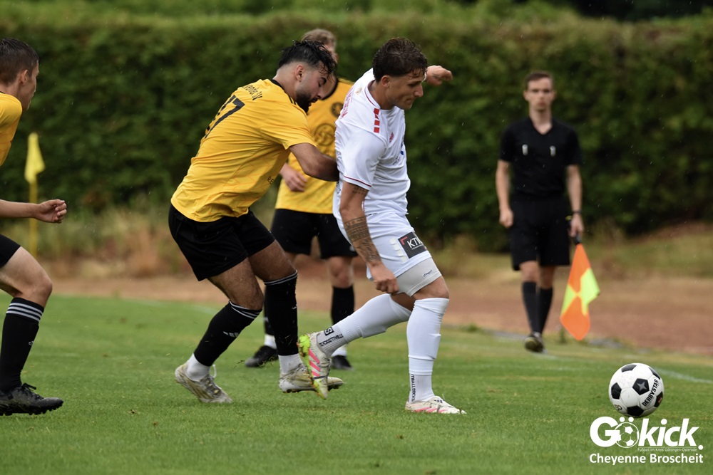 Der Oberligist war technisch überlegen und schlug ein hohes Tempo an. Entsprechend musste der Gastgeber oft hinterher laufen. Doch die Defensive stand lange Zeit sicher. In der 20. Spielminute jedoch brach der Gast über seine linke Angriffsseite durch und Mick Peter Gudra, beim FC Schalke 04 ausgebildet und im Besitz von Zweitliga-Erfahrung, vollendete im Zentrum, fünf Meter vor Bovendens neuem Schlussmann Theodor Bachmann sicher. Doch für mehr reichte es nicht für die Gäste in der verregneten ersten Halbzeit. Beim Spielstand von 0:1 wurden die Seiten gewechselt.