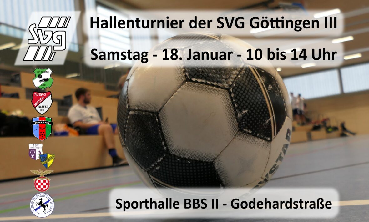Am Samstag, den 18. Januar, steigt in der Sporthalle der Göttinger Berufsbildenden Schule (BBS) II in der Godehardstraße ein neu ins Leben gerufenes Hallen-Turnier. Die SVG Göttingen III mit ihrem Trainer Mario Volpini aus der 2. Kreisklasse Mitte hat geladen und weitere sechs Mannschaften folgten dieser Offerte. Sie spielen ab 9:45 Uhr in einer einfachen Punkterunde mit einer Spielzeit von zehn Minuten bis 13:30 Uhr um den Turniersieg. Anschließend erfolgt die Siegerehrung. Die Gastgeber werden für die Teilnehmer und die Besucher ein reichhaltiges Angebot an Speisen und Getränken zum Verkauf anbieten, der Eintritt ist frei.
