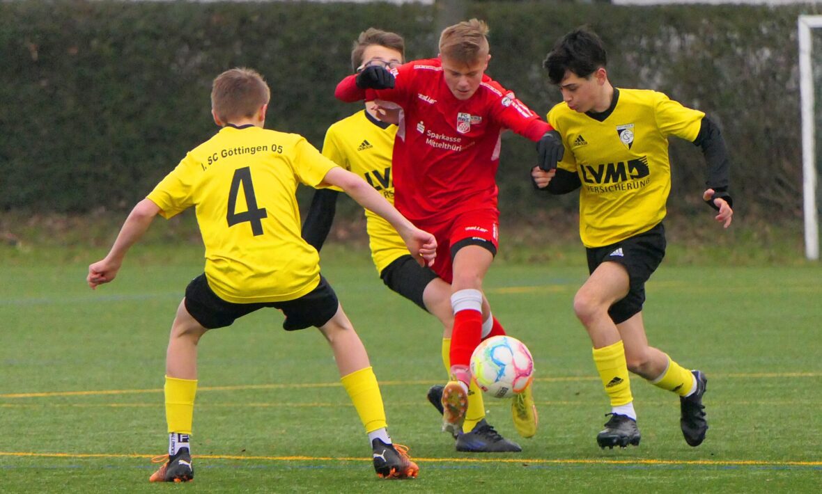 Das C-Jugend-Regionalliga-Team des 1. SC Göttingen 05 bereitet sich aktuell intensiv auf den Beginn der Abstiegsrunde am 18. März mit dem Heimspiel gegen den SC Vorwärts Wacker vor. Glaubt man Trainer Stefan Wilke, so gibt es noch Hoffnung, in den verbleibenden acht Punktspielen die neun Punkte Rückstand zum rettenden Ufer aufzuholen. Am vergangenen Sonntag empfing das schwarz-gelbe Team den Tabellenführer der Verbandsliga Thüringen, den FC Rot-Weiß Erfurt auf dem Kunstrasenplatz der BSA Maschpark zu einem Test. Am Ende der Partie unter der Leitung von Schiedsrichter Sebastian Jopp siegte der Gast mit 2:1 (1:0).