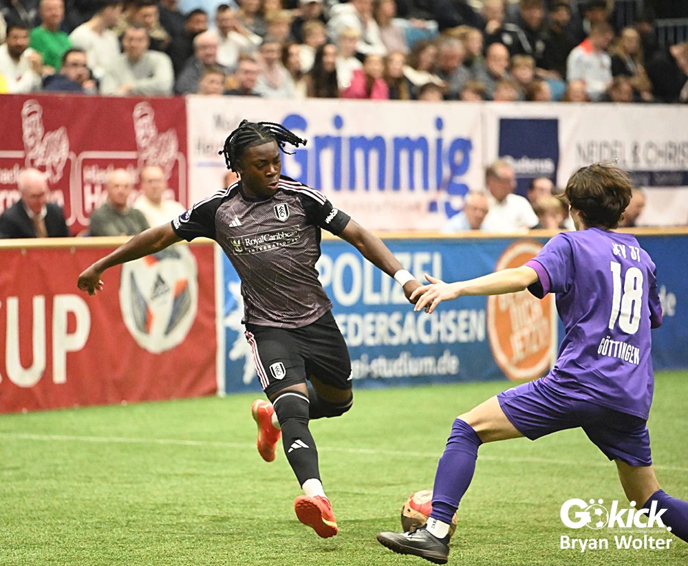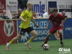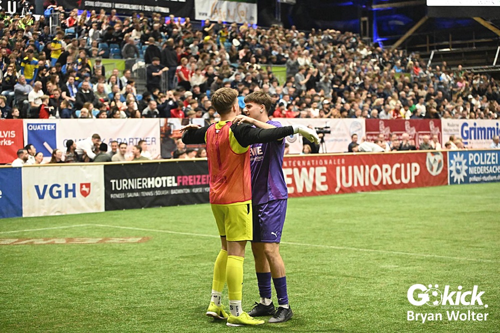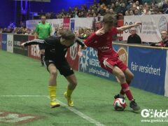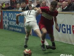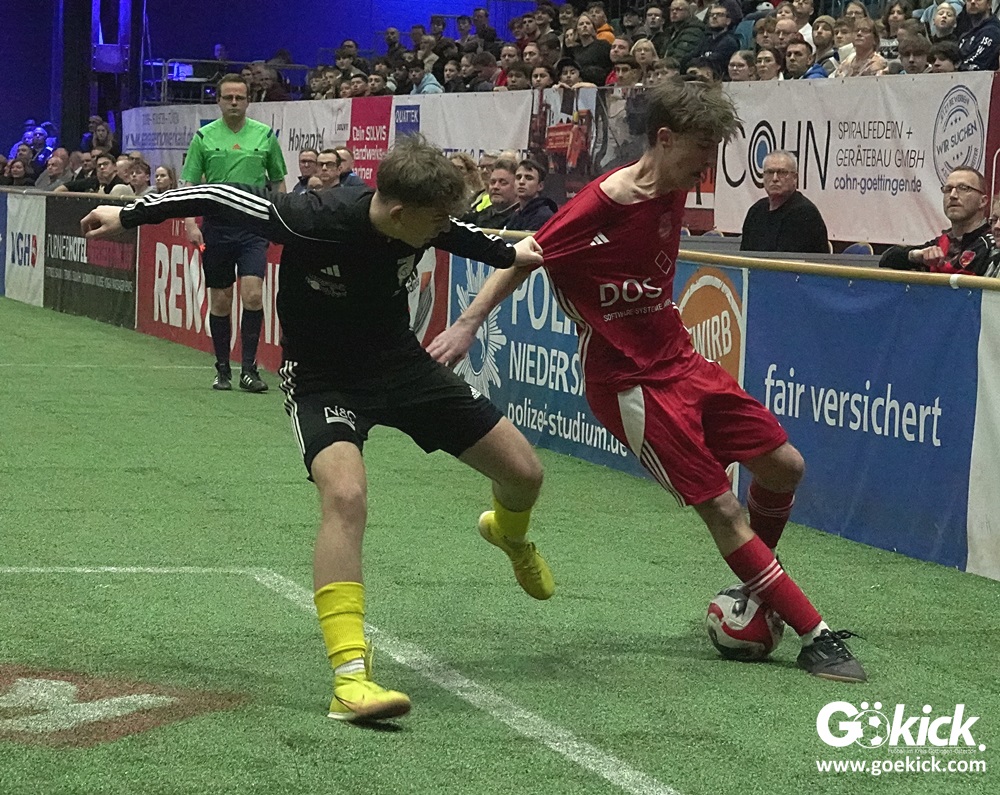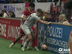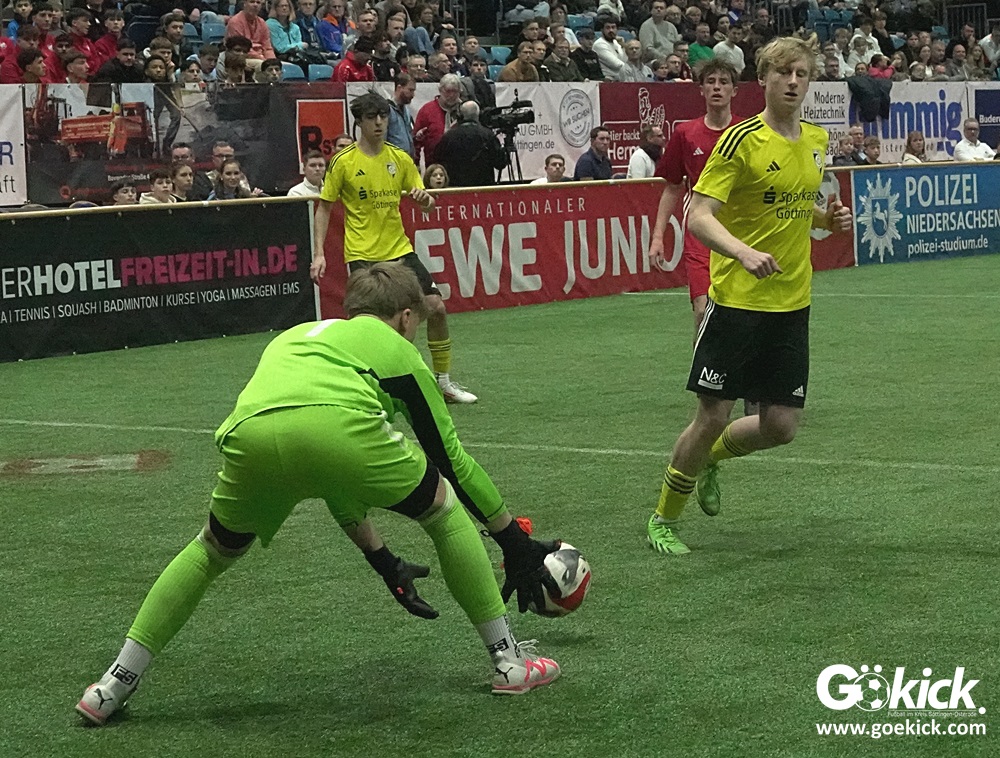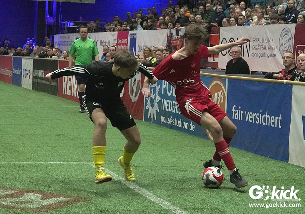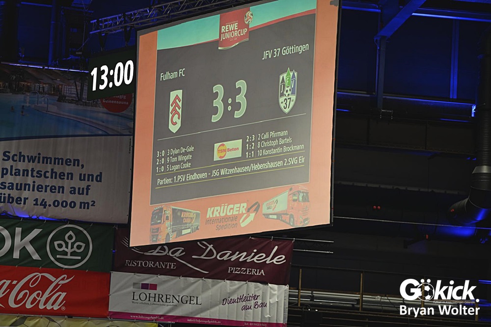 Der erste Spieltag des REWE JUNIORCUPs 2025 ist Geschichte. Das Schneechaos am Nachmittag und die damit verzögerte Anreise von Hannover 96 sorgten für eine Änderung des Spielplans und einen um eine Stunde verzögerten Beginn der Veranstaltung. Doch in der warmen Halle und bei guter Stimmung mit leckerer Verpflegung war der Abend ohne Verstimmungen auszuhalten. Der erste Tag brachte dann auch gleich die erste, kleinere Überraschung. In der TSN-Beton-Gruppe gelang es dem Landesligisten JFV 37 Göttingen, dem englischen Gast FC Fulham, beim 3:3 einen Punkt abzuknöpfen.