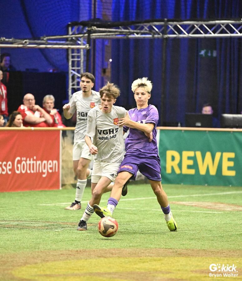 JFV 37 Göttingen: Mit dem schon erwähnten 3:3 gegen den FC Fulham startete das Team vom Trainerduo Pepe Huenges und Timm Wünsch in das Turnier. In der zweiten Partie konnte das lila Team die SVG Einbeck mit 6:1 besiegen. Gegen den Bezirksligisten JSG Eintracht HöhBernSee war es beim 4:3 schon knapper. Das Team aus dem Göttinger Süden ist aber ungeschlagen und auf dem guten Weg in die Zwischenrunde am Sonntag.