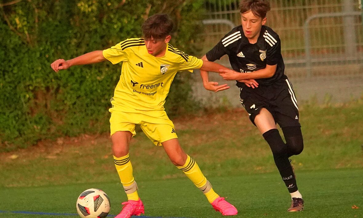 So deutlich das Ergebnis am Ende ausfiel, so kurios war der Verlauf der Partie. Mit dem ersten Angriff erzielte der Regionalliga-Absteiger auch gleich die Führung durch Tom Leonhard Kunze (1.). Anschließend entwickelte sich ein Spiel, in dem der Außenseiter den Favoriten mehr ärgerte, als erwartet. Obwohl die U15 naturgemäß das Spiel bestimmte, war der jüngere Jahrgang vom Trainerduo Dimitrios Avdoulidis und Luca Uhlendorff mit seinen Kontern immer wieder gefährlich. Nach 16 Minuten traf die U14 sogar den Pfosten des Tores der U15. Doch praktisch mit dem Halbzeitpfiff musste der „Gastgeber“ das 0:2 durch Philipp Overkamp schlucken (35.).