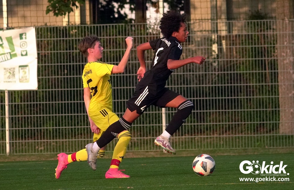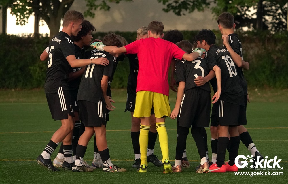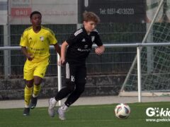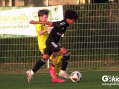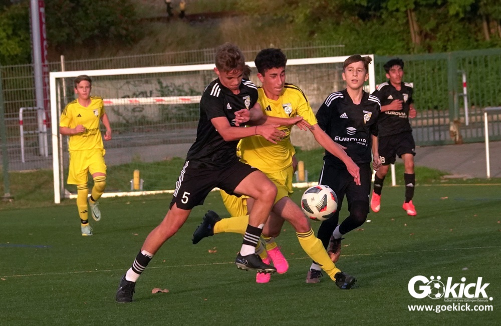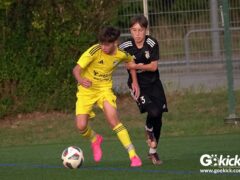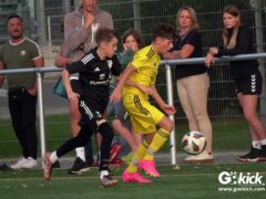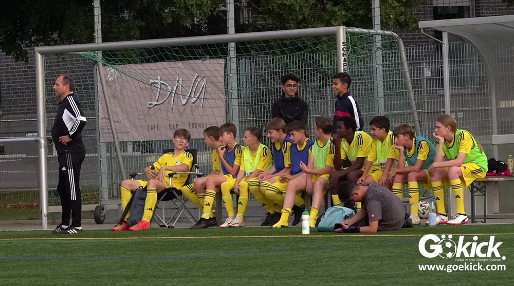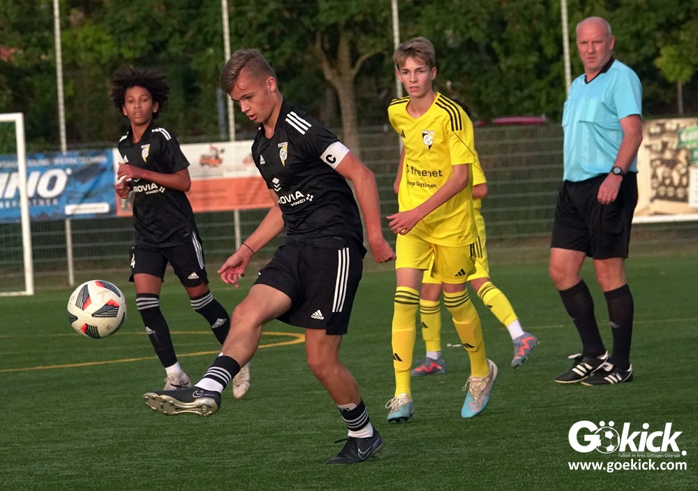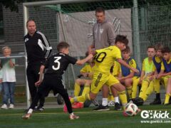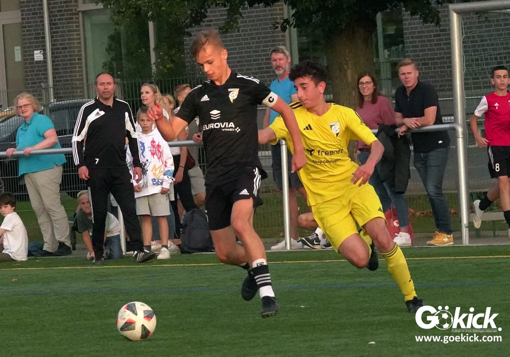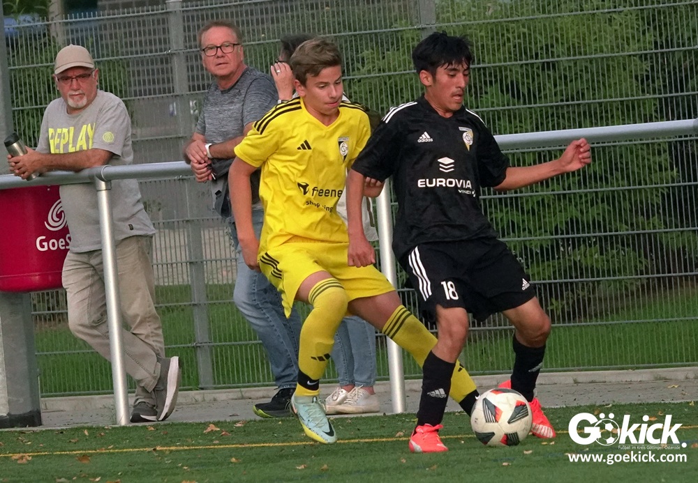 So deutlich das Ergebnis am Ende ausfiel, so kurios war der Verlauf der Partie. Mit dem ersten Angriff erzielte der Regionalliga-Absteiger auch gleich die Führung durch Tom Leonhard Kunze (1.). Anschließend entwickelte sich ein Spiel, in dem der Außenseiter den Favoriten mehr ärgerte, als erwartet. Obwohl die U15 naturgemäß das Spiel bestimmte, war der jüngere Jahrgang vom Trainerduo Dimitrios Avdoulidis und Luca Uhlendorff mit seinen Kontern immer wieder gefährlich. Nach 16 Minuten traf die U14 sogar den Pfosten des Tores der U15. Doch praktisch mit dem Halbzeitpfiff musste der „Gastgeber“ das 0:2 durch Philipp Overkamp schlucken (35.).