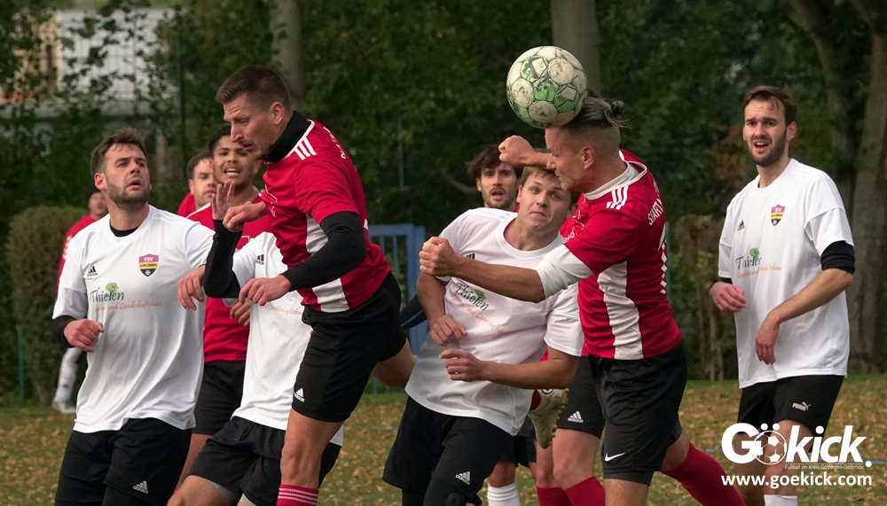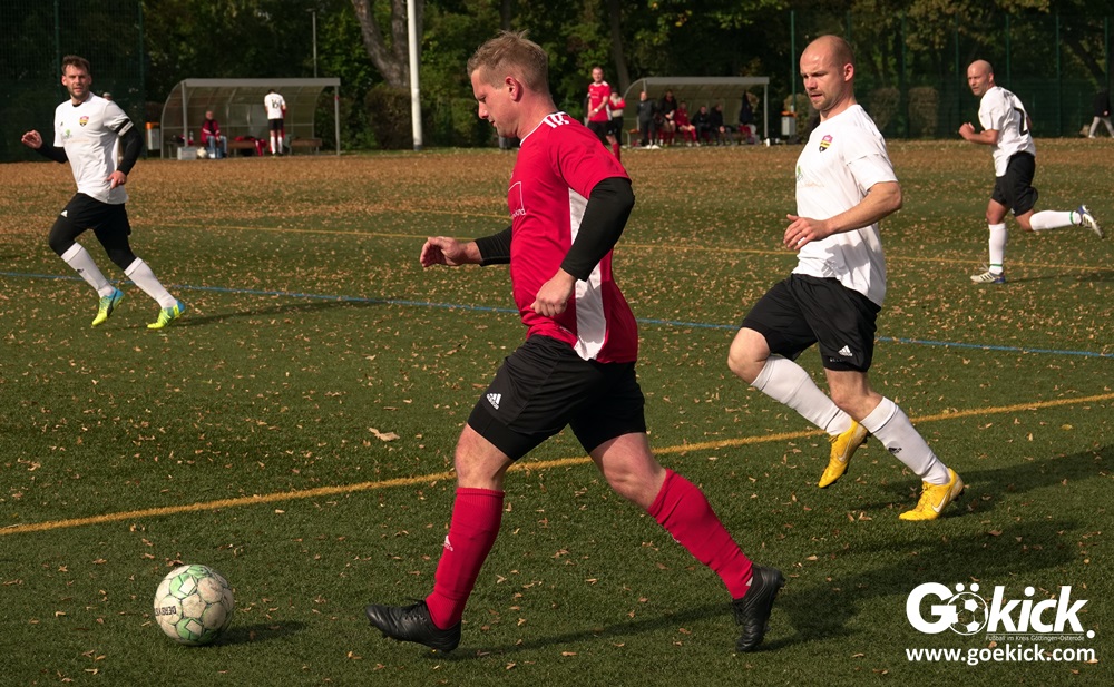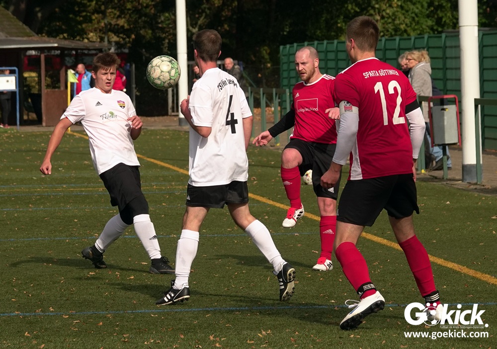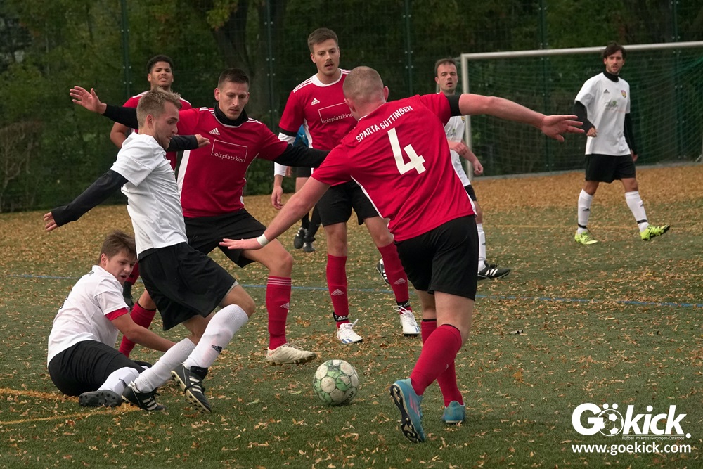 Die Gäste aus der Gemeinde Gleichen gingen bereits nach vier Minuten durch Philippe Messerer mit 1:0 in Führung. Trotz des Rückstands übernahm Sparta die Regie über diese Partie. Nach mehreren misslungenen Versuchen traf Lasse Schmidt mit einem eingesprungenen Flachschuss nach 29 Minuten zum verdienten Ausgleich. Sechs Minuten später ging die Sparta-Reserve von Trainer Sören Karkossa sogar in Führung – Christian Gasau traf aus dem Gewühl zum 2:1. Doch zur Pausenführung reichte es dennoch nicht: Philippe Messerer sorgte mit seinem zweiten Treffer in der 44. Spielminute für den 2:2-Ausgleich. Damit ging es in die Halbzeitpause.