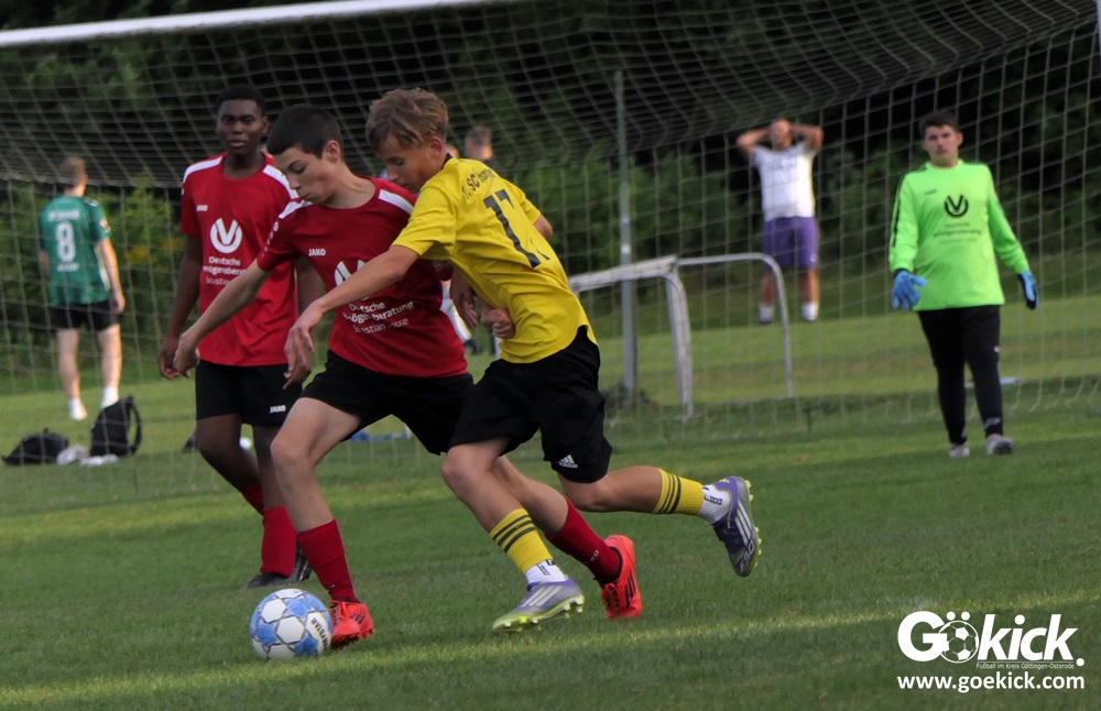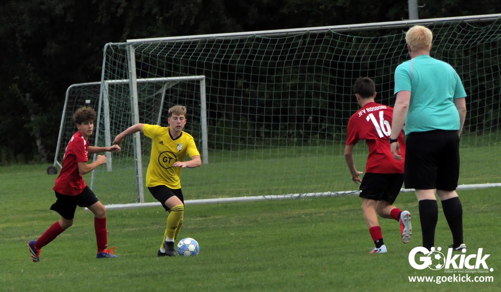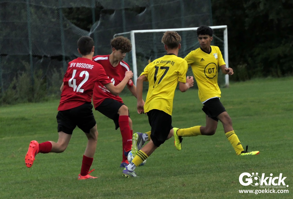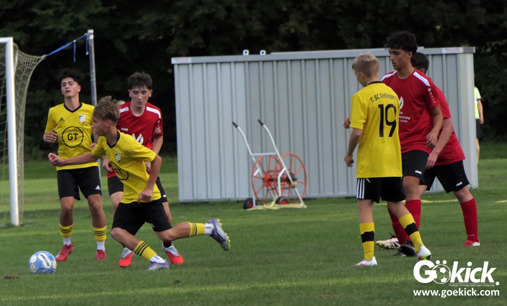 Ein kurzfristig vereinbartes Testspiel zwischen der B1 des JFV Rosdorf aus der Kreisklasse und dem C-Jugend-Niedersachsenligisten, der U15 des 1. SC Göttingen 05, endete am Montagabend auf dem Rosdorfer Sportplatz mit einem deutlichen Ergebnis. Unter der Leitung von Schiedsrichter Markus Meyer setzte sich die höherklassige Mannschaft des 05-Nachwuchses klar mit 9:0 durch.