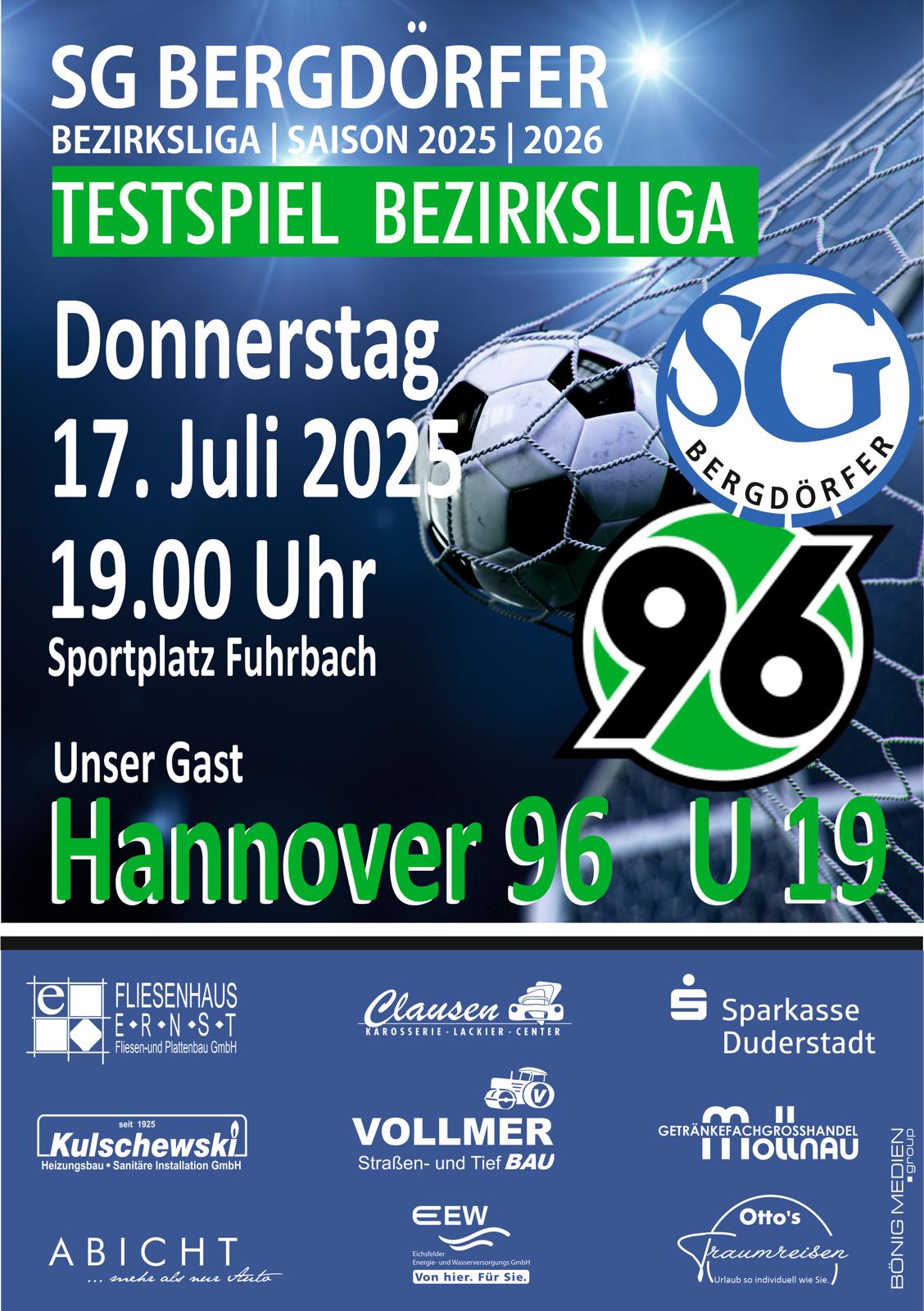 Am Donnerstag, den 17. Juli, findet um 19 Uhr ein Testspiel zwischen der SG Bergdörfer und Hannover 96 U19 statt.