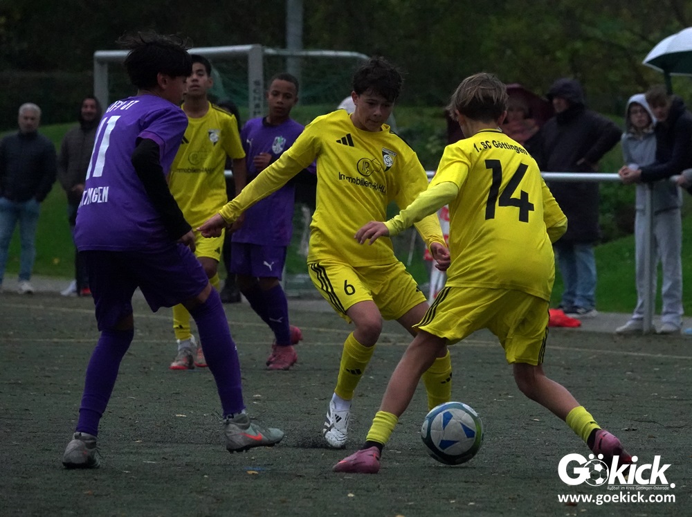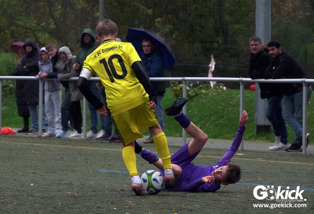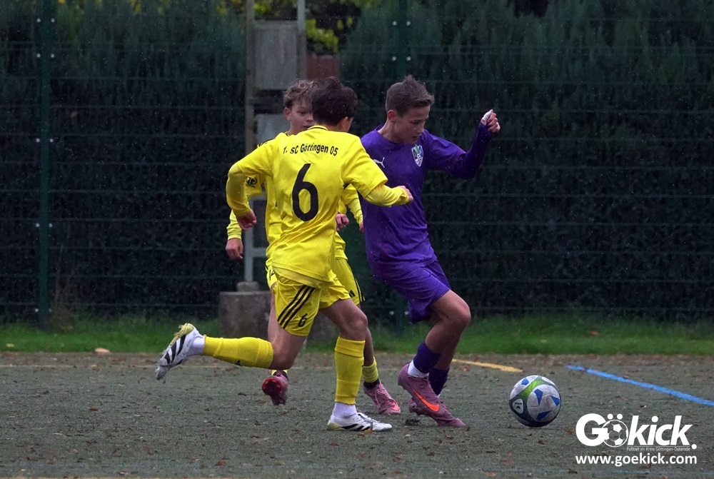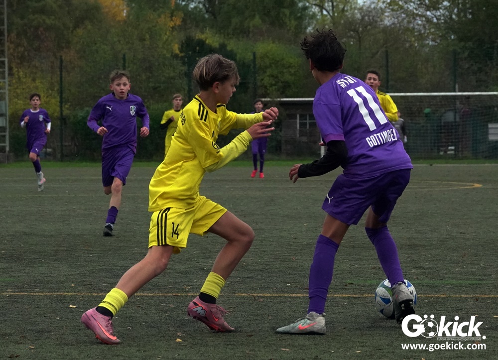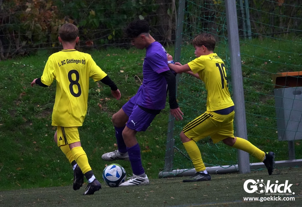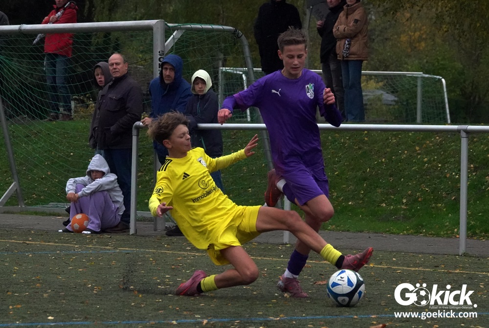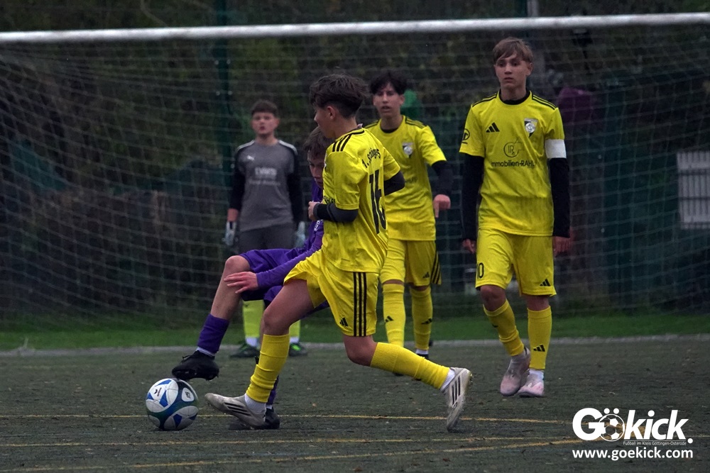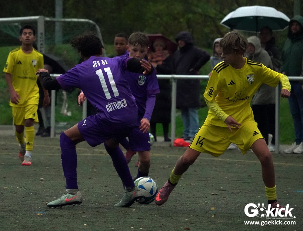 Von Beginn an entwickelte sich eine Begegnung, die der Bezeichnung Spitzenspiel gerecht wurde. Der JFV 37 Göttingen präsentierte sich mutig und spielfreudig, suchte immer wieder den Weg in die Tiefe und setzte die Gästeabwehr früh unter Druck. Doch während die Hausherren ihre aussichtsreichen Gelegenheiten nicht nutzen konnten, zeigte sich der 1. SC Göttingen 05 vor dem Tor abgezockter: In der 23. Minute nutzte Noah Noel Kiy einen Moment der Unordnung in der JFV-Defensive und brachte seine Farben in Führung.