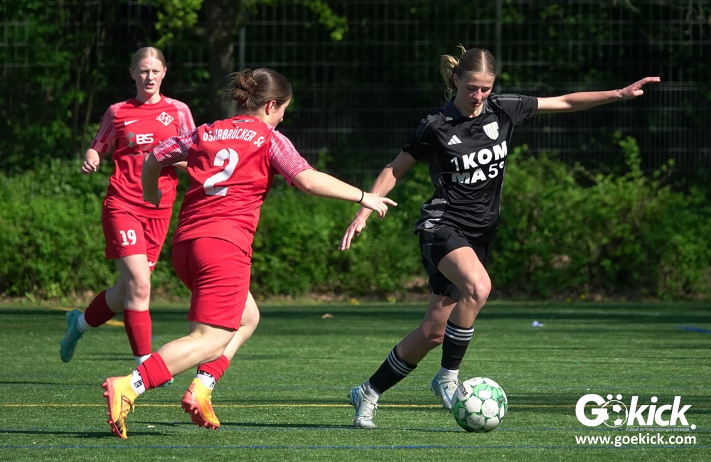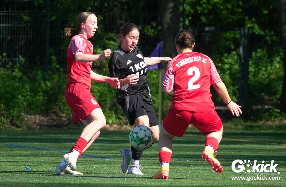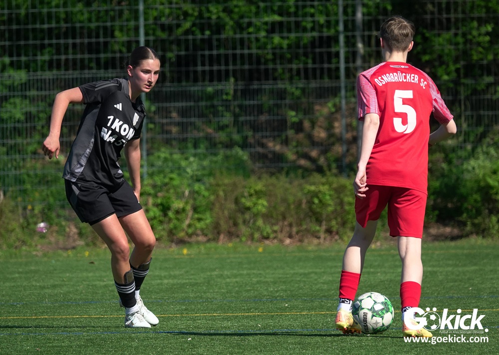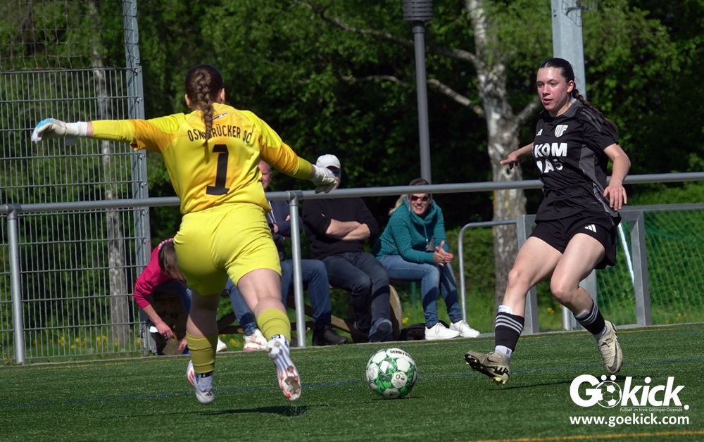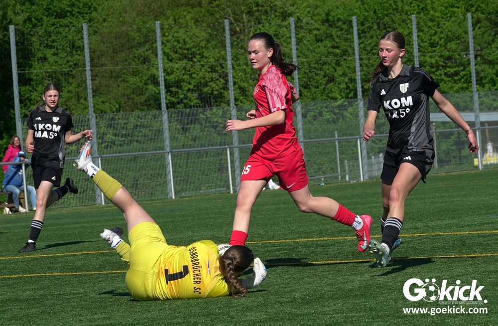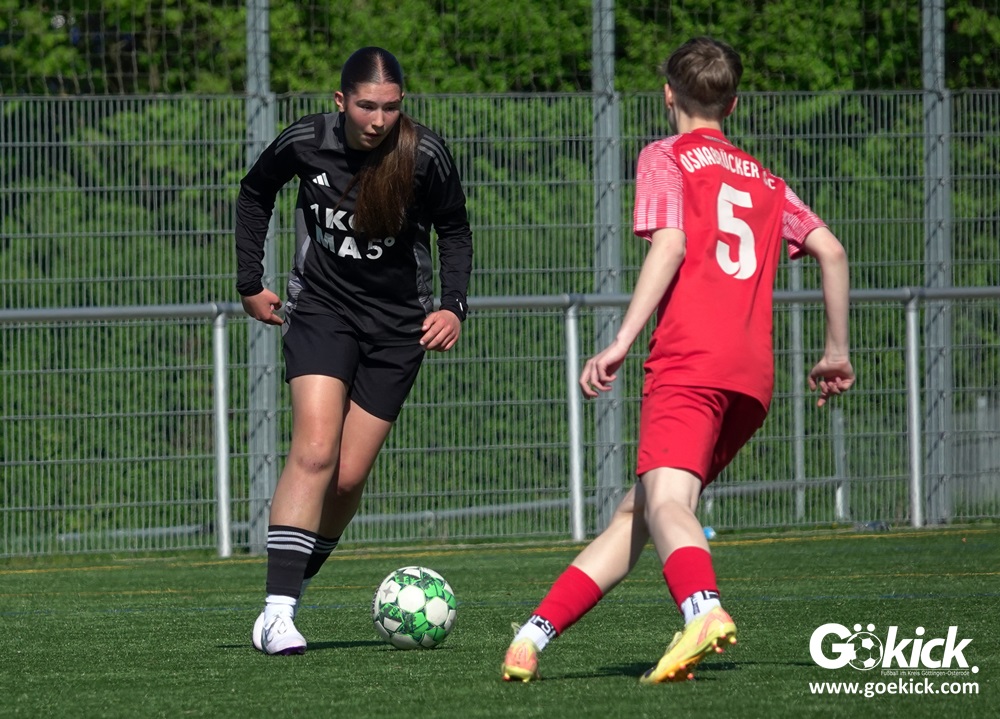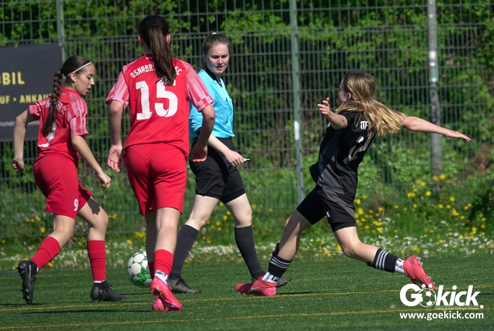 Einen Klassenunterschied konnten die Beobachter der Partie in der ersten Halbzeit nicht erkennen. Lediglich die beiden Osnabrückerinnen Josefine Wehage und Clara Bockrath Esparza zeigten, dass sie in ihrer fußballerischen Entwicklung Ausnahme-Talente sind. Dennoch gelang es dem Gastgeber, seinen Kasten sauber zu halten und selbst eigene, gefährliche Angriffe zu inszenieren. Torlos wurden die Seiten gewechselt.