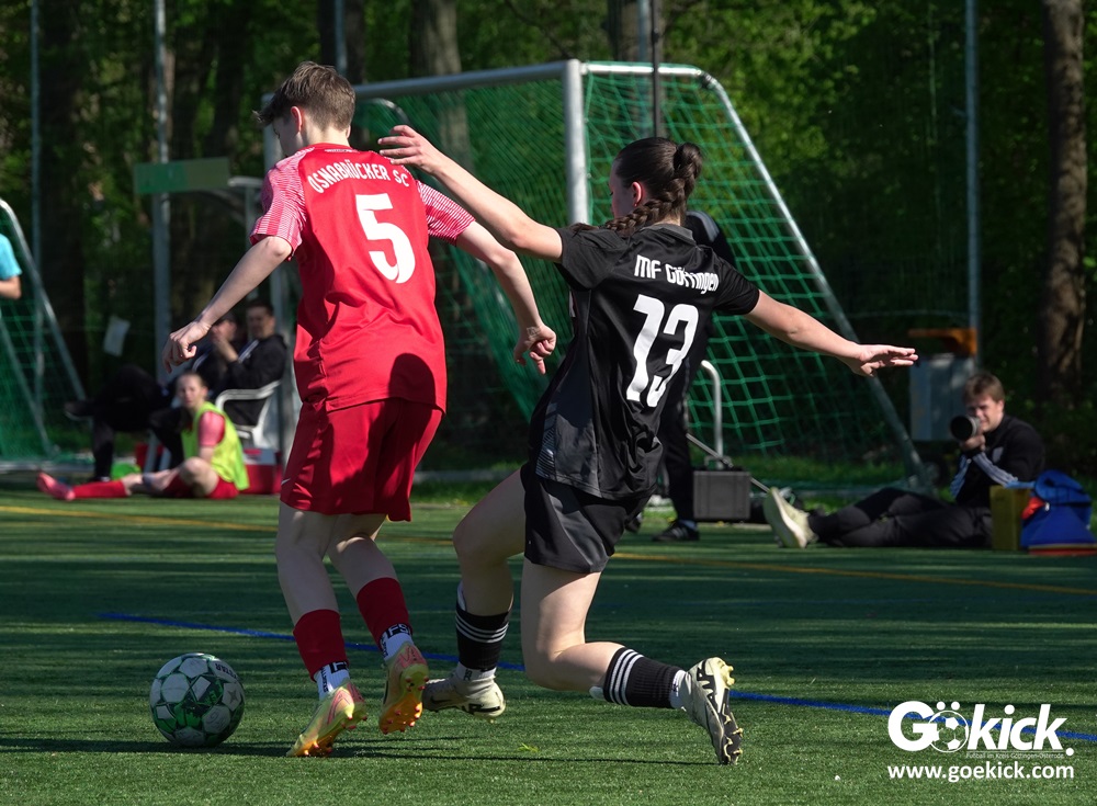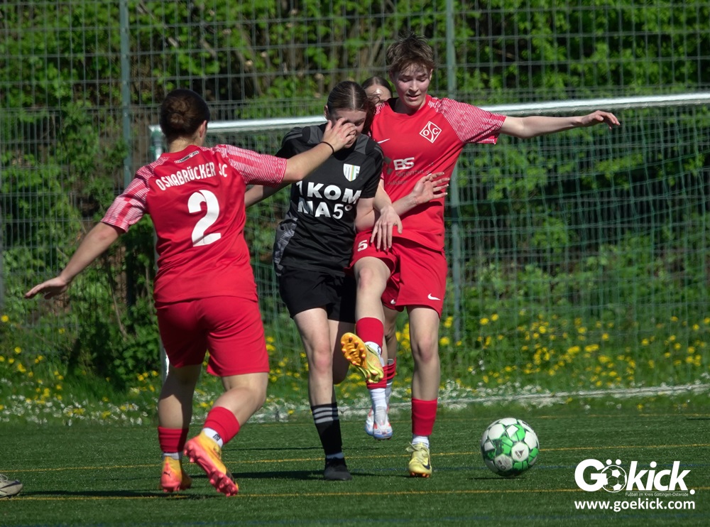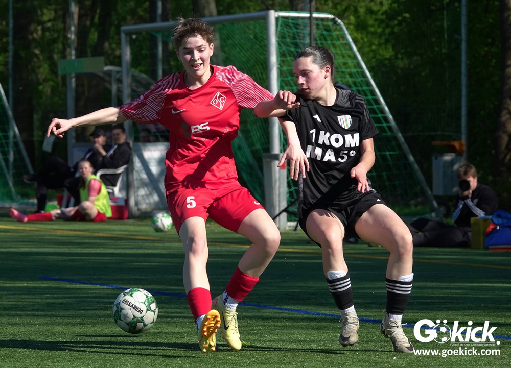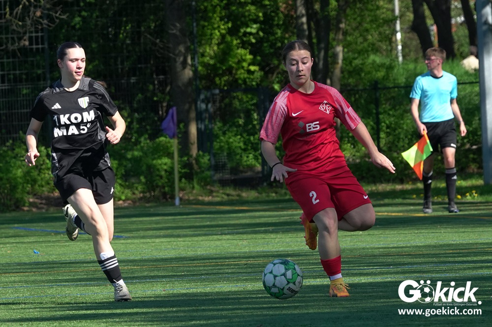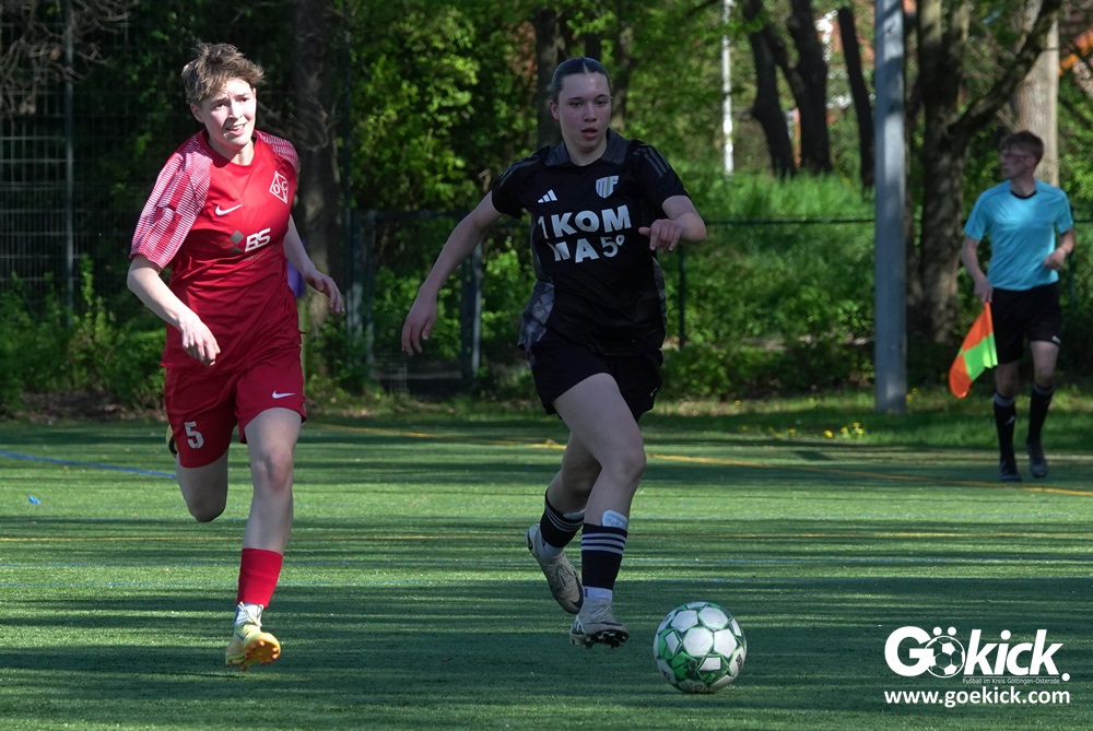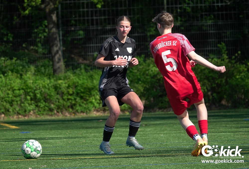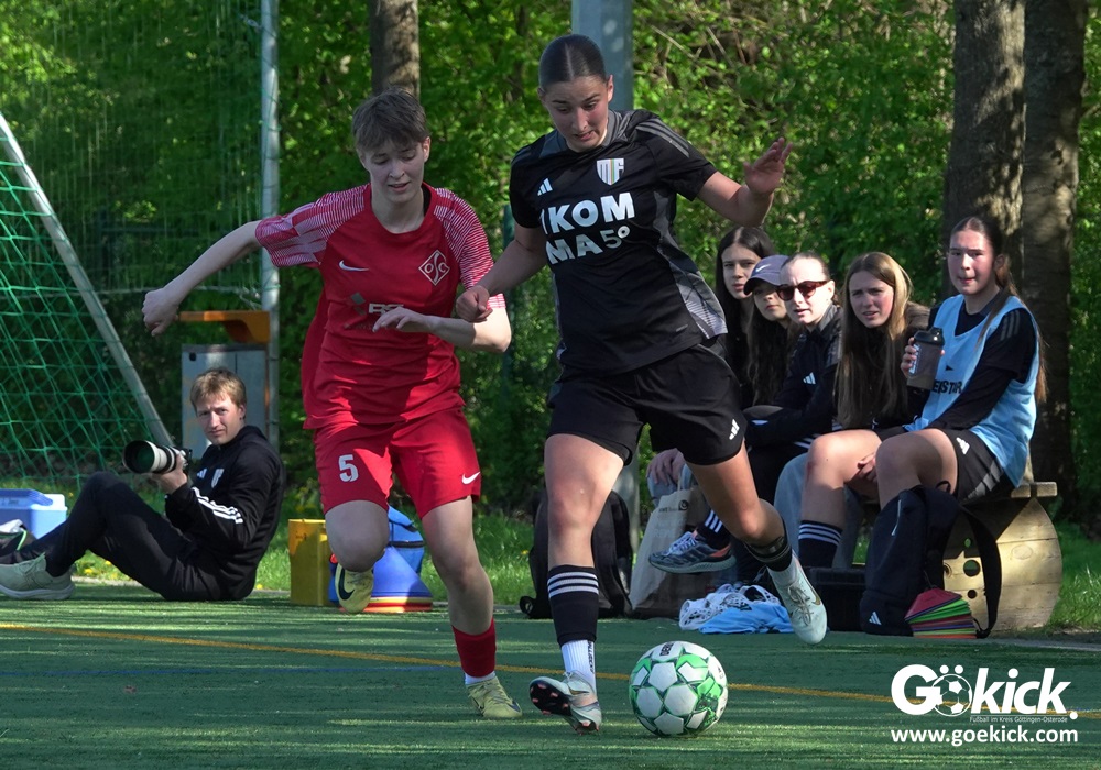 Einen Klassenunterschied konnten die Beobachter der Partie in der ersten Halbzeit nicht erkennen. Lediglich die beiden Osnabrückerinnen Josefine Wehage und Clara Bockrath Esparza zeigten, dass sie in ihrer fußballerischen Entwicklung Ausnahme-Talente sind. Dennoch gelang es dem Gastgeber, seinen Kasten sauber zu halten und selbst eigene, gefährliche Angriffe zu inszenieren. Torlos wurden die Seiten gewechselt.