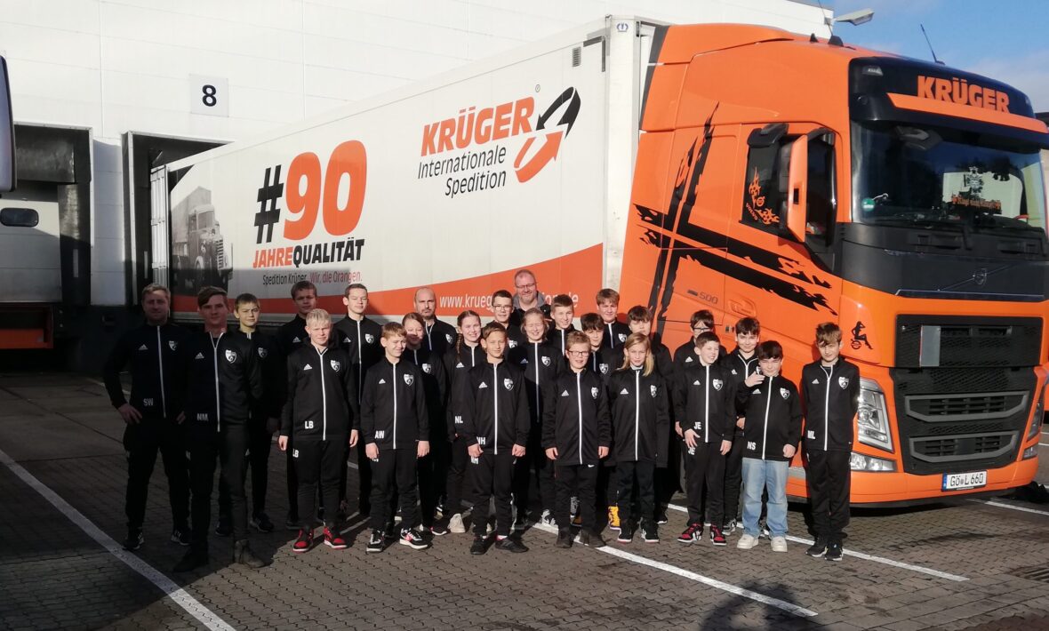 (Göttingen) Strahlende Gesichter bei den C2-Junioren der JSG Hoher Hagen, denn die Göttinger Spedition KRÜGER überraschte die Mannschaft jetzt mit einem Satz neuer Trainingsanzüge. Geschäftsführer Marco Butter erläutert, dass KRÜGER hiermit auch die vorbildliche Arbeit im Verein unterstützen möchte. „Es ist fantastisch, was hier von den vielen Ehrenamtlichen geleistet wird und eine große Bereicherung für die Region und die hier lebenden Familien, daher war es für uns als Familienunternehmen klar, dass wir unterstützen.“, so Butter.
