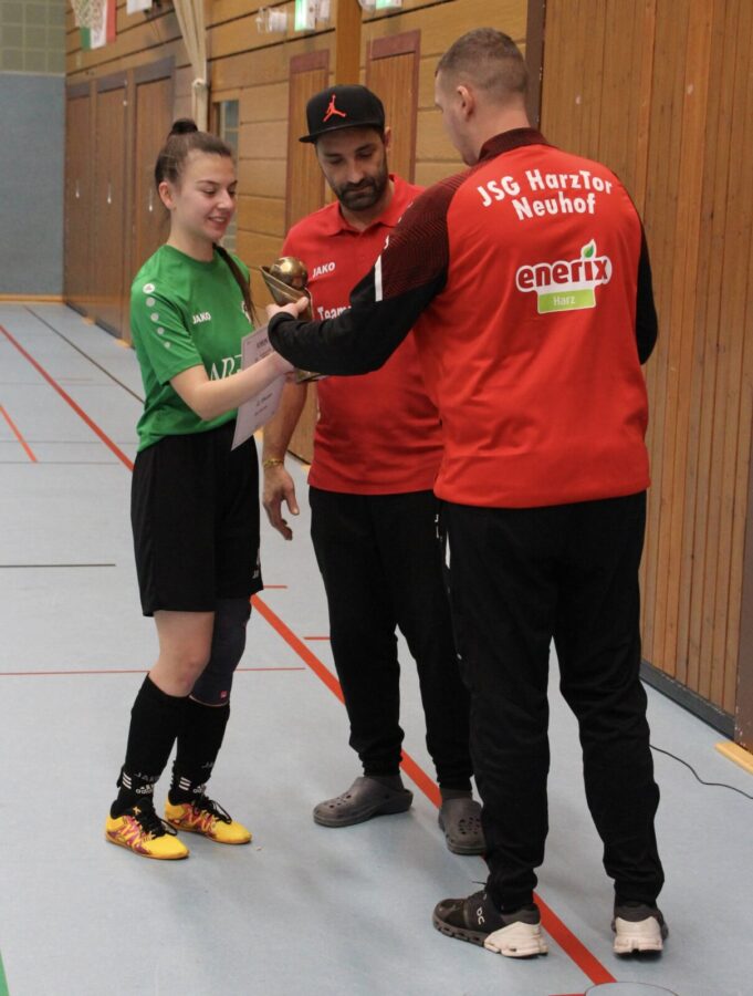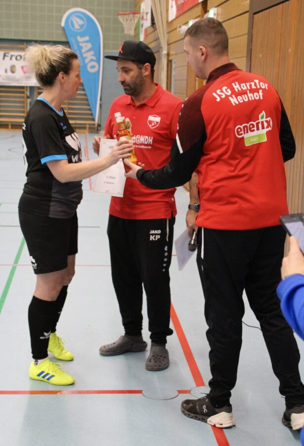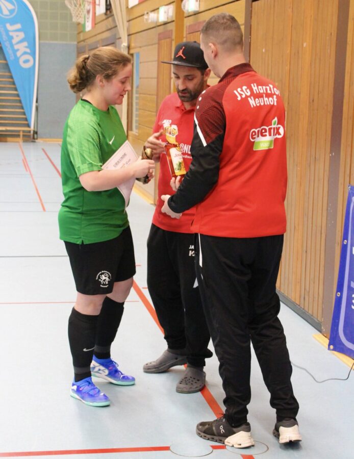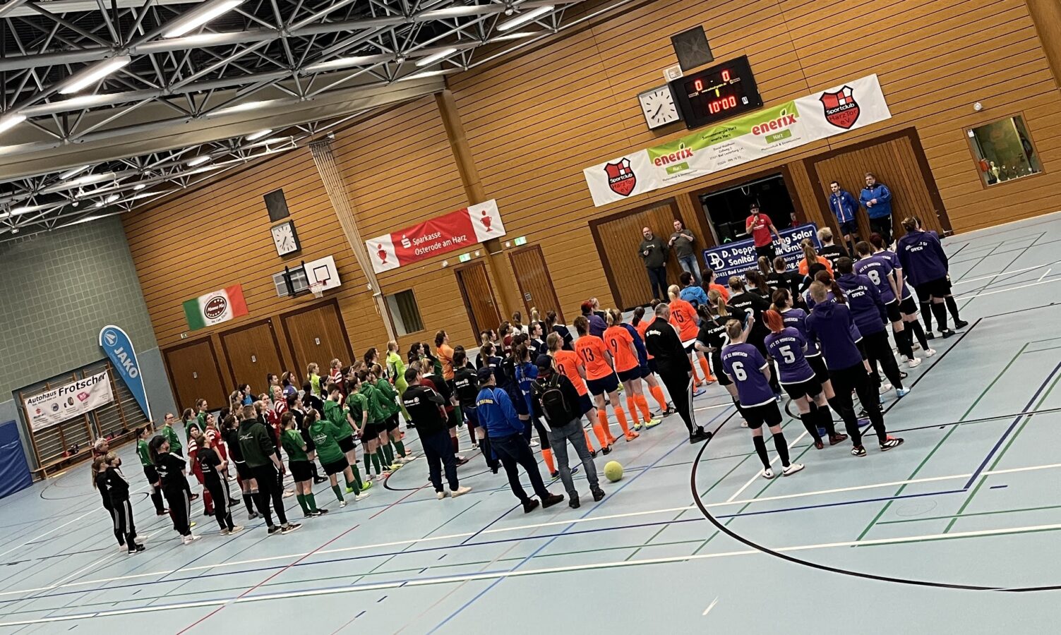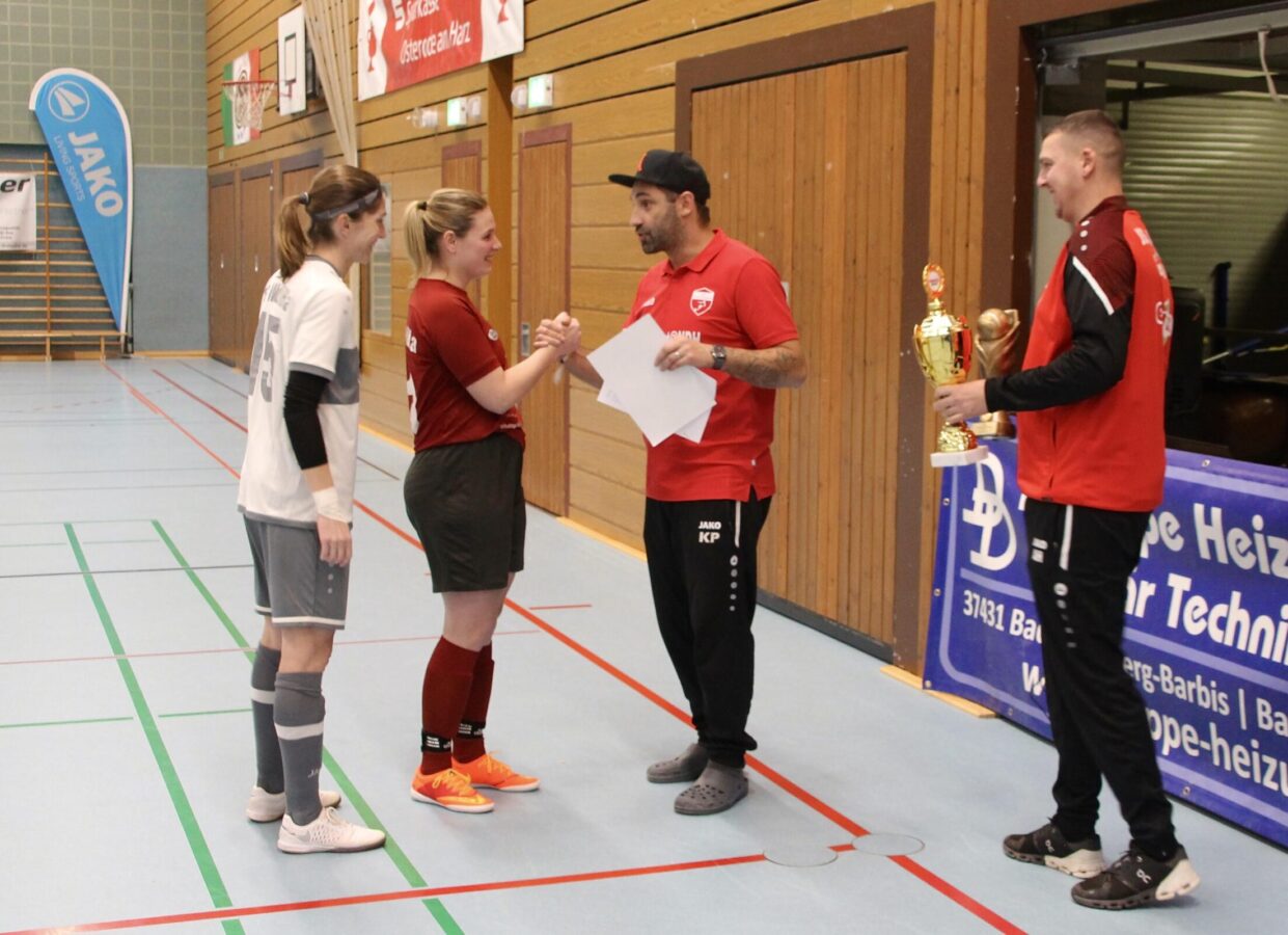 Der Tabellenzweite der Frauen-Bezirksliga, die SG Wulften/Lindau/Hattorf hat am vergangenen Samstag in der Sporthalle in Bad Lauterberg den 2. Enerix Harz Cup für Frauen-Mannschaften des SC HarzTor gewonnen. Im Finale besiegte das Team von Trainer Timo Kuhlmann den Tabellenführer der Frauen-Kleinfeld-Kreisklasse, SV Förste, mit 1:0. Dritter des Turniers am Harzrand wurde der TV Brüderschaft Schöningen aus der Nähe von Helmstedt. Der Bezirksligist besiegte im Kleinen Finale den Süd-Bezirksligisten FC Westharz mit 5:0. Insgesamt waren neun Frauen-Mannschaften in zwei Vorrunden-Gruppen in das Turnier gestartet.