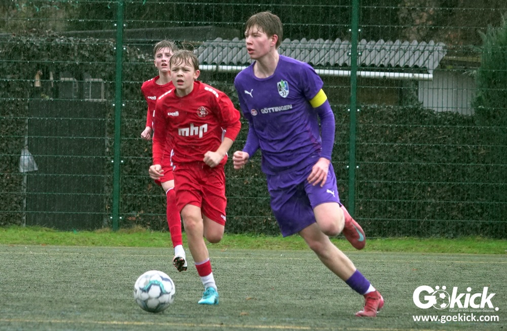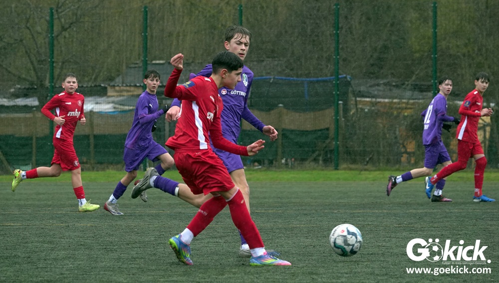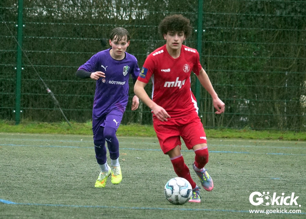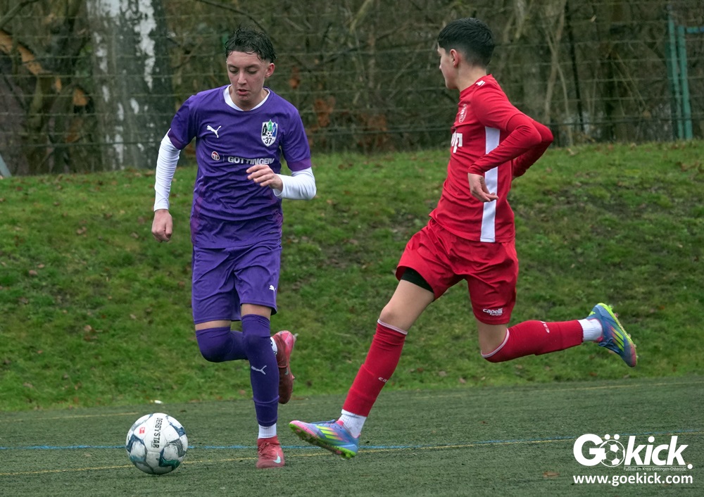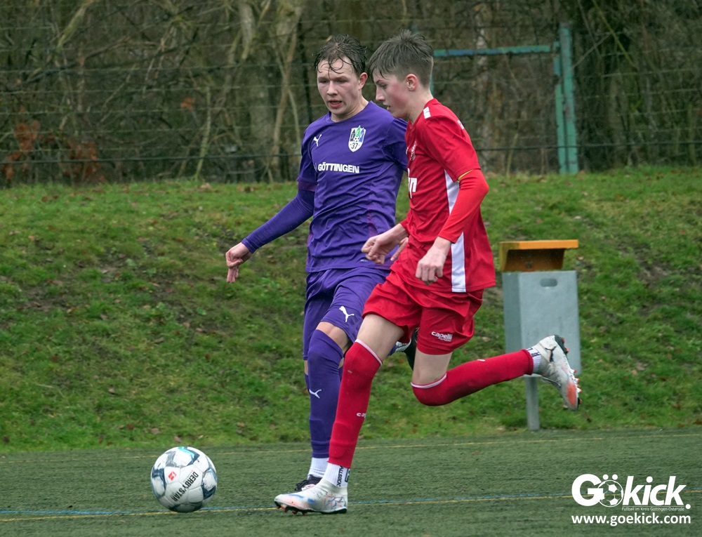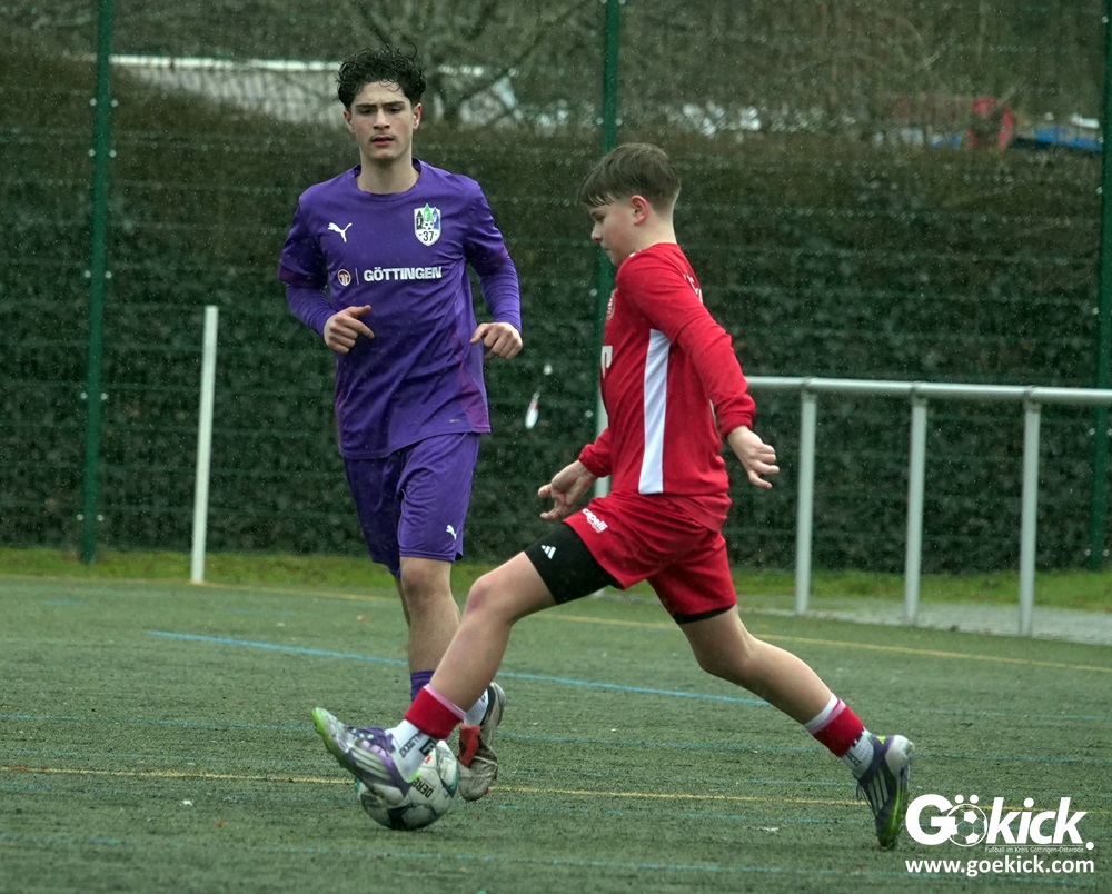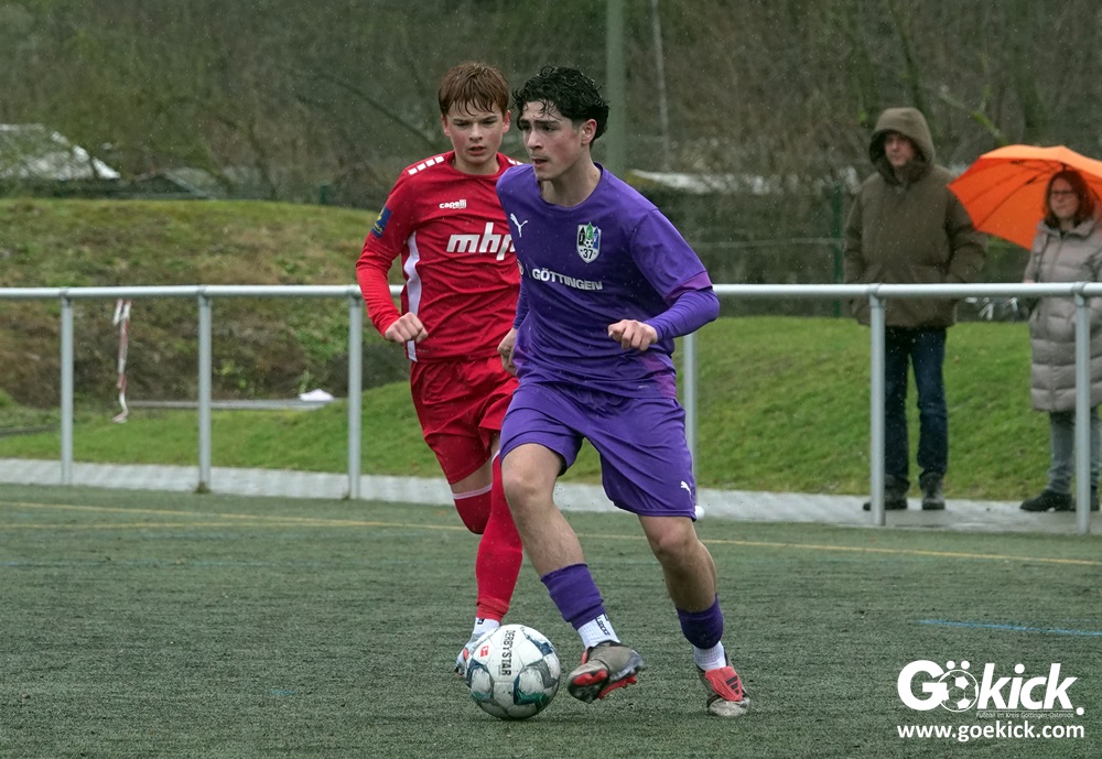 Von Beginn an trat der JFV 37 Göttingen U15 zielstrebig auf. In der 15. Minute brachte Johann Griese seine Mannschaft mit 1:0 in Führung. Nur sechs Minuten später erhöhte Kapitän Tomke Johannes Lein auf 2:0 (21.). Der Gastgeber nutzte seine Spielanteile konsequent: Johann Griese traf in der 23. Minute erneut und stellte auf 3:0.