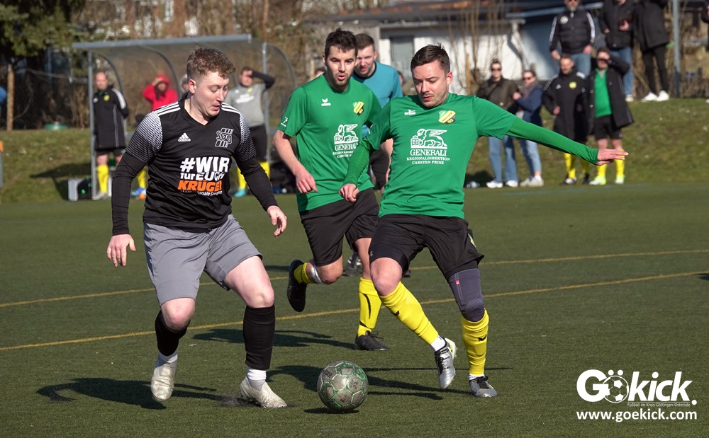 Es bleibt spannend an der Spitze! Die aussichtsreich in der Tabelle der 1. Kreisklasse Süd liegende zweite Mannschaft des RSV Geismar muss zum Auftakt der Rückrunde einen Rückschlag hinnehmen. Im Südstadt-Derby bei der Reserve der SVG Göttingen auf dem Kunstrasenplatz des KRÜGERPARKs am Sandweg kam das Team von Trainer Mariusz Burzynski über ein 2:2 (0:1)-Unentschieden nicht hinaus. Aufgrund des Ausrutschers von Spitzenreiter TSV Holtensen, der überraschend daheim gegen den Nachbarn SG Elliehausen/Esebeck verlor, hätte die RSV-Reserve mit einem Sieg selbst die Tabellenspitze erklimmen können. So muss sich das Team aus Geismar mit Tabellenplatz drei begnügen. Die SVG-Reserve hätte selbst mit einem Sieg noch einmal nahe an die vier Spitzenteams heranrücken können, das Remis hält den Abstand auf mindestens sechs Punkte.
