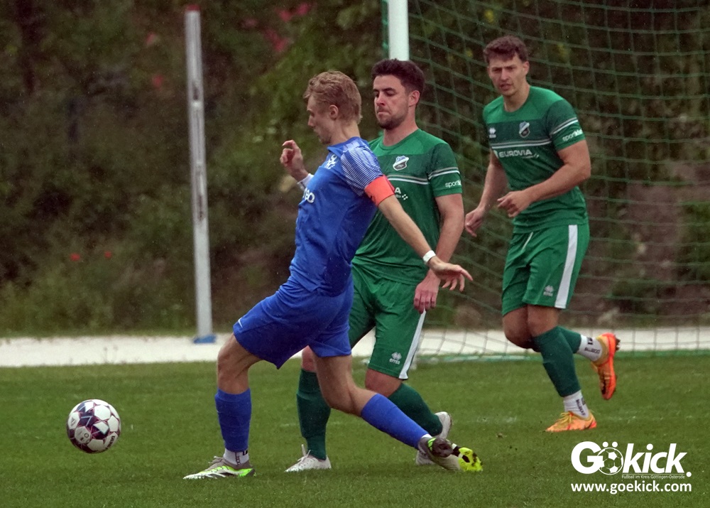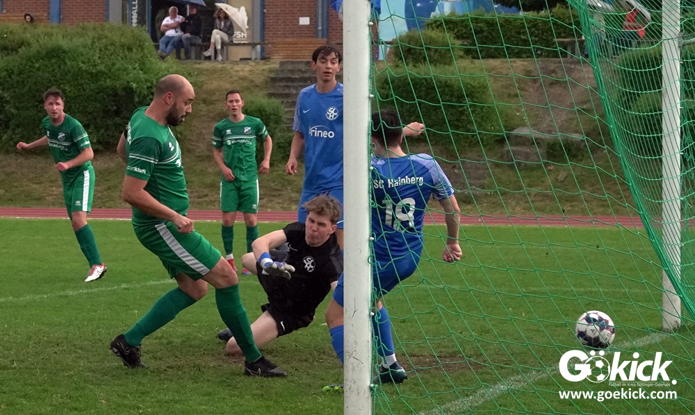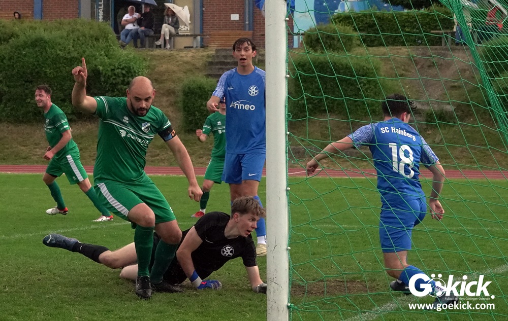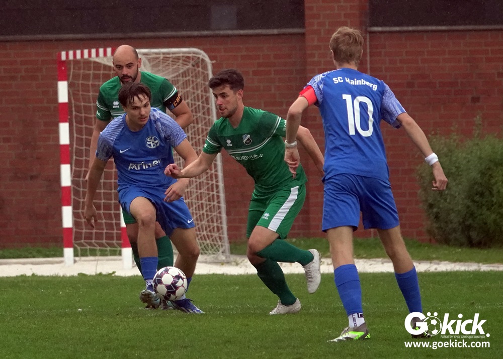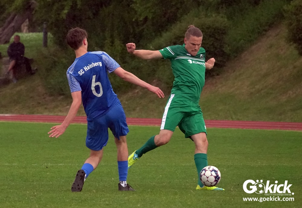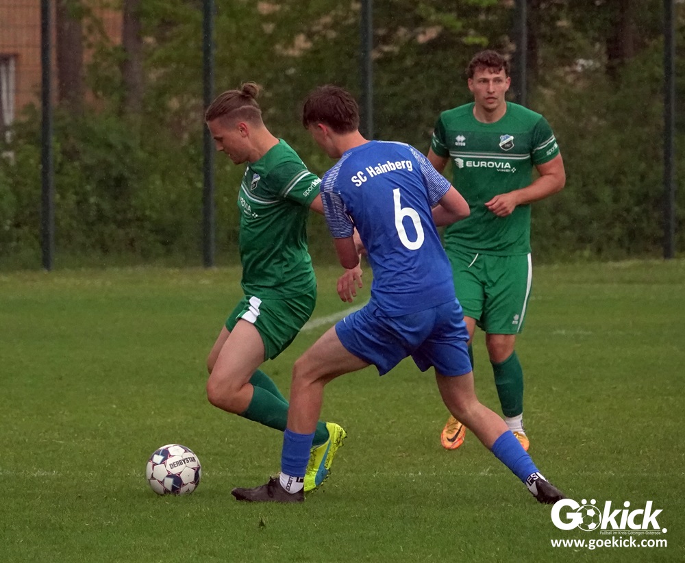 Der Gast ging nach elf Minuten durch Philipp Papenberg in Führung. Nach einem langen Eckstoß wurde der Ball wieder in den Fünfmeterraum der Hainberger geköpft, wo der Torschütze nur noch den Fuß hinhalten musste. Schlechte Nachrichten erhielt das Hainberger Trainerduo nach 26 Minuten. Daniel Laurin Petzke wurde wegen wiederholtem Foulspiel mit Gelb-Roter Karte des Feldes verwiesen. Bis zum Halbzeitpfiff blieb es bei der knappen Gäste-Führung.