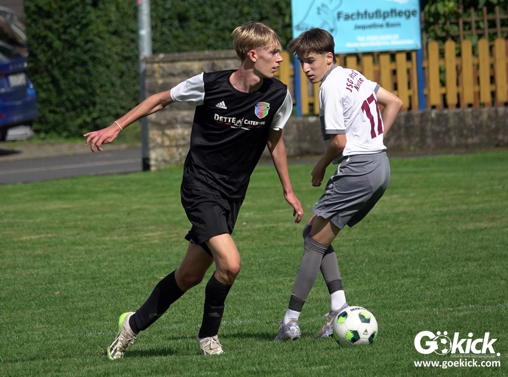 Zunächst jedoch hatten die Gäste allen Grund zur Freude. Angeführt von Trainer Hergen Müller zeigten sie eine engagierte Vorstellung und gingen durch ihren auffälligen Spielmacher Fadlan Deari in Führung. Erst zirkelte dieser in der 27. Minute einen Freistoß aus halbrechter Position präzise in die lange Ecke (Video), dann erhöhte er nur fünf Minuten später, als er nach einem Steilpass Torwart Johann Gräve ausspielte und sicher einschob. Geschlossenheit und Zielstrebigkeit brachten die JSG nach einer halben Stunde verdient mit 2:0 nach vorn.