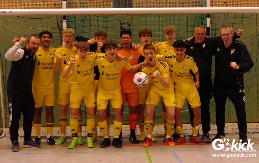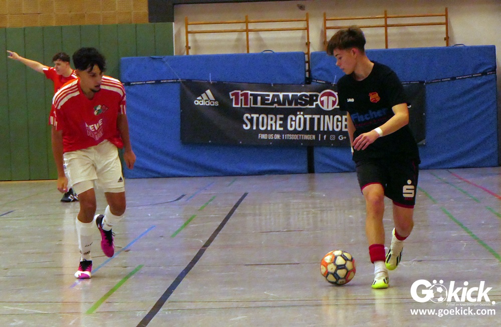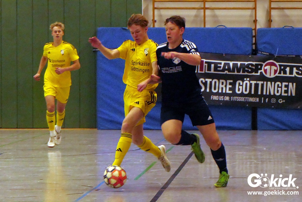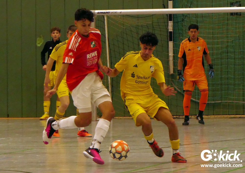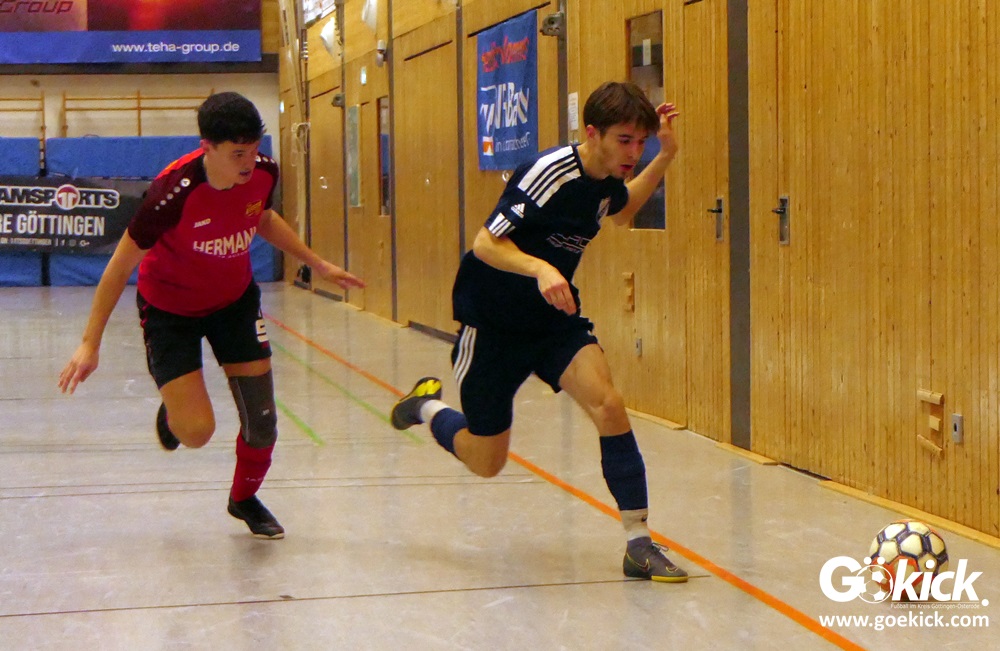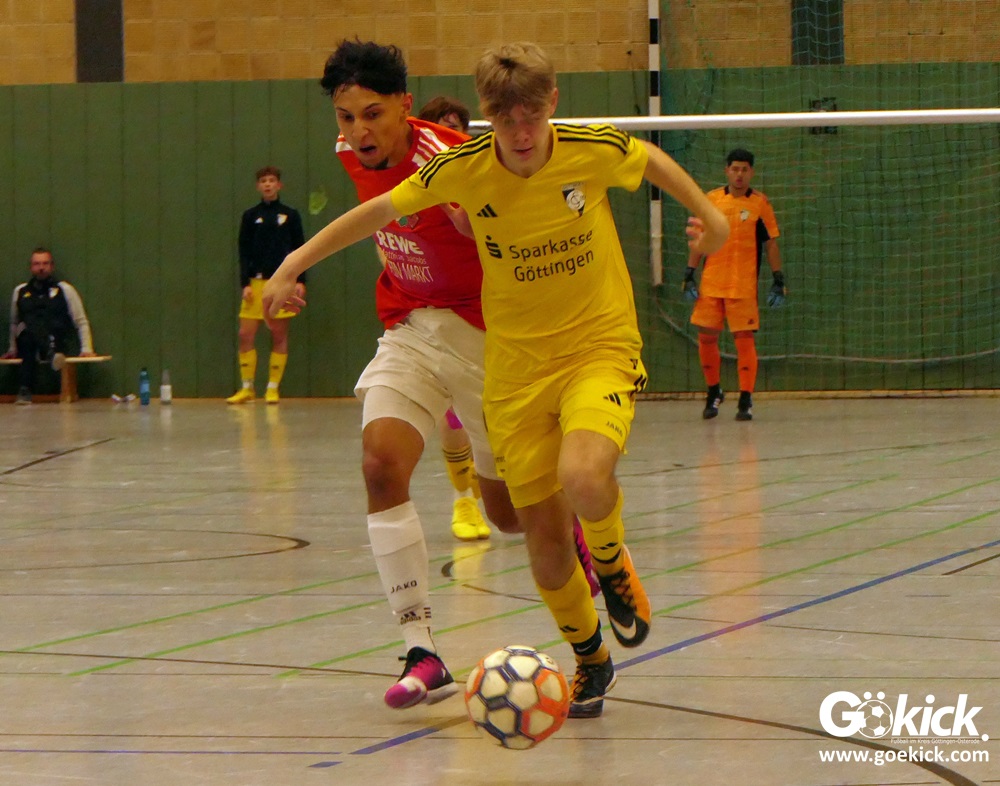 Der DSC-Indoor-Cup des Dransfelder SC in der Sporthalle Lange Trift gilt traditionell als Generalprobe für den am Donnerstag beginnenden REWE JUNIORCUP in der Göttinger Lokhalle. Die besten regionalen A-Jugend-Mannschaften treffen sich dort zwischen den Jahren, um sich noch einmal auf das Spiel auf dem begrenzten Spielfeld einer Sporthalle intensiv vorbereiten zu können. Auch, wenn das Hallenparkett nicht mit der Kunstrasenfläche in der Lokhalle zu vergleichen ist, so zeigte der Niedersachsenligist 1. SC Göttingen 05 am Finaltag die beste Leistung.