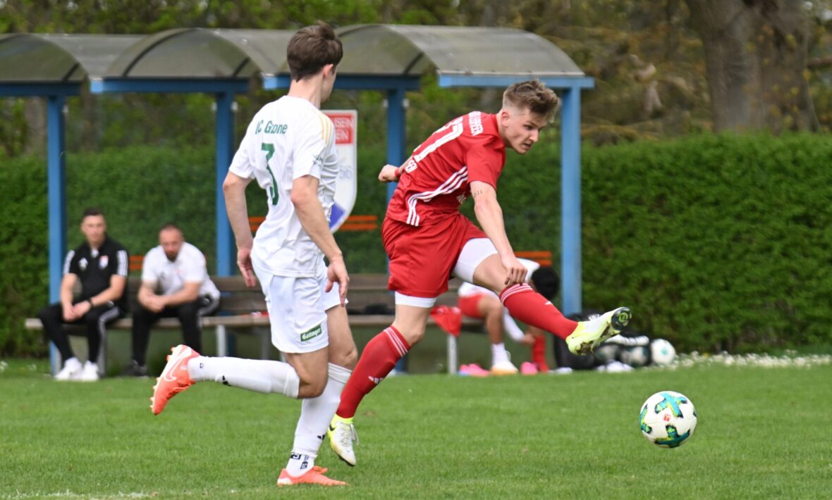 Der FC Grone hat das Rettende Ufer in der Bezirksliga wieder in Sichtweise bekommen. Am Ostermontag gewann das Team von Trainer Jan Ringling im Nachholspiel des 21. Spieltages in der Nachbarschaft bei der SV Groß Ellershausen/Hetjershausen mit 3:1 (1:0). Durch diesen Derby-Sieg gibt der FCG die Rote Laterne an den FC Hettensen/Ellierode weiter und klettert auf Platz fünfzehn. Der Abstand zu den Nichtabstiegsplätzen beträgt nur noch drei Punkte. Allerdings hat das grün-weiße Team bereits die meisten Spiele der Abstiegszone absolviert und damit weniger Möglichkeiten, Punkte zu sammeln, als die Konkurrenz. Der Gast von Trainer Ercan Beyazit bleibt Siebter der Spielklasse. Obwohl Aufsteiger weiterhin mit dem Abstieg nicht zu tun hat, wartet die SVGE schon seit nunmehr drei Spielen auf einen Sieg.