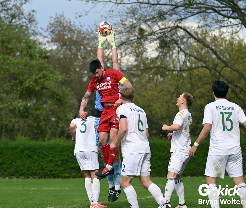 Der FC Grone hat das Rettende Ufer in der Bezirksliga wieder in Sichtweise bekommen. Am Ostermontag gewann das Team von Trainer Jan Ringling im Nachholspiel des 21. Spieltages in der Nachbarschaft bei der SV Groß Ellershausen/Hetjershausen mit 3:1 (1:0). Durch diesen Derby-Sieg gibt der FCG die Rote Laterne an den FC Hettensen/Ellierode weiter und klettert auf Platz fünfzehn. Der Abstand zu den Nichtabstiegsplätzen beträgt nur noch drei Punkte. Allerdings hat das grün-weiße Team bereits die meisten Spiele der Abstiegszone absolviert und damit weniger Möglichkeiten, Punkte zu sammeln, als die Konkurrenz. Der Gast von Trainer Ercan Beyazit bleibt Siebter der Spielklasse. Obwohl Aufsteiger weiterhin mit dem Abstieg nicht zu tun hat, wartet die SVGE schon seit nunmehr drei Spielen auf einen Sieg.