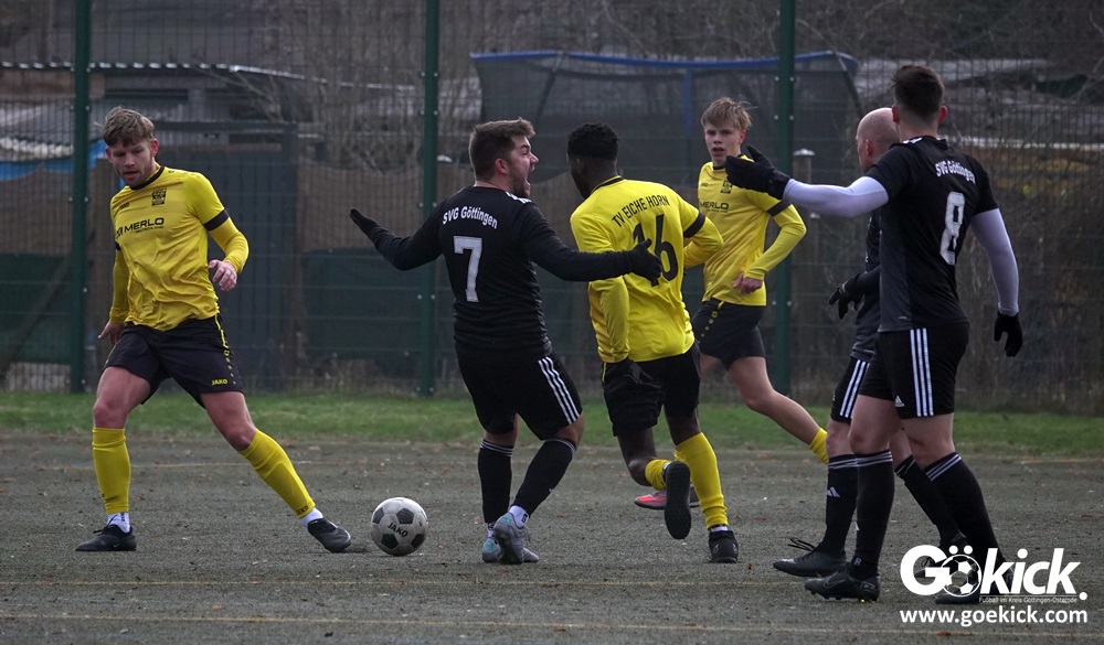 Bis zur Halbzeit verteidigte die SVG Göttingen aufmerksam und ließ den Gästen von Trainer Thomas Führer wenig Raum zur Entfaltung. Auch nach dem Seitenwechsel blieb das Bild ähnlich. Trotz der Belastungen aus intensiven Trainingstagen präsentierte sich der Gastgeber laufstark, zweikampffreudig und geschlossen. Der TV Eiche Horn fand keine Mittel, um die gut organisierte Defensive ernsthaft in Bedrängnis zu bringen.