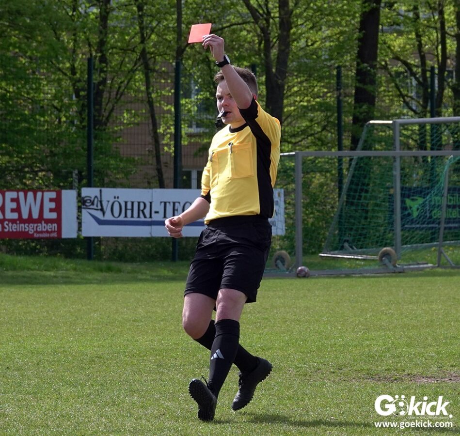 Die erste Halbzeit blieb ohne Treffer, bot jedoch eine Szene mit erheblicher Wirkung. In der 41. Spielminute stoppte Hainbergs Abwehrspieler Vanja Gligoric den durchgebrochenen Alfredo Yeboah mit einer Notbremse und sah die Rote Karte. Kurz darauf beendete Schiedsrichter Janek Klötzer den ersten Durchgang. Damit standen die Gastgeber vor der Aufgabe, die Partie in Unterzahl zu bewältigen.