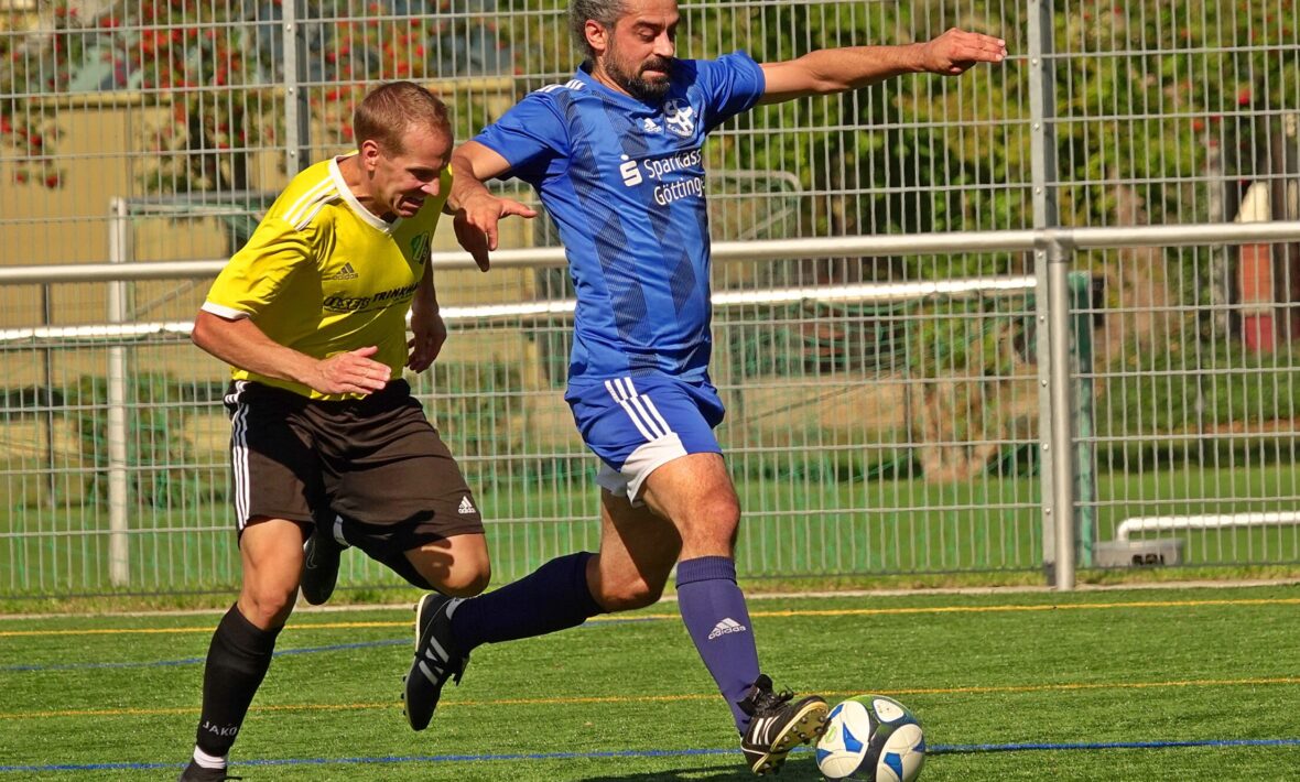 Die Gäste gingen bereit nach fünf Minuten durch Dennis Steinmetz mit 1:0 in Führung. Nur vier Minuten später konnte Ex-Profi Özgür Bilge auf 2:0 erhöhen. Praktisch im Gegenzug keimte durch den Treffer von Shamdin Dalil (10.) Hoffnung bei den Gastgebern auf. Doch Johannes Schweiger stellte nach 25 Minuten auf 3:1. Der Hainberger Elmar Schulte brachte sein Team nach 40 Minuten durch das 4:1 deutlich in Front. Doch Ricardo Castro Hernandez gelang es, die Hainberger Torwart-Legende Reinhard Penno per Kopf zu überwinden (42). Mit dem 2:4 aus Sicht der Gastgeber wurden auf dem Kunstrasenplatz in Geismar die Seiten gewechselt.