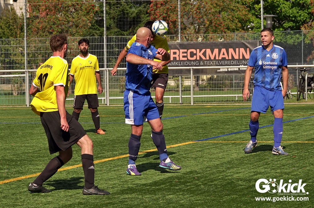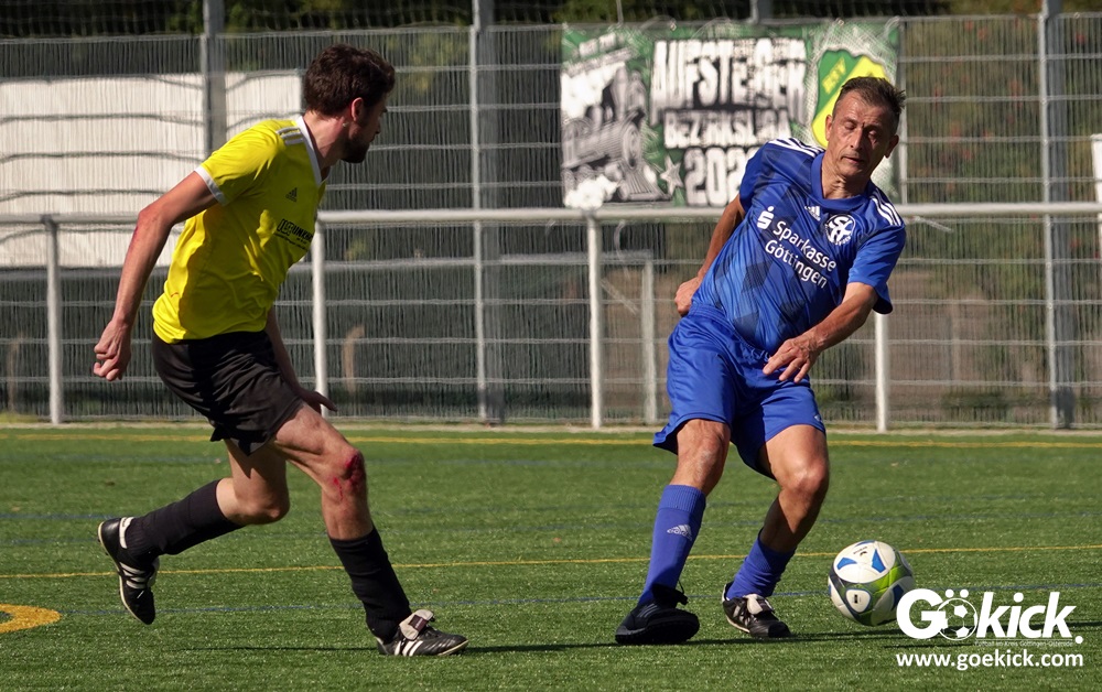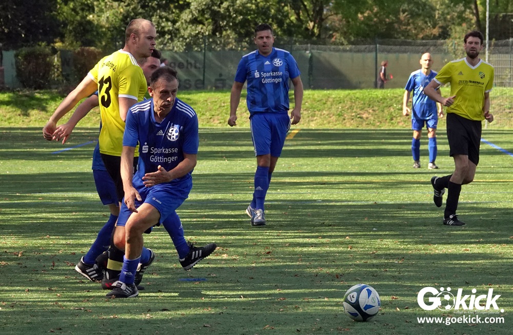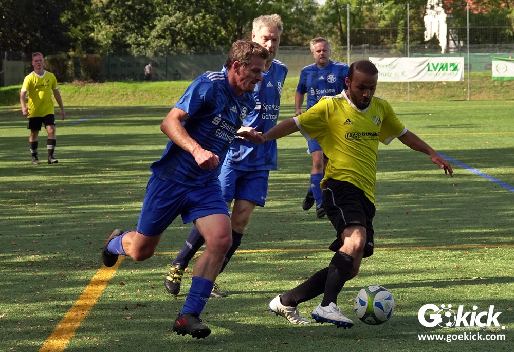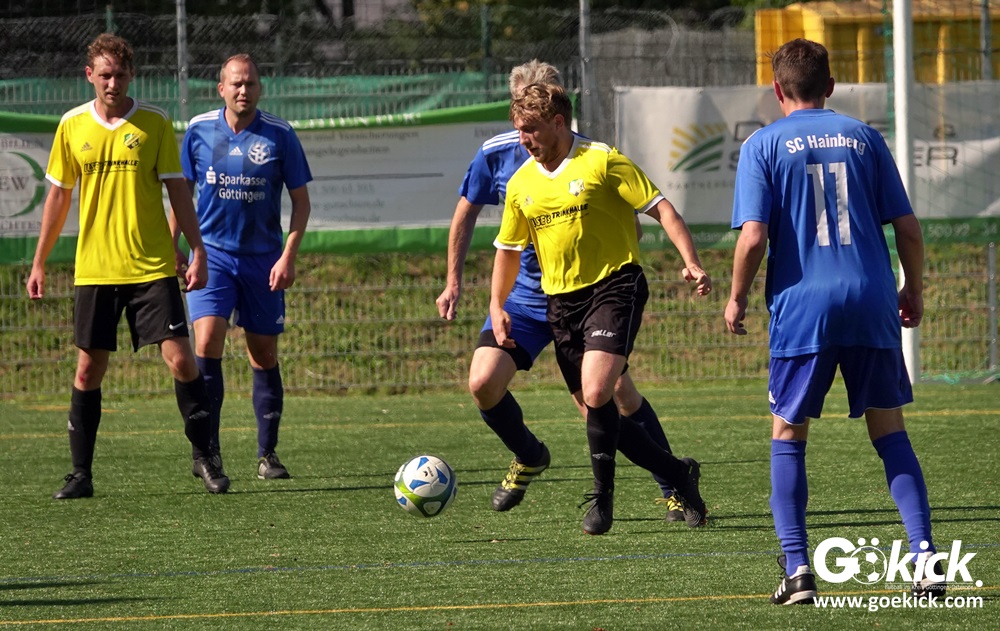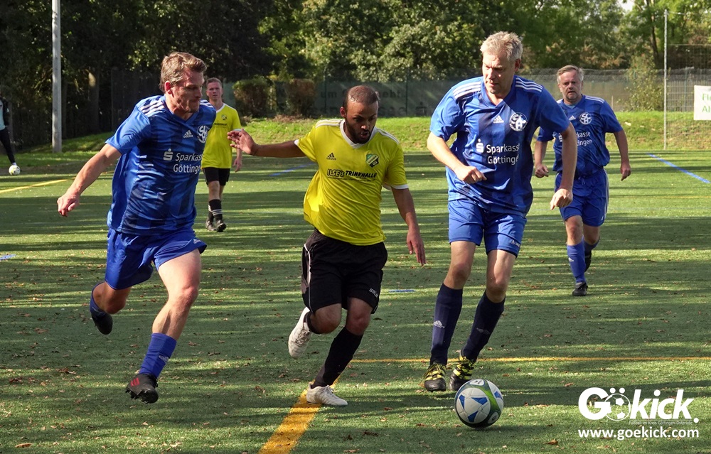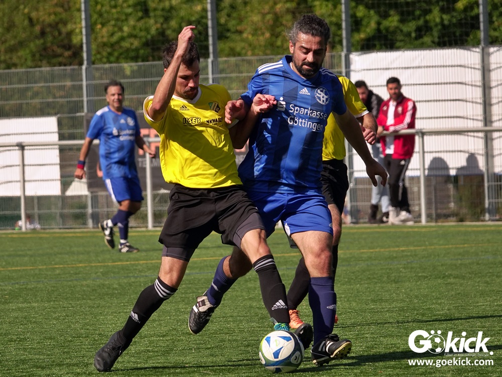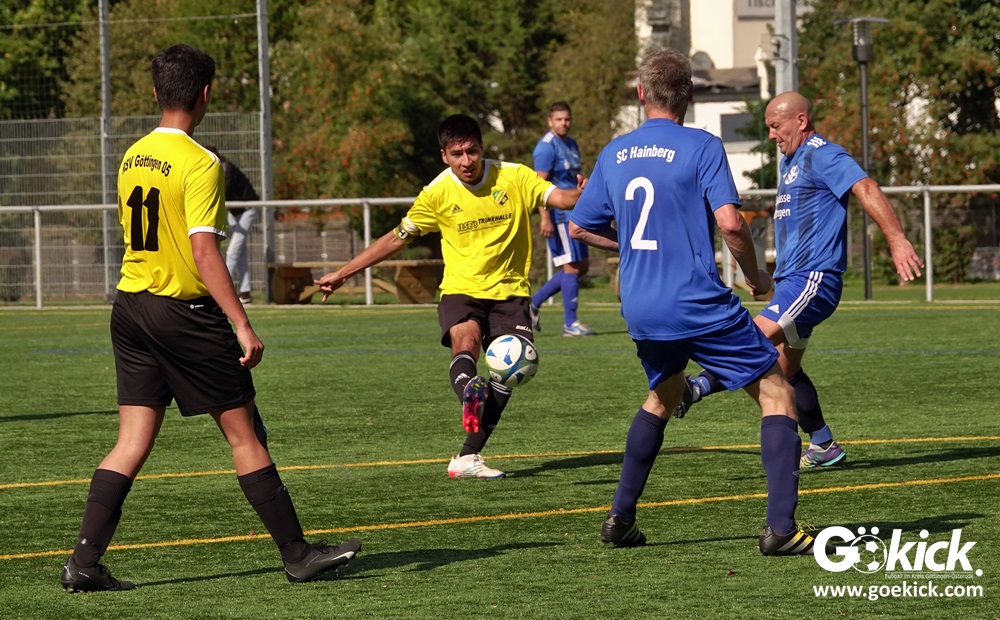 Die Gäste gingen bereit nach fünf Minuten durch Dennis Steinmetz mit 1:0 in Führung. Nur vier Minuten später konnte Ex-Profi Özgür Bilge auf 2:0 erhöhen. Praktisch im Gegenzug keimte durch den Treffer von Shamdin Dalil (10.) Hoffnung bei den Gastgebern auf. Doch Johannes Schweiger stellte nach 25 Minuten auf 3:1. Der Hainberger Elmar Schulte brachte sein Team nach 40 Minuten durch das 4:1 deutlich in Front. Doch Ricardo Castro Hernandez gelang es, die Hainberger Torwart-Legende Reinhard Penno per Kopf zu überwinden (42). Mit dem 2:4 aus Sicht der Gastgeber wurden auf dem Kunstrasenplatz in Geismar die Seiten gewechselt.