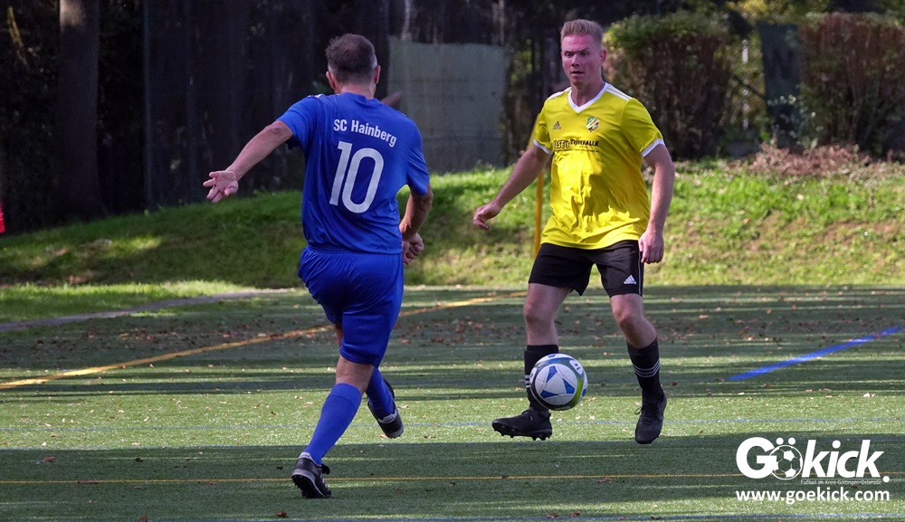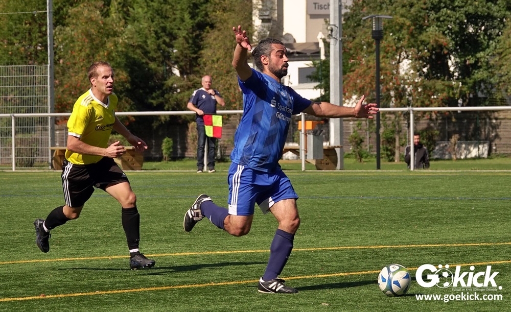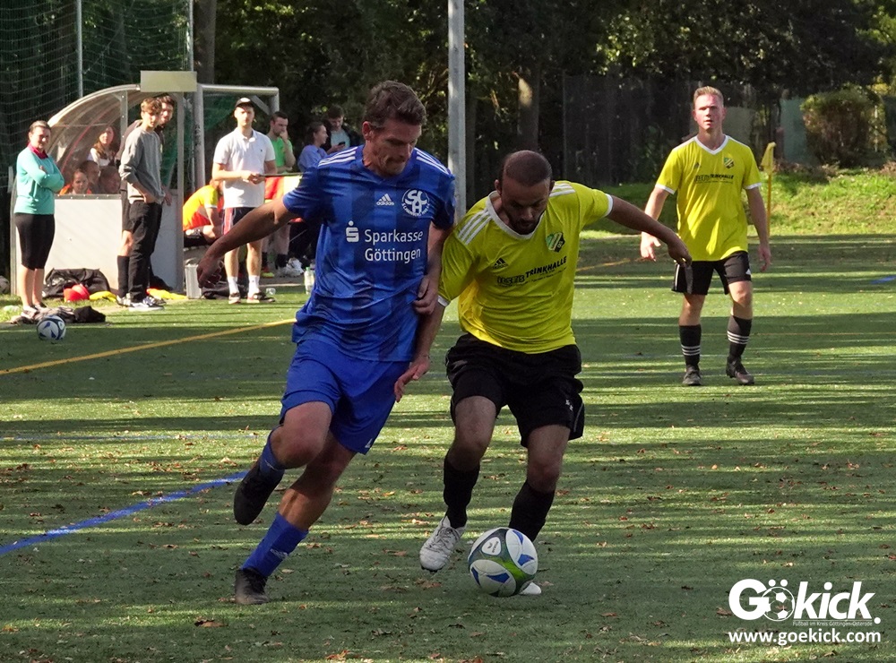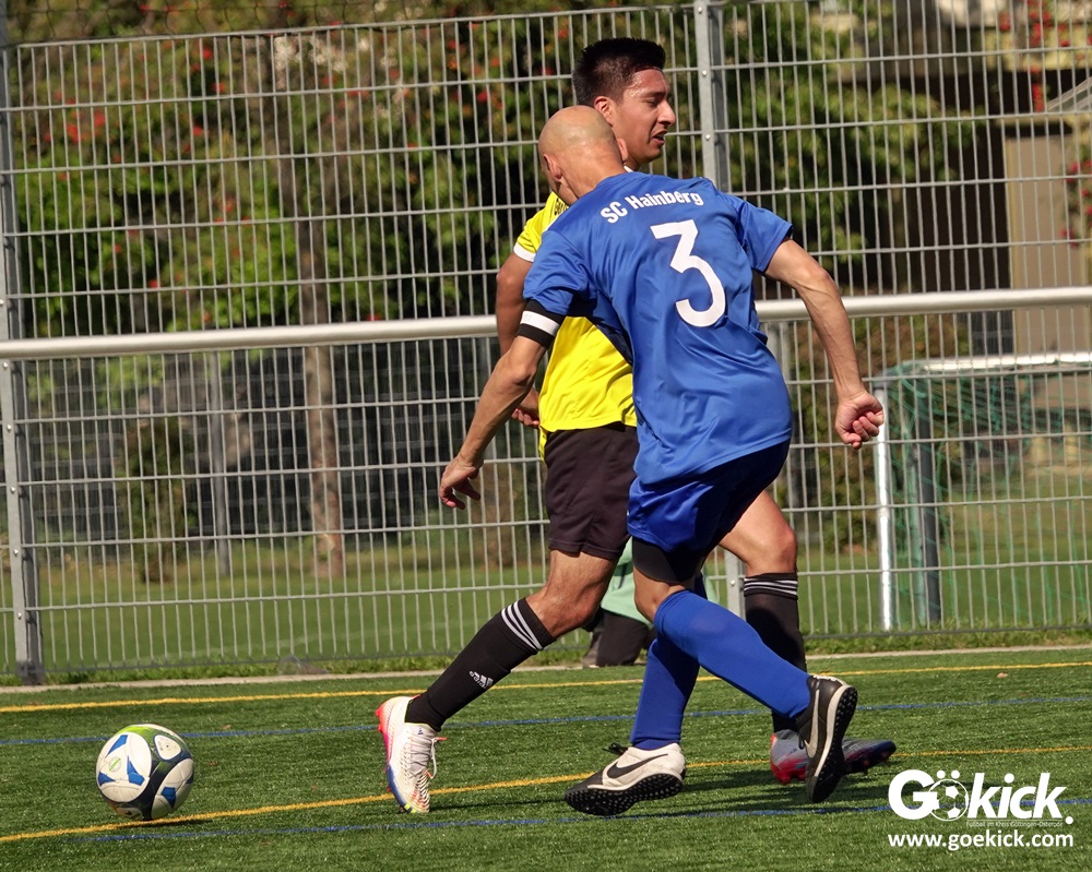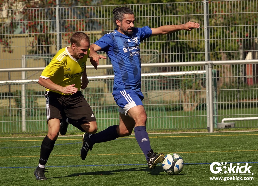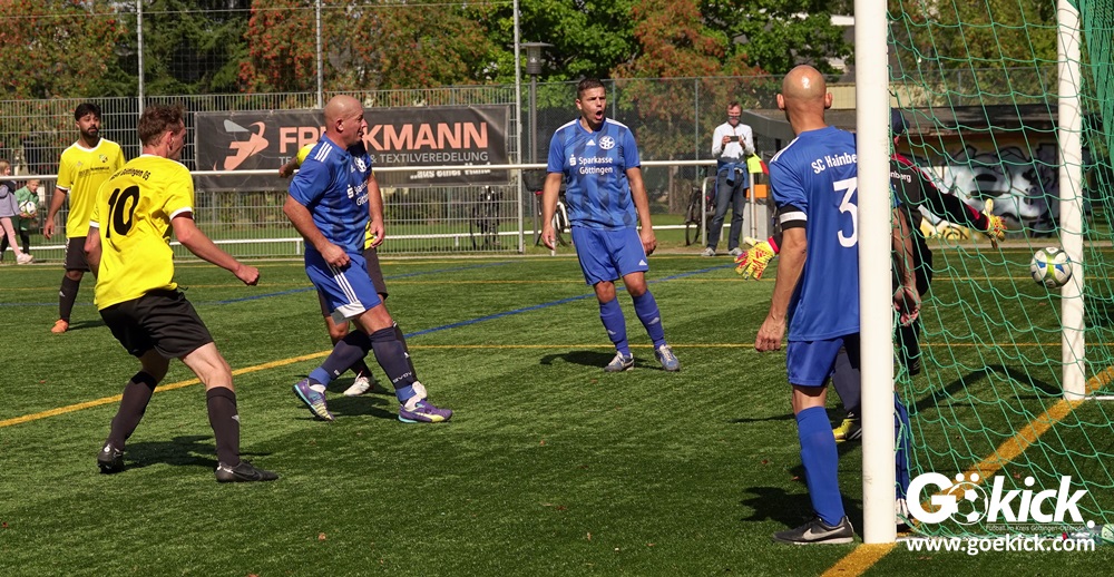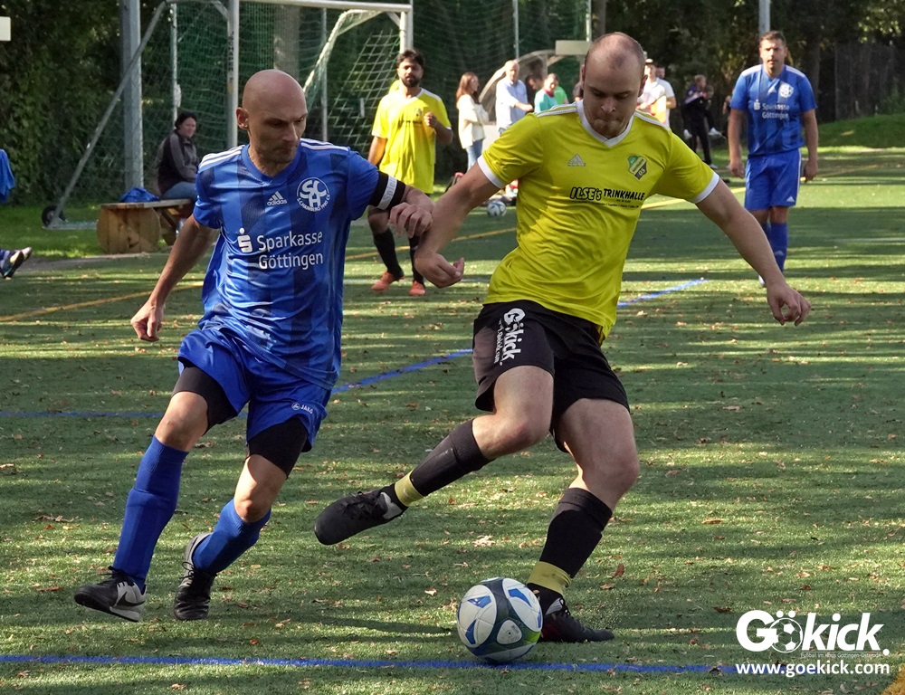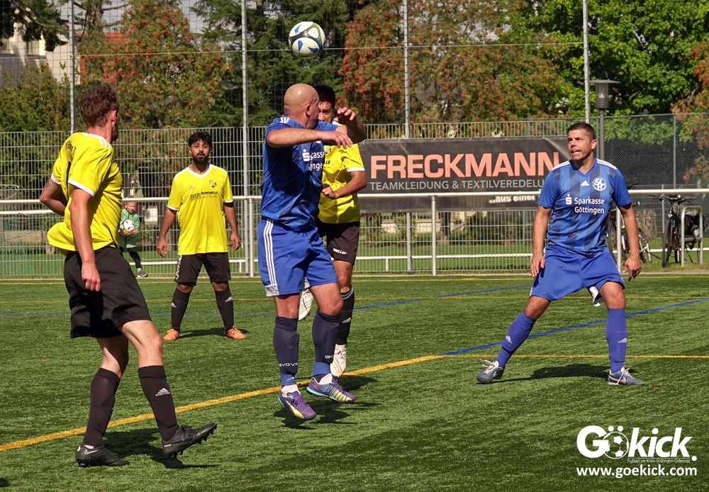 Die Gäste gingen bereit nach fünf Minuten durch Dennis Steinmetz mit 1:0 in Führung. Nur vier Minuten später konnte Ex-Profi Özgür Bilge auf 2:0 erhöhen. Praktisch im Gegenzug keimte durch den Treffer von Shamdin Dalil (10.) Hoffnung bei den Gastgebern auf. Doch Johannes Schweiger stellte nach 25 Minuten auf 3:1. Der Hainberger Elmar Schulte brachte sein Team nach 40 Minuten durch das 4:1 deutlich in Front. Doch Ricardo Castro Hernandez gelang es, die Hainberger Torwart-Legende Reinhard Penno per Kopf zu überwinden (42). Mit dem 2:4 aus Sicht der Gastgeber wurden auf dem Kunstrasenplatz in Geismar die Seiten gewechselt.
