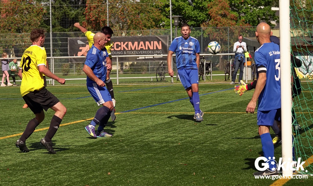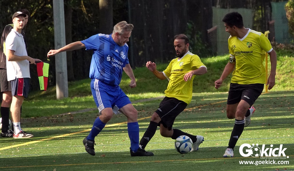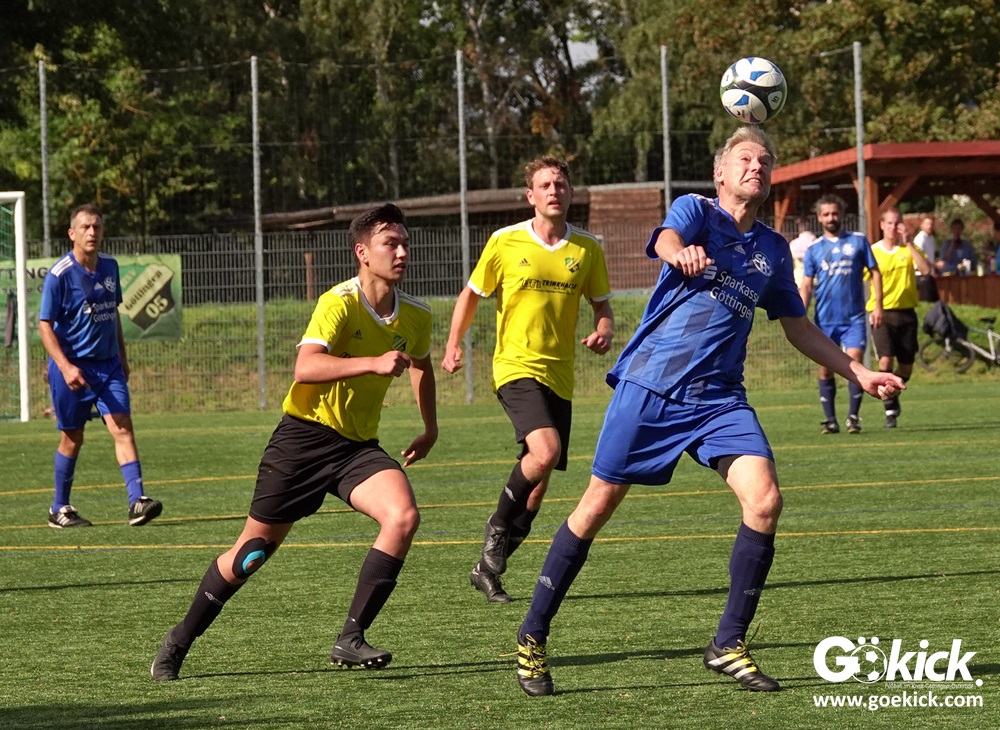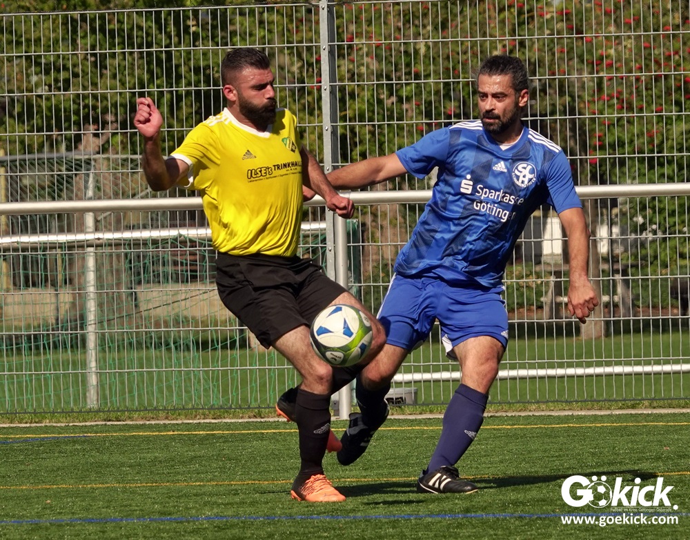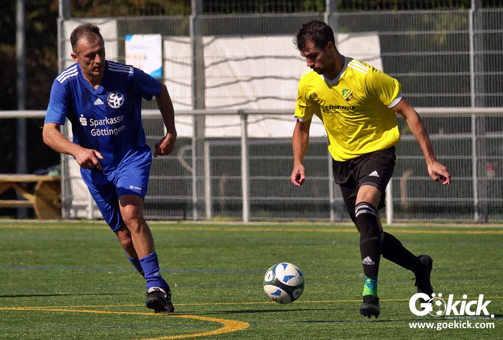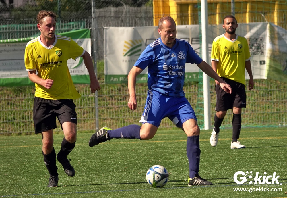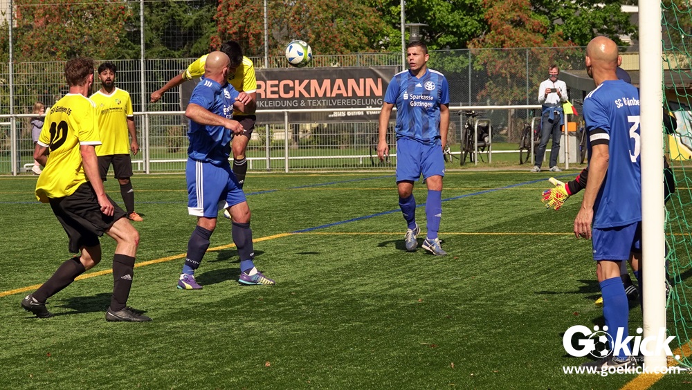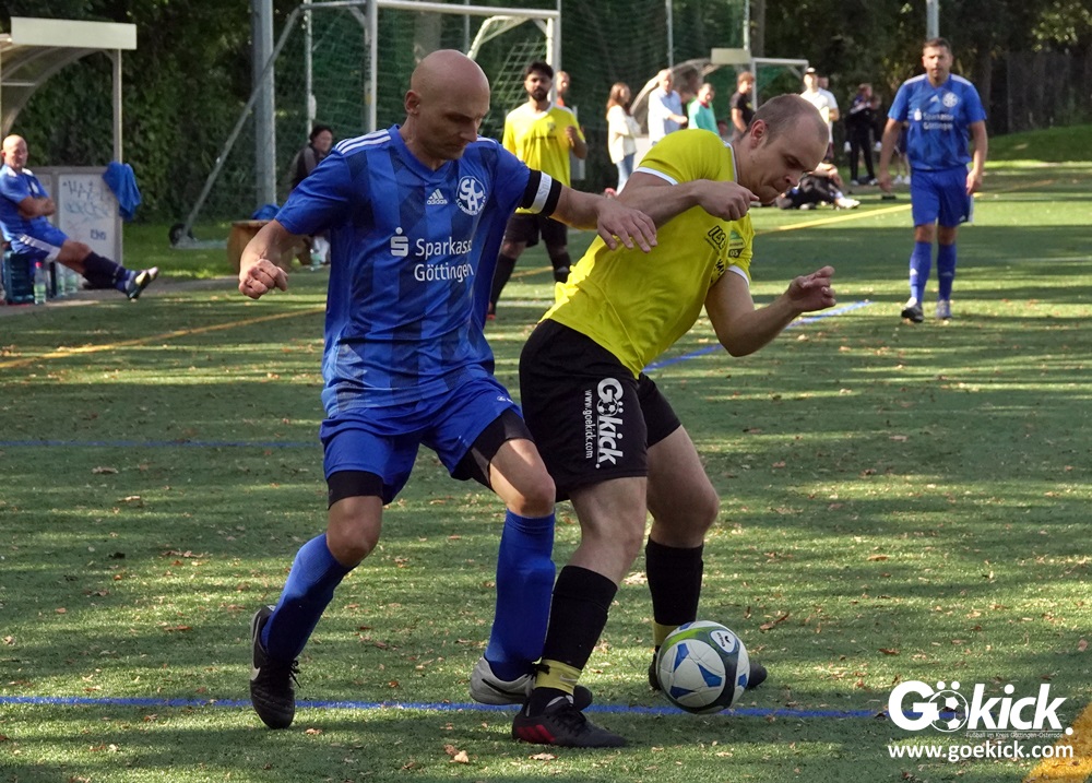 Die Gäste gingen bereit nach fünf Minuten durch Dennis Steinmetz mit 1:0 in Führung. Nur vier Minuten später konnte Ex-Profi Özgür Bilge auf 2:0 erhöhen. Praktisch im Gegenzug keimte durch den Treffer von Shamdin Dalil (10.) Hoffnung bei den Gastgebern auf. Doch Johannes Schweiger stellte nach 25 Minuten auf 3:1. Der Hainberger Elmar Schulte brachte sein Team nach 40 Minuten durch das 4:1 deutlich in Front. Doch Ricardo Castro Hernandez gelang es, die Hainberger Torwart-Legende Reinhard Penno per Kopf zu überwinden (42). Mit dem 2:4 aus Sicht der Gastgeber wurden auf dem Kunstrasenplatz in Geismar die Seiten gewechselt.