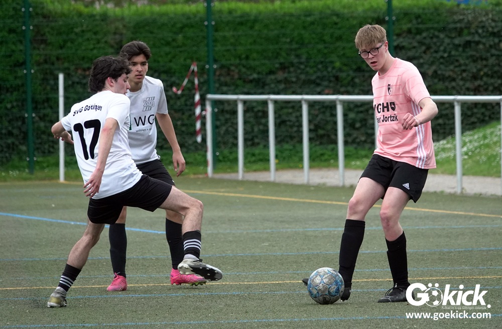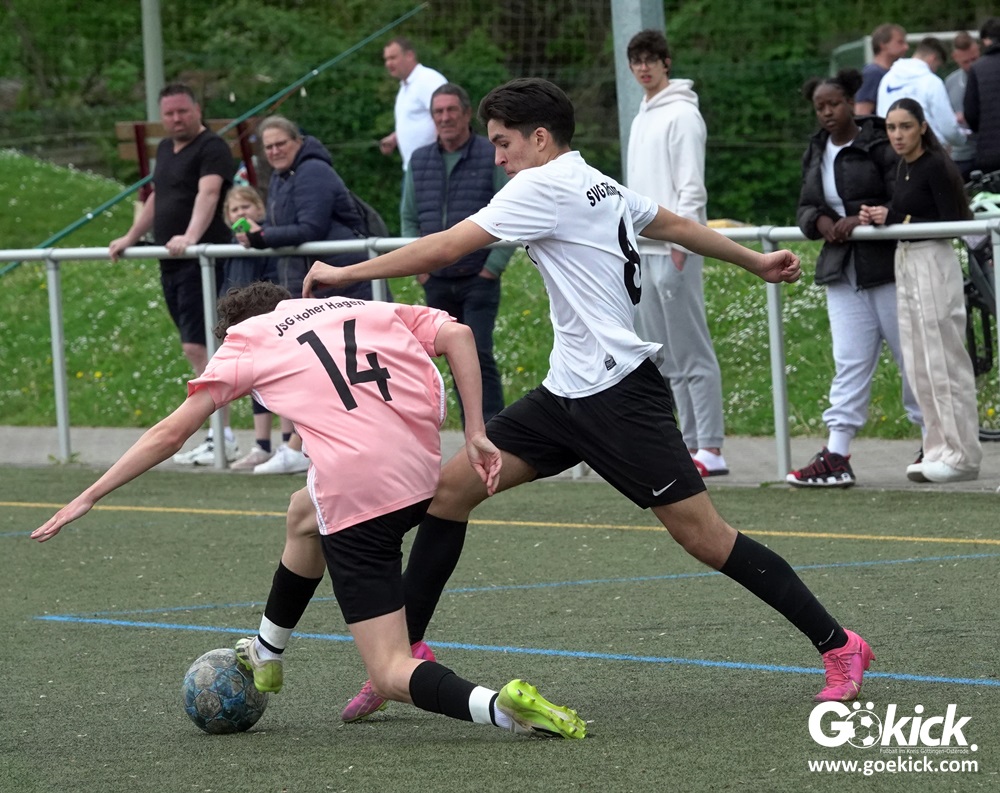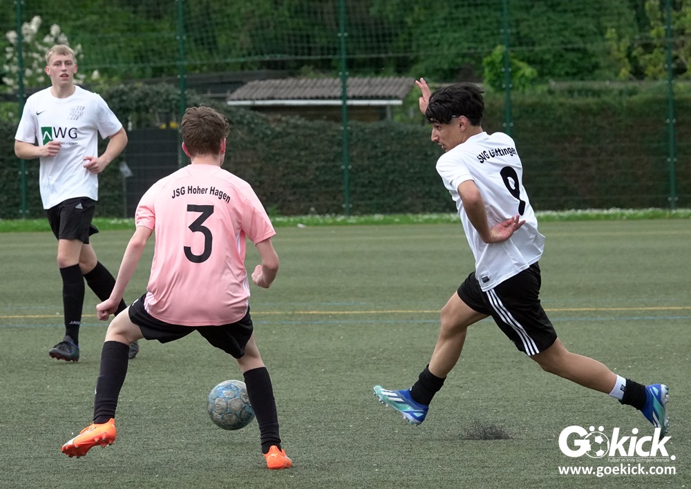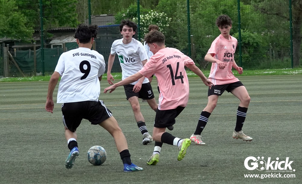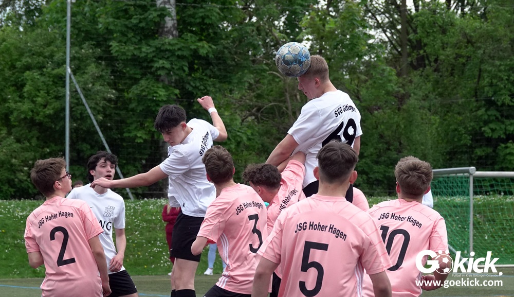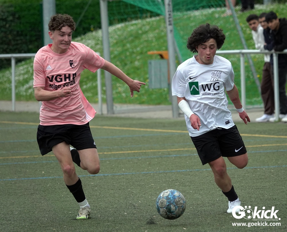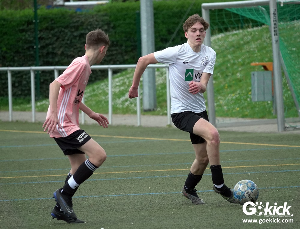 Es war das mit Spannung erwartete Spitzenspiel der B-Jugend-Kreisliga Süd zwischen dem Tabellenzweiten SVG Göttingen und dem Anführer des Klassements, der JSG Hoher Hagen/Lindenberg Adelebsen. Nach einer unterhaltsamen Partie auf dem Kunstrasenplatz des KRÜGERPARKs am Sandweg siegte der Gast knapp, aber nicht unverdient mit 2:1 (2:0). Mit diesem Sieg baut die JSG aus dem Süd-Westen der Region ihren Vorsprung weiter aus, er beträgt jetzt fünf Punkte. Allerdings hat die SVG zwei Spiele weniger absolviert und könnte mit zwei Siegen noch an die Spitze springen.
