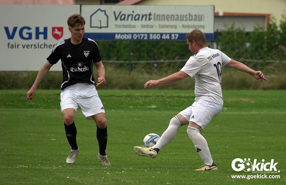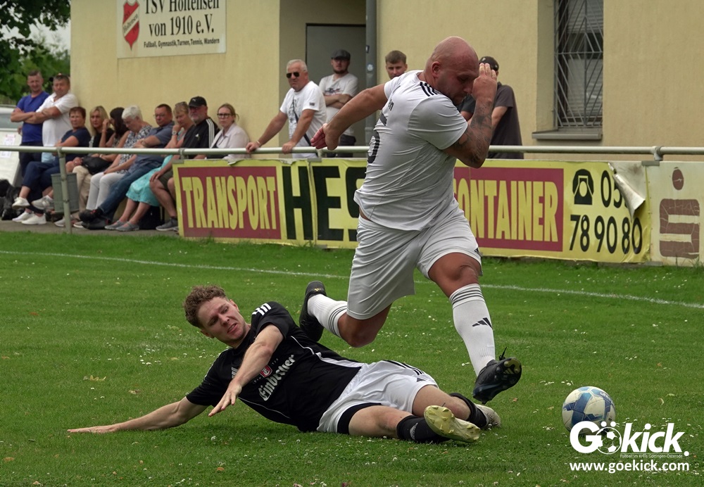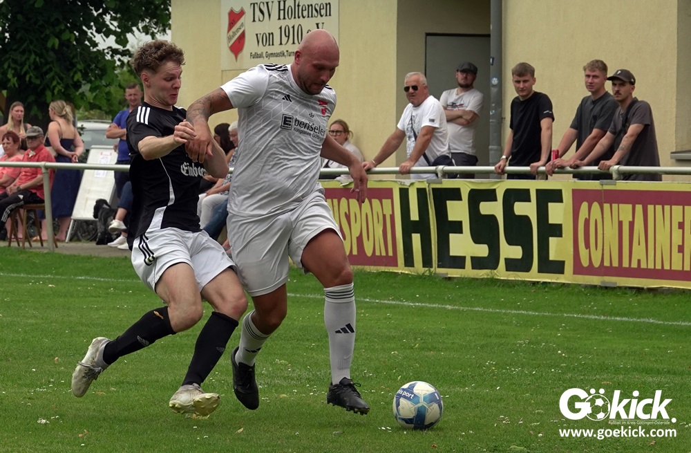 Holtensens Trainer ließ einige seiner etablierten Stammkräfte zunächst auf der Bank. Zwar hatte der Gastgeber deutlich mehr vom Spiel, doch die Gäste verteidigten geschickt und mit großem Einsatz ihr Tor. Auch die Präzision bei den Weitschüssen der TSV-Offensive ließ in Durchgang eins zu wünschen übrig. Fünf Minuten vor dem regulären Ende der Partie dann die Quittung für den Gastgeber, der eigentlich zu Sonderpreisen mit seinem Anhang die Saison mit der Meisterfeier ausklingen lassen wollte: Tim Schühle traf mit großartigem Weitschuss direkt neben den Pfosten zum 1:0 für die Gäste. Damit ging es auch in die Kabine.