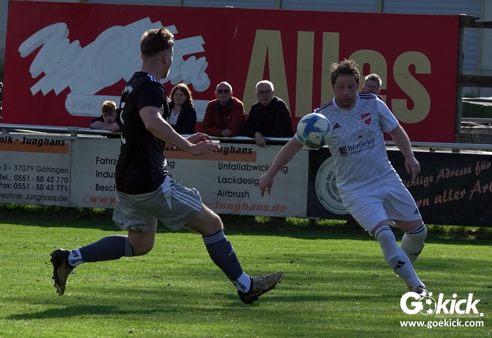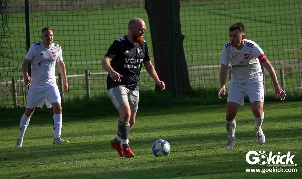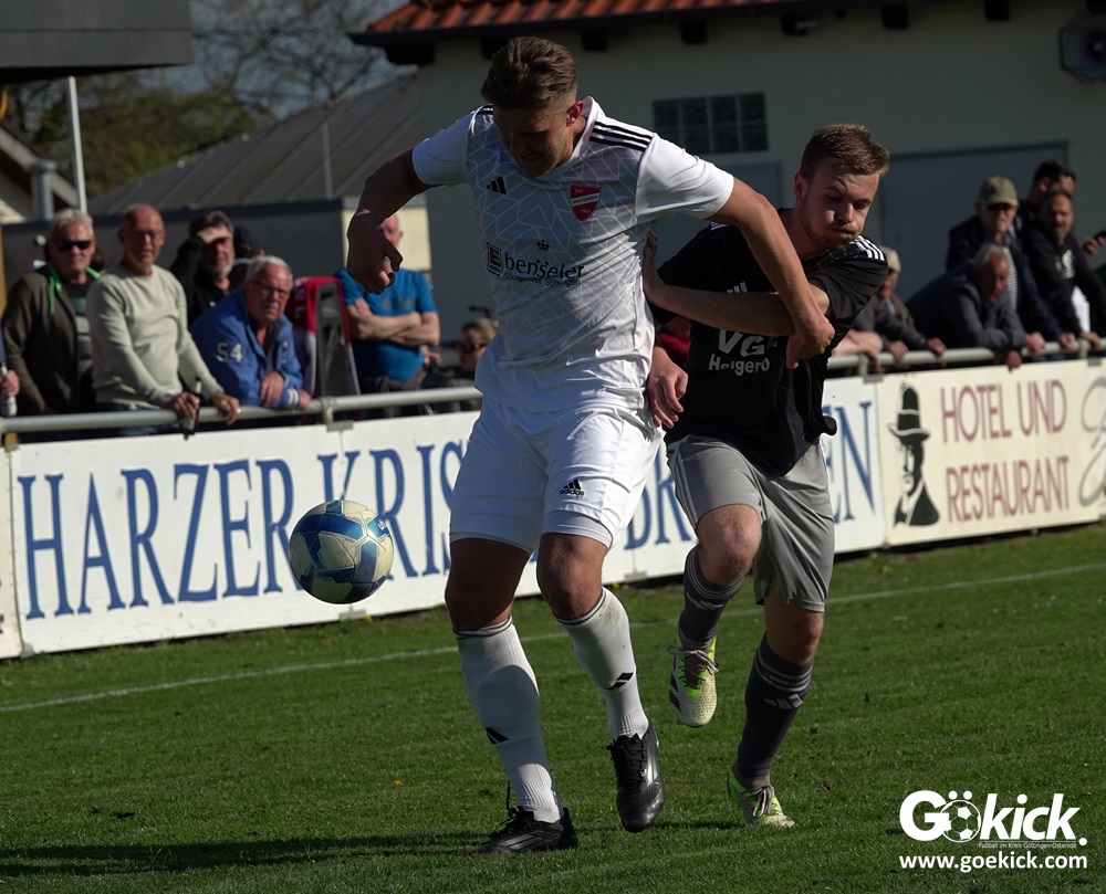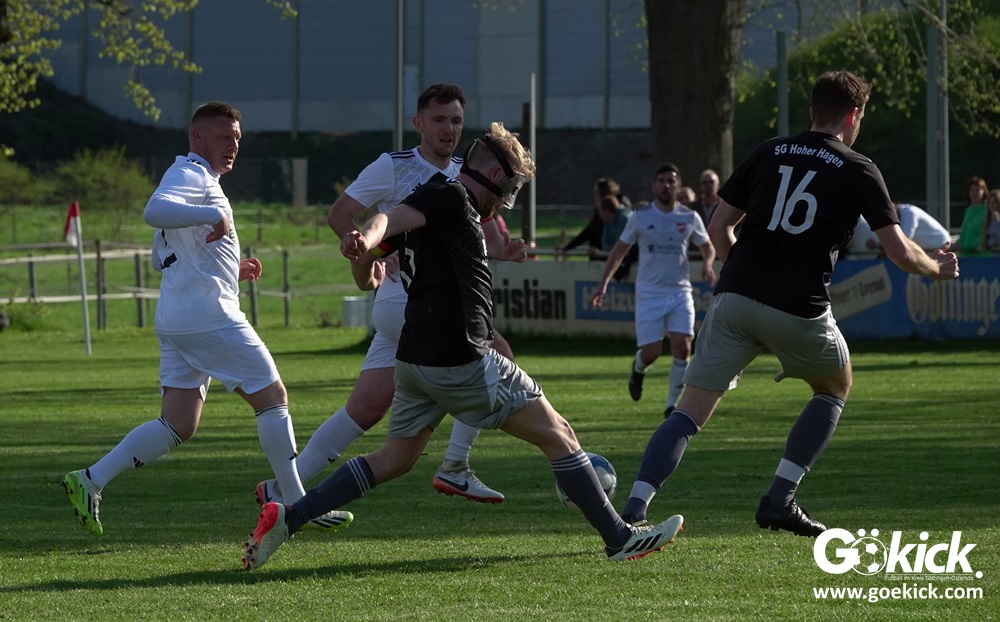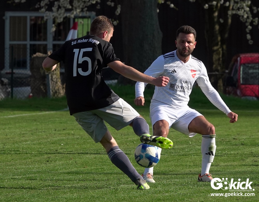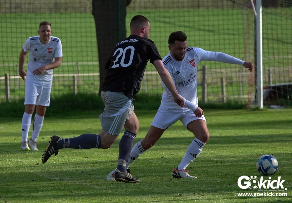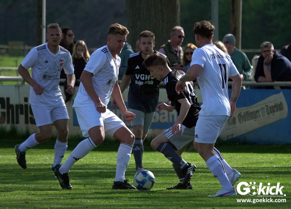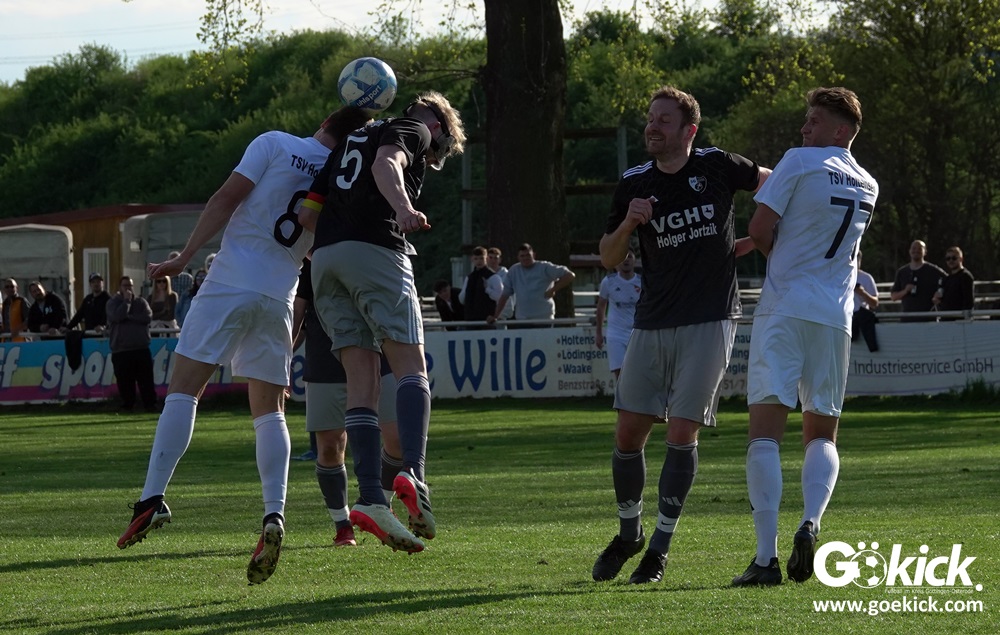 Für den TSV begann das zweite Spitzenspiel in Folge – eine Woche zuvor war er mit 4:1 in Geismar siegreich – nach Wunsch. Nico Makowski köpfte nach acht Minuten zur Führung für die Hausherren ein. Nur drei Minuten später erhöhte Viktor Gerliz mit seinem starken linken Fuß auf 2:0. Weitere Treffer verhinderte vor allem Hoher Hagens Schlussmann Joshua Schouten. Kurz vor dem Seitenwechsel schickte der gut leitende Schiedsrichter Christian Schläger den Gäste-Spieler Nikolai-Simon Krause mit Gelb-Roter Karte zum Duschen. Dennoch blieb es bei der 2:0-Führung bis zur Halbzeitpause.