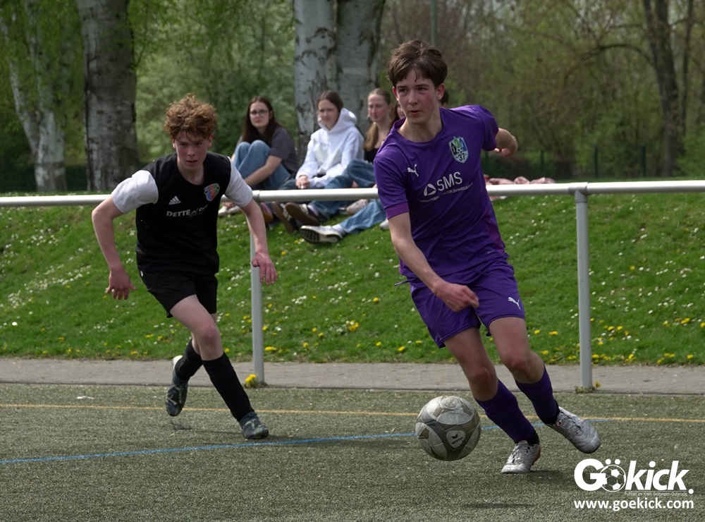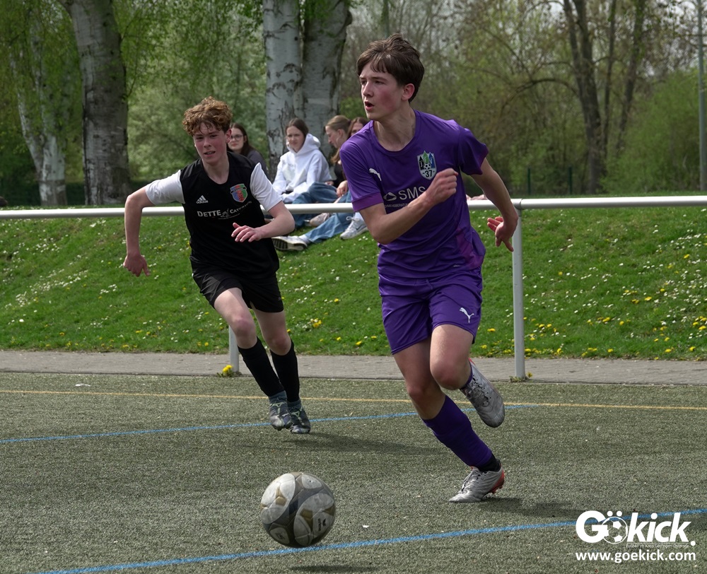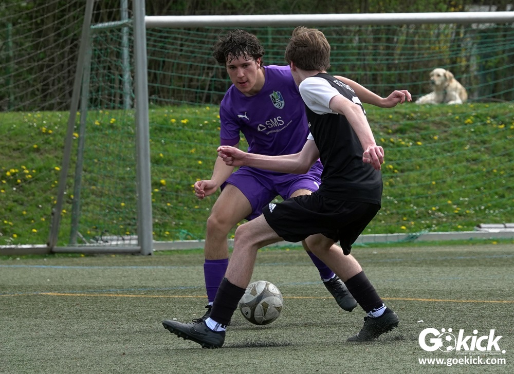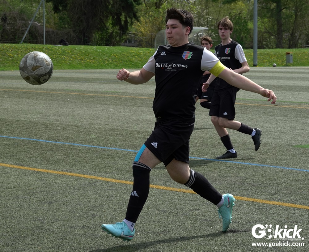Von Beginn an bestimmte die Mannschaft vom Trainerduo Lennart Evers und Maurice Fricke das Geschehen. Gegen tief stehende Gäste, die mit großem Einsatz verteidigten, erarbeitete sich der Tabellenführer zahlreiche Möglichkeiten, ließ jedoch zunächst die nötige Konsequenz im Abschluss vermissen. Erst in der 36. Minute brach Mats Peter Amos den Bann und erzielte die verdiente Führung. Kurz darauf beendete Schiedsrichter Jens Gastrock die erste Halbzeit.