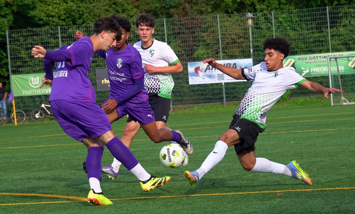 Die Göttinger, betreut vom Trainertrio Timo Ziegler, Michael Lorenz und Daniel Vollbrecht, gingen mit breiter Brust in die Partie. Doch nach einer halben Stunde sorgte Joshua Niemeyer für die kalte Dusche. Mit einem unwiderstehlichen Solo und einem präzisen Schuss mit dem Außenspann ins lange Eck brachte er Acosta in Führung. Kurz vor der Pause jedoch die Antwort des JFV: Gabriel Öztürk traf in der Nachspielzeit der ersten Hälfte zum 1:1 und brachte die Gastgeber zurück ins Spiel. Nach 42 Minuten beendete Schiedsrichter Philip Nordmann den ersten Durchgang.