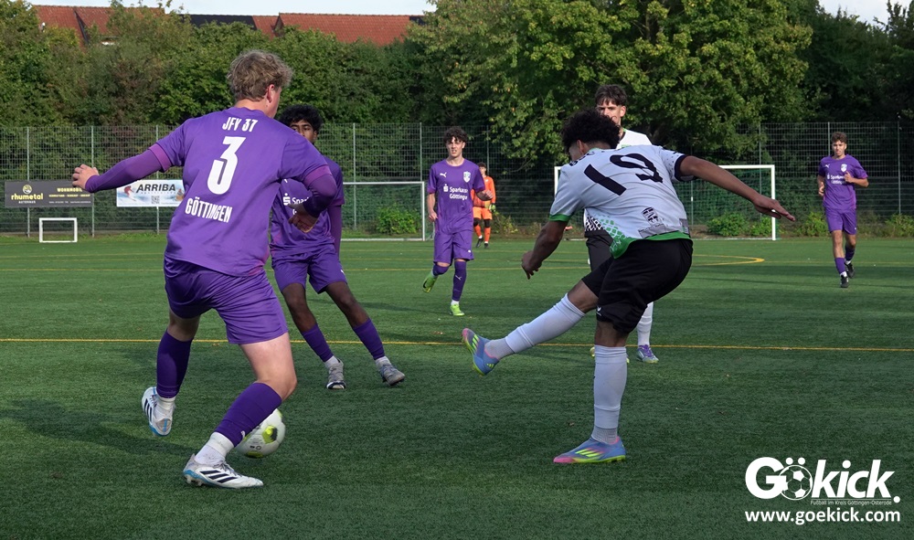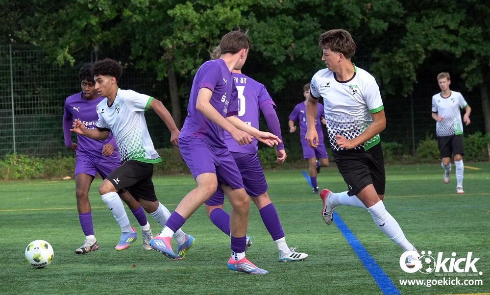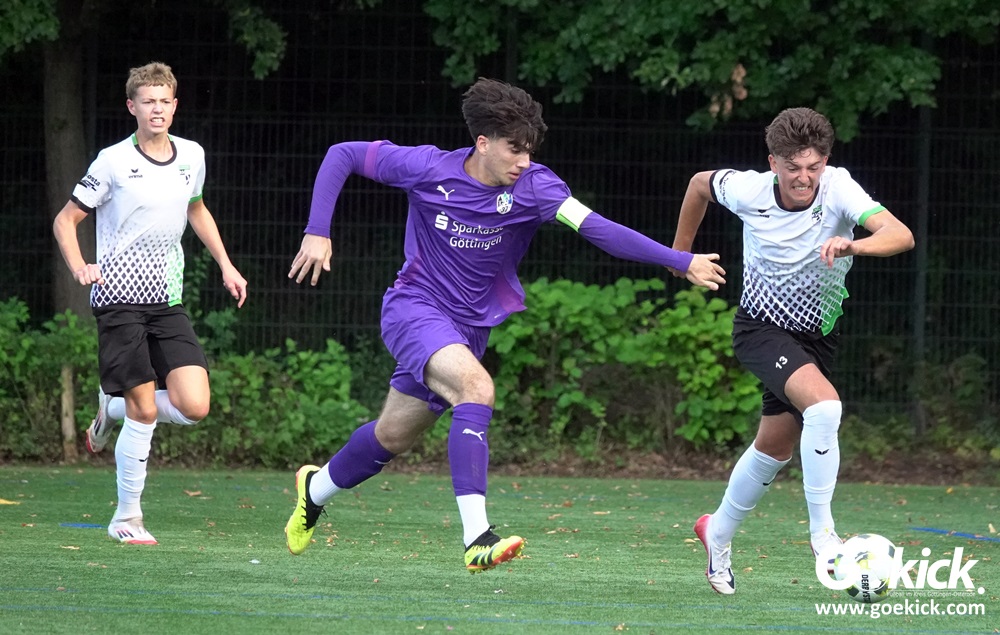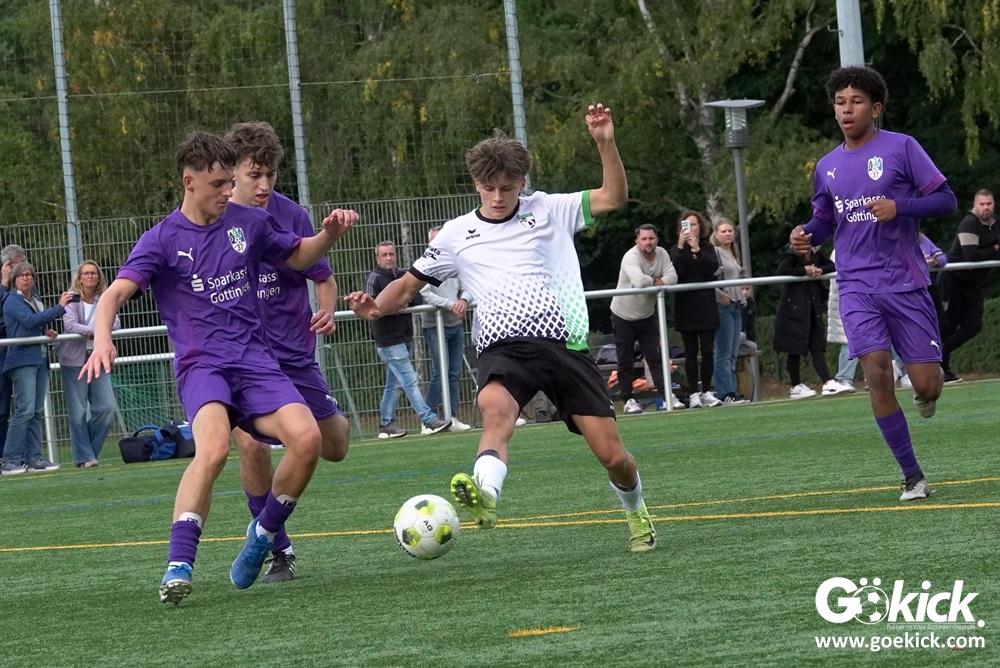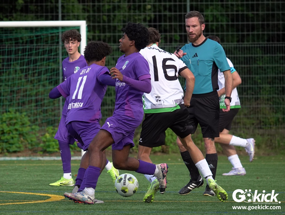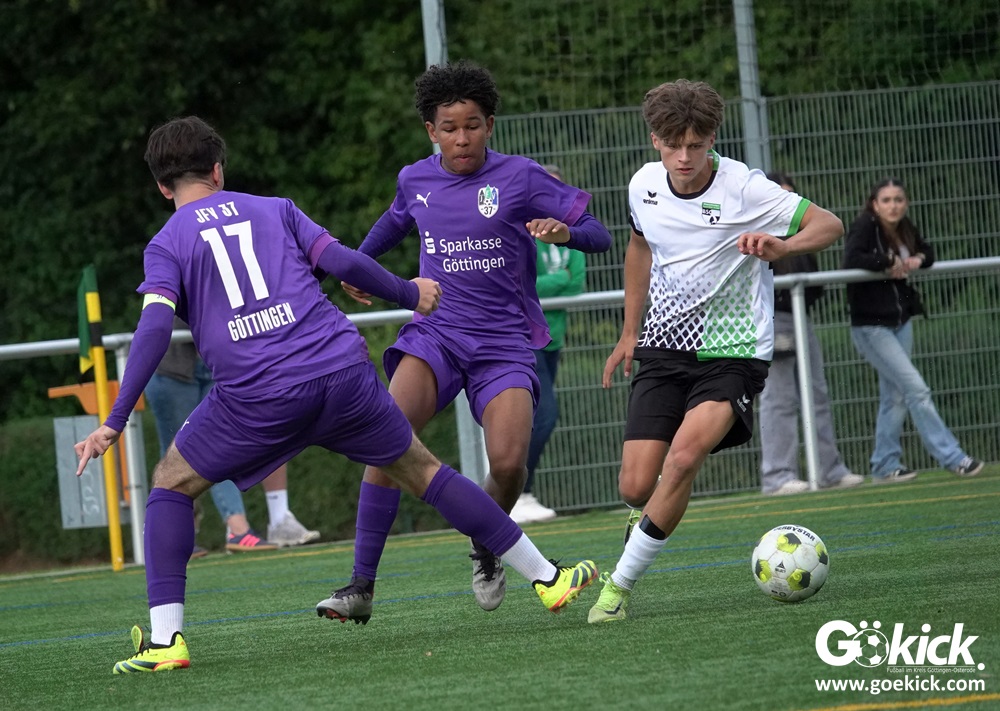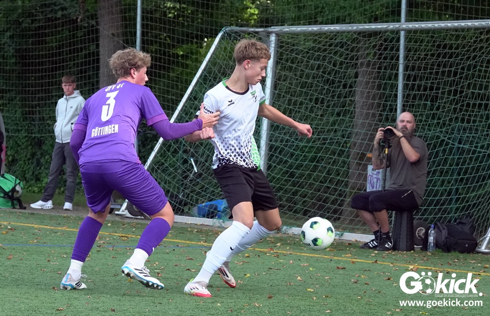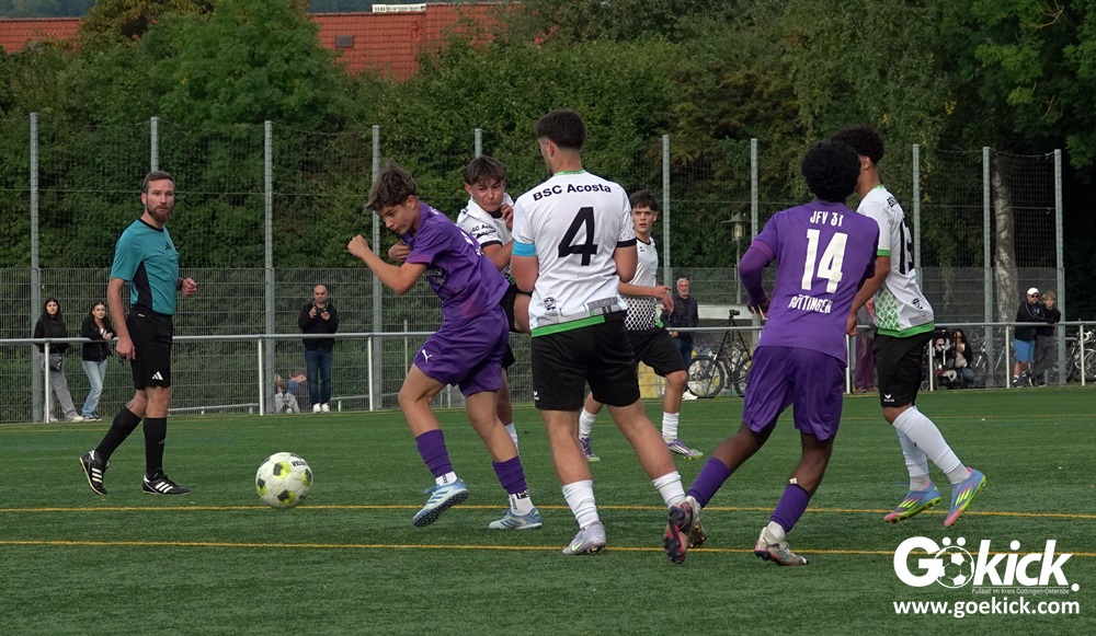 Die Göttinger, betreut vom Trainertrio Timo Ziegler, Michael Lorenz und Daniel Vollbrecht, gingen mit breiter Brust in die Partie. Doch nach einer halben Stunde sorgte Joshua Niemeyer für die kalte Dusche. Mit einem unwiderstehlichen Solo und einem präzisen Schuss mit dem Außenspann ins lange Eck brachte er Acosta in Führung. Kurz vor der Pause jedoch die Antwort des JFV: Gabriel Öztürk traf in der Nachspielzeit der ersten Hälfte zum 1:1 und brachte die Gastgeber zurück ins Spiel. Nach 42 Minuten beendete Schiedsrichter Philip Nordmann den ersten Durchgang.