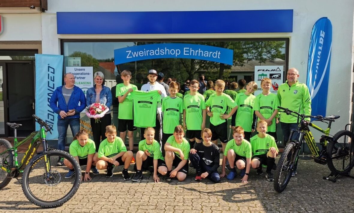 Große Überraschung für den jüngeren Jahrgang der D-Jugend beim JFV Rhume-Oder. Der Zweiradshop Ehrhardt aus Hattorf hat den jüngsten JFV-Kickern einen neuen Trikotsatz gesponsert. Erst vor kurzem hat der Zweiradshop Ehrhardt einen neuen Verkaufsraum in der Oderstraße 47 bezogen und hat ein großes Sortiment an Fahrrädern vorrätig. Die Mannschaft von Trainer Patrick Weidemann bekam das neuen Outfit auf dem Weg zum Auswärtsspiel bei der JSG HarzTor/Neuhof überreicht. Der JFV bedankte sich bei Inhaber Michael Ehrhardt mit einem Blumenstrauß für die tolle Unterstützung. Beflügelt von den neuen Trikots gewannen die JFVler ihr Spiel im Anschluss mit 4:3.