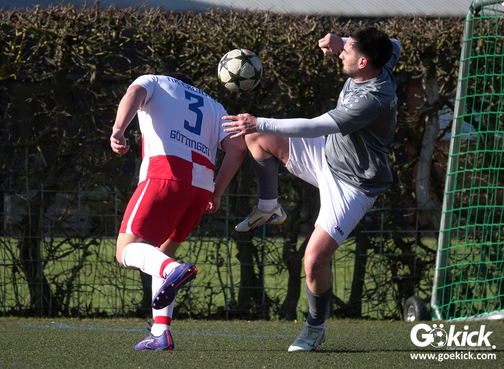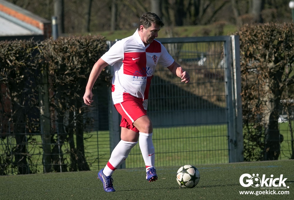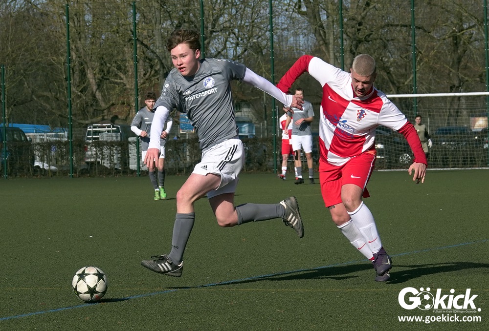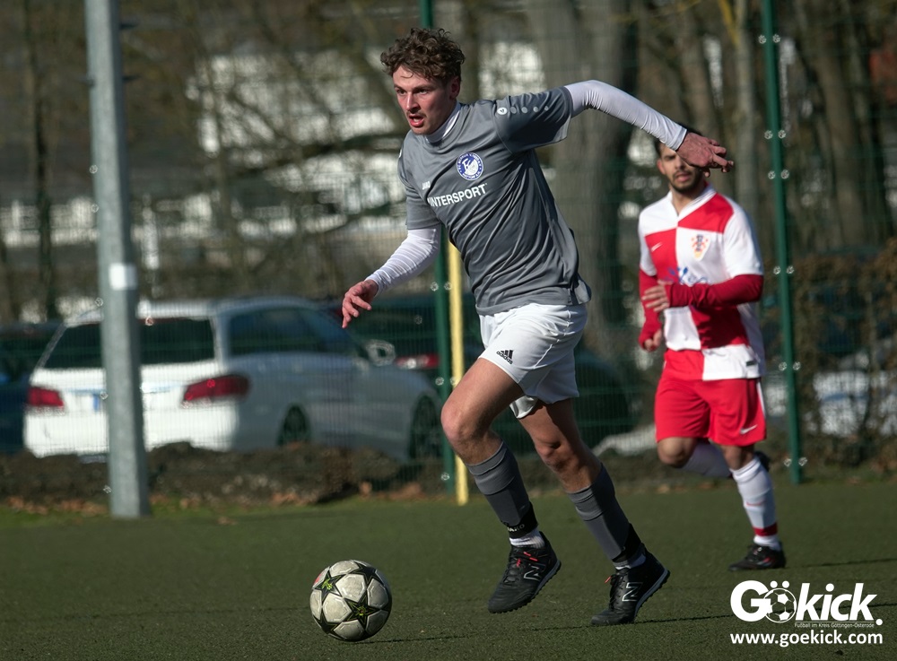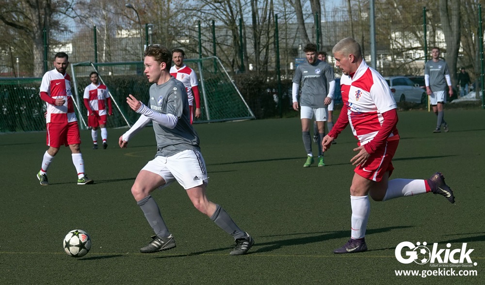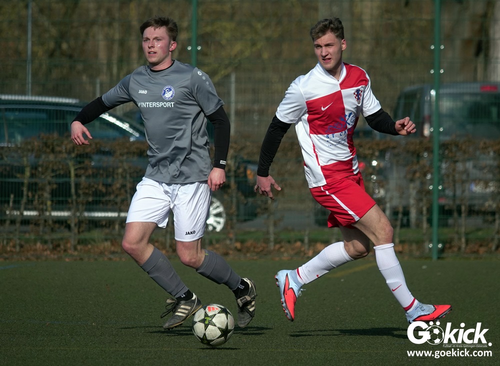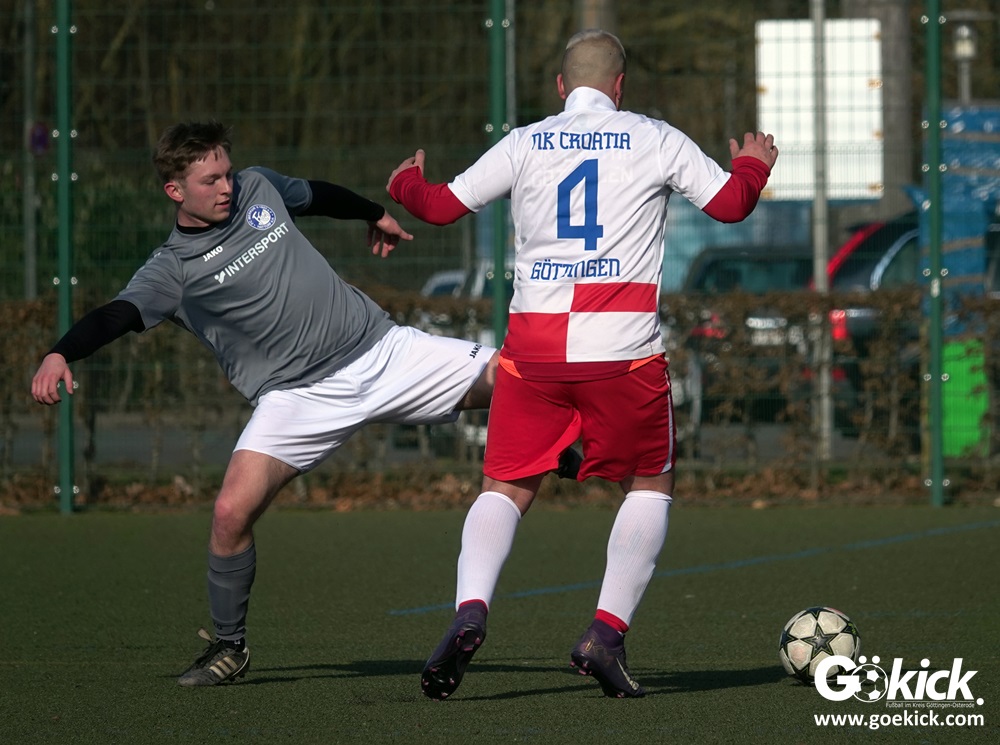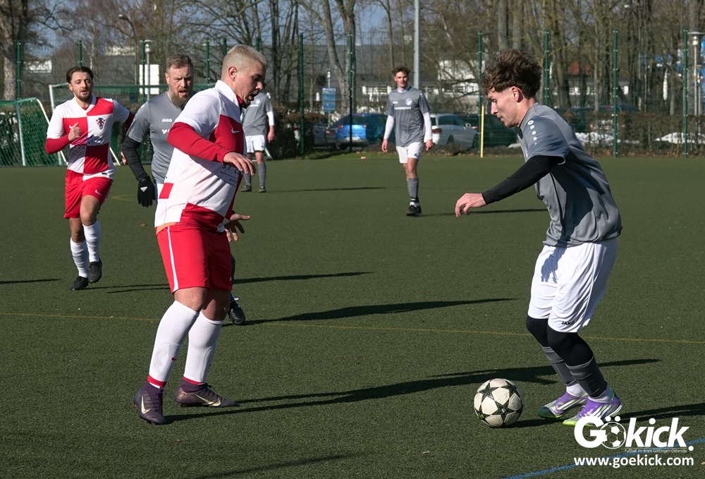 In der 18. Minute brachte Sullivan Mende die Gast-Mannschaft von Trainer Umut Ates mit 1:0 in Führung. NK Croatia Göttingen, betreut von Vjeko Juric, ließ sich davon jedoch nicht beeindrucken. In der 30. Minute erzielte Safat Berisha den Ausgleich. Der Neuzugang vom VfL 08 Herzberg traf sehenswert und deutete an, welches Potenzial er in die Offensive einbringen kann. Gemeinsam mit Torjäger Robert Zovko, der in der Hinrunde 17 Treffer erzielte, soll Berisha künftig für Torgefahr sorgen.