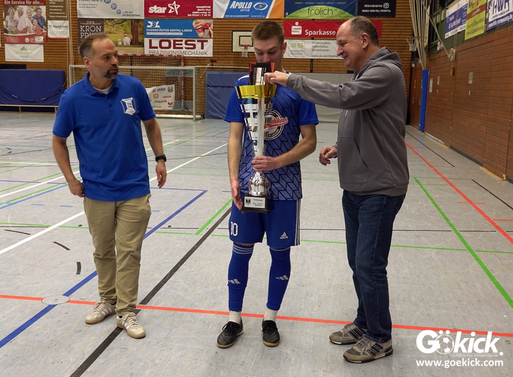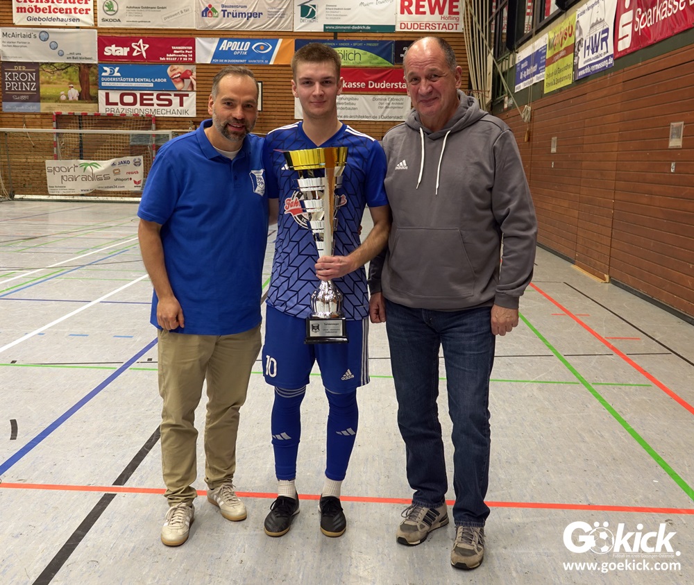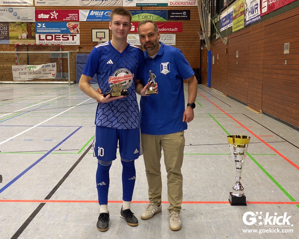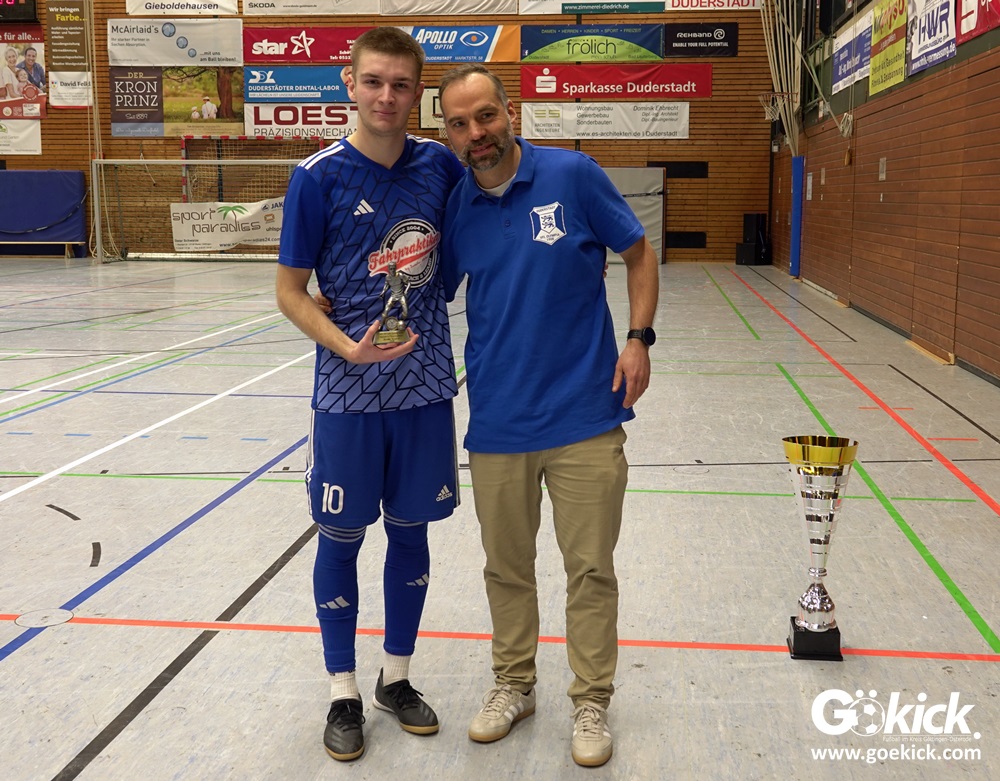 In den Finalspielen waren wir dann aber relativ souverän mit dem 1:0 gegen Brehme und dem 3:1 gegen Duderstadt. Wir hatten unsere Lehren aus der 0:4-Niederlage in der Vorrunde gegen Duderstadt gezogen und das Finale dann besser bestritten. Wir freuen uns sehr, dass wir das Turnier gewonnen haben. Wir haben natürlich mit Nico Kerbs, der in Duderstadt als bester Torschütze und als bester Spieler des Turniers ausgezeichnet wurde, eine doppelte Einzelauszeichnung erhalten. Meines Erachtens ist dies auch absolut verdient. Er ist ein guter Fußballer und hat sein Können in der Halle in Duderstadt auf jeden Fall überzeugt präsentiert, um es mal so zu sagen.“