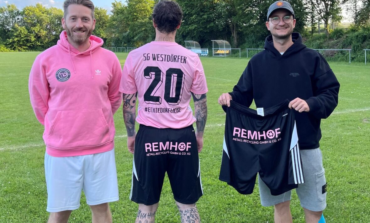 Firma Remhof Metall-Recycling aus Eschwege wirbt in Zukunft auf den Hosen der neuen SG, Geschäftsführer David Rochlitz übergab die schicken Modelle in schwarz-rosa in der vergangenen Woche an den Club.