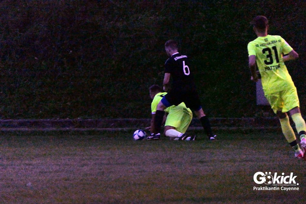 Doch zuerst einmal geriet der große Favorit in Rückstand: Sönke Blanke traf bereits nach sechs Minuten zur Führung der Gastgeber. Er konnte sich drehen und schloss, bevor die Viererkette der SGN entscheidend stören konnte, sehenswert ab. Anschließend entwickelte sich ein kampfbetontes Spiel, in dem der spielerisch bessere Gast die physische Kraft der Heimelf überwinden musste. Mit zunehmender Spieldauer wurde der Gast immer überlegener, doch der Ausgleich wollte, trotz eines Chancenplus nicht fallen. Dies gelang erst kurz vor dem Seitenwechsel Niedernjesas Jan Kuhlemeier, der in der 44. Minute den längst fälligen Ausgleich erzielte.